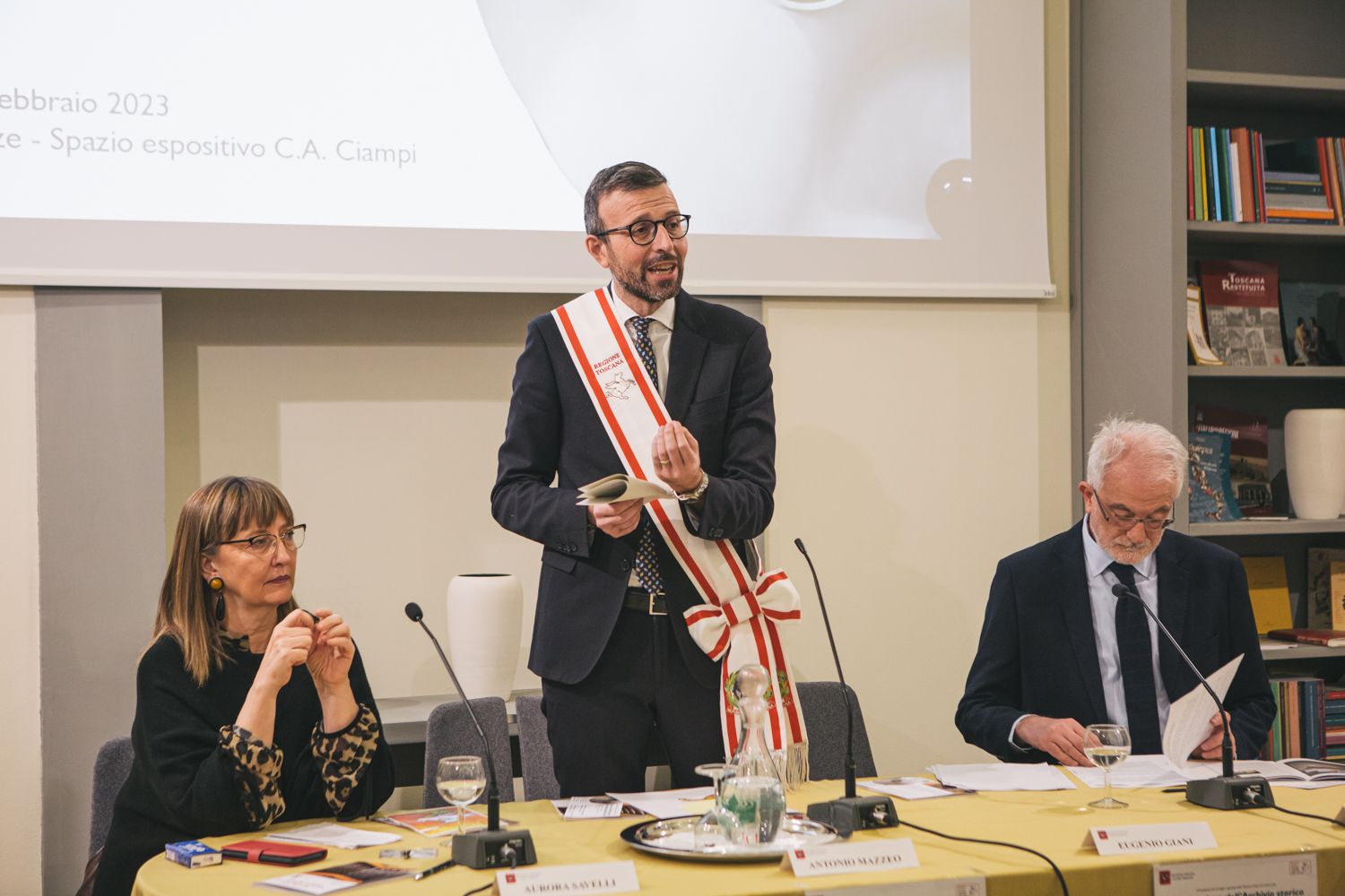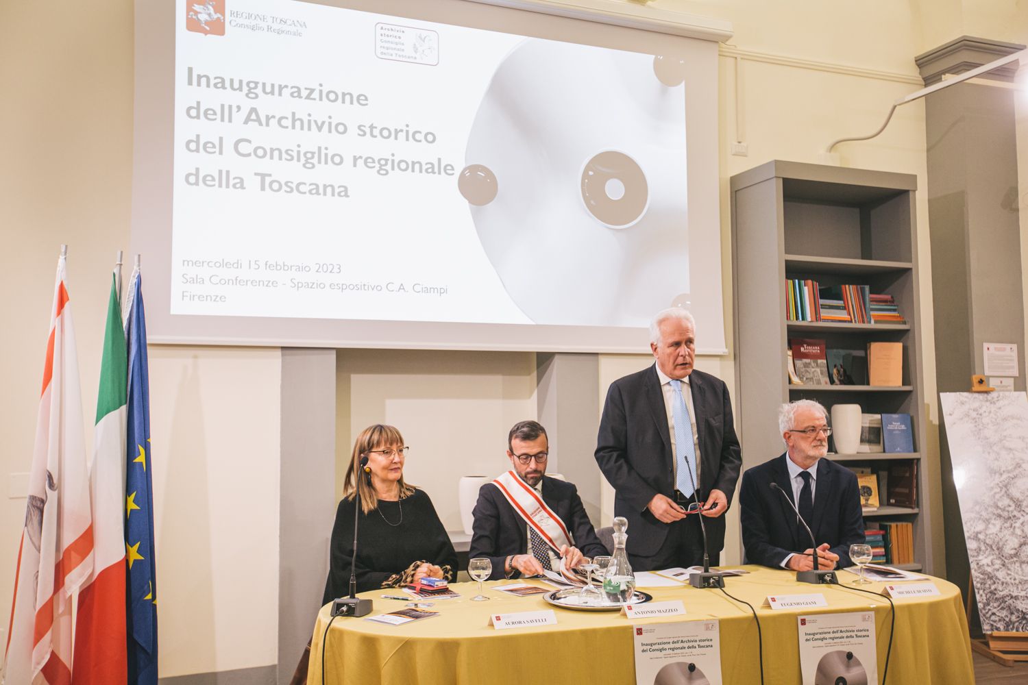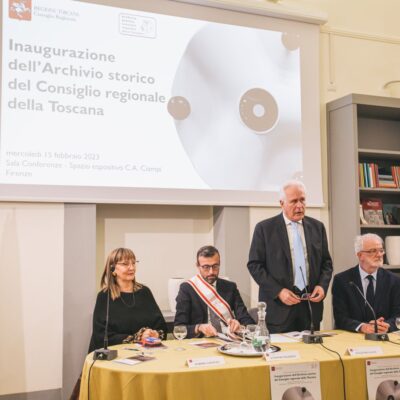 Prima del taglio del nastro all’ingresso dei locali dell’Archivio storico, nel cortile dove ha sede il Consiglio regionale, si è svolto un momento di riflessione e confronto presso la sala conferenze dello spazio Carlo Azeglio Ciampi in via dei Pucci 16. Sono intervenuti il presidente del Consiglio regionale Antonio Mazzeo, il presidente della Regione Eugenio Giani. A seguire gli interventi di Michele Di Sivo, Soprintendenza archivistica e bibliografica della Toscana, e di Aurora Savelli, Università di Napoli L’Orientale. Tra i presenti anche due ex presidenti della Regione Claudio Martini (dal 2000 al 2010) e Vannino Chiti (dal 1992 al 2000), che hanno rivolto parole di apprezzamento per l’iniziativa, e Angelo Passaleva già presidente del Consiglio regionale.