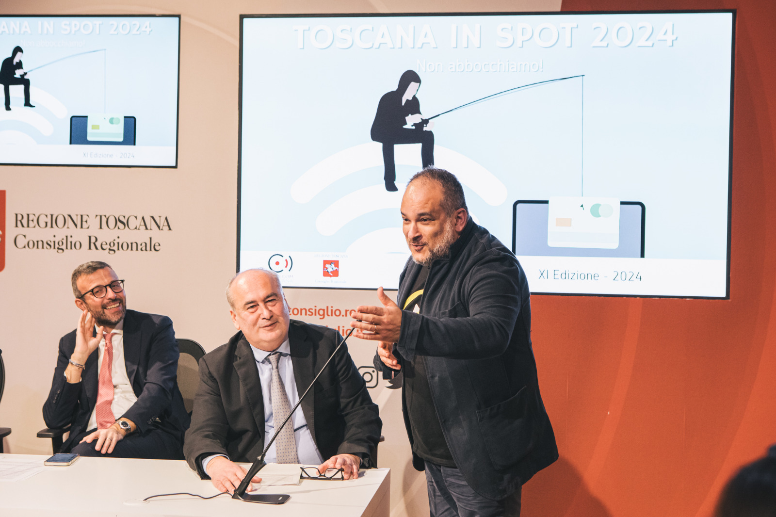 Toscana in Spot. Dopo il vincitore Daniele Bonarini, il cui spot ‘Gratis’ è stato riconosciuto come il migliore per la “regia pulita e diretta” e perché “il messaggio attraverso lo slogan è davvero chiaro e si rivolge non solo agli anziani, ma grazie all’umorismo anche ad un pubblico giovane”, il secondo premio di ‘Toscana in spot’ è andato allo spot ‘Pesce Balla’, di Matteo Corsi, “claim particolarmente efficace”, che parla a un pubblico di ogni età, “la regia è molto artigianale ma il messaggio è ben veicolato”. Il terzo premio è andato allo spot ‘Della truffa fanne fuffa’ di Lorenzo Maiani: “la qualità dello spot è alta grazie a una regia fresca e ad un’interpretazione accattivante, e attrae l’attenzione veicolando un messaggio chiaro”, si legge nella motivazione.