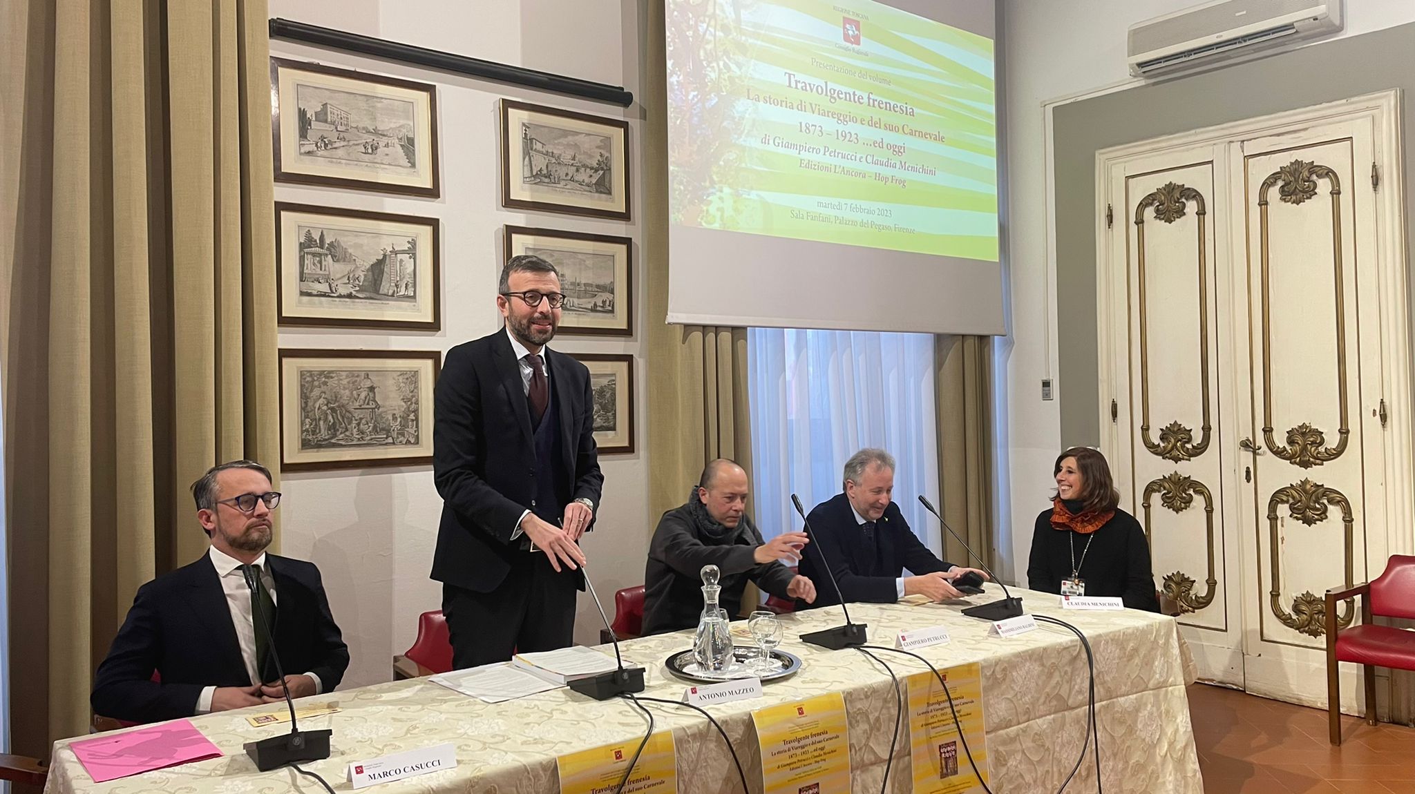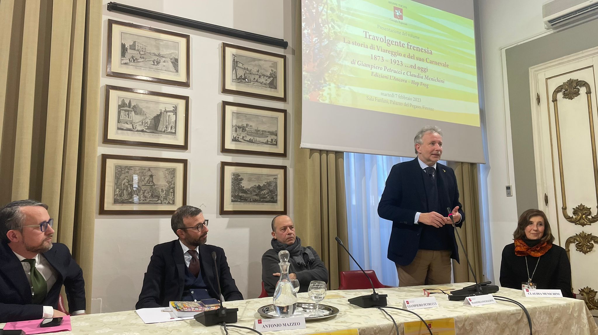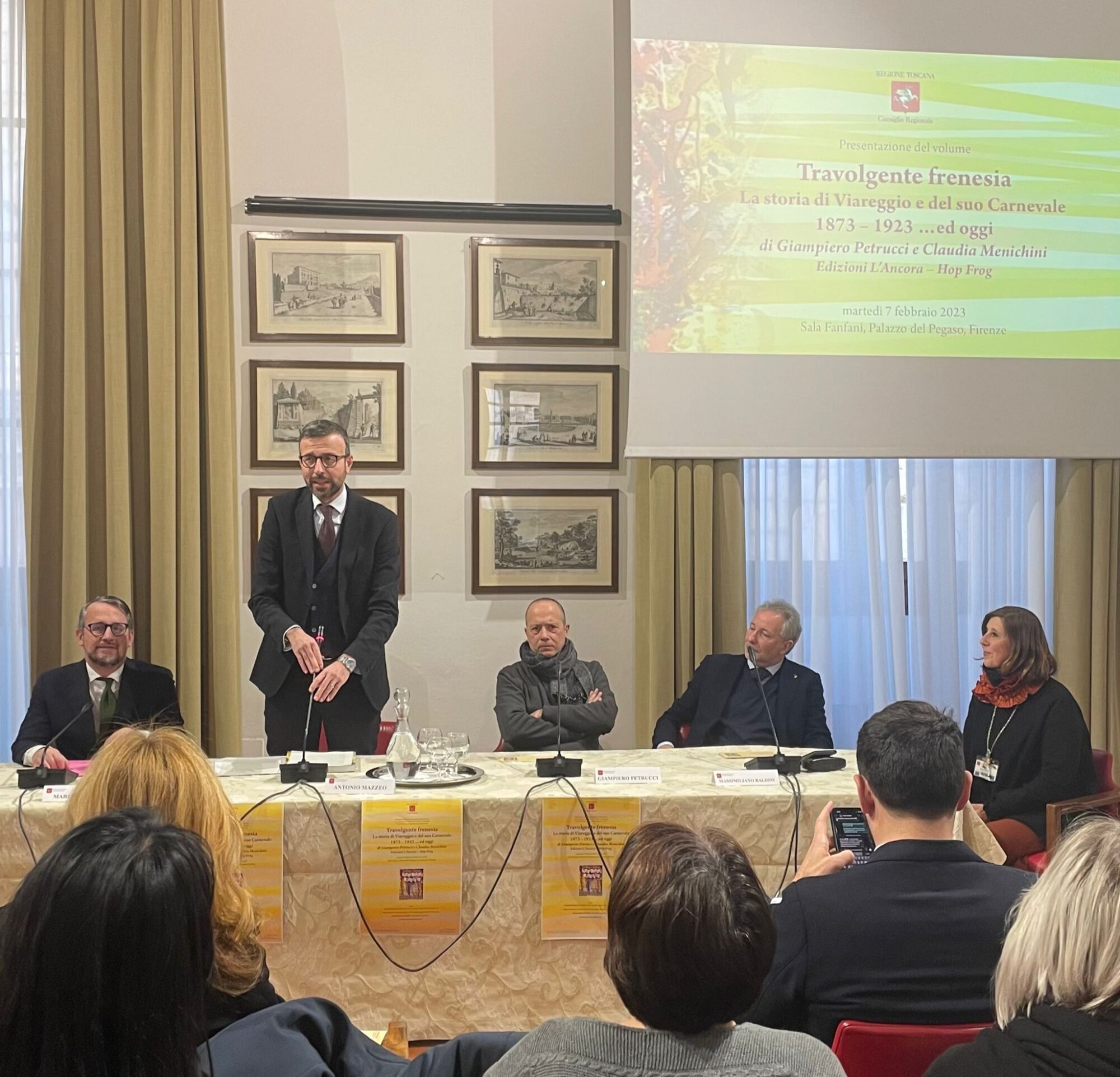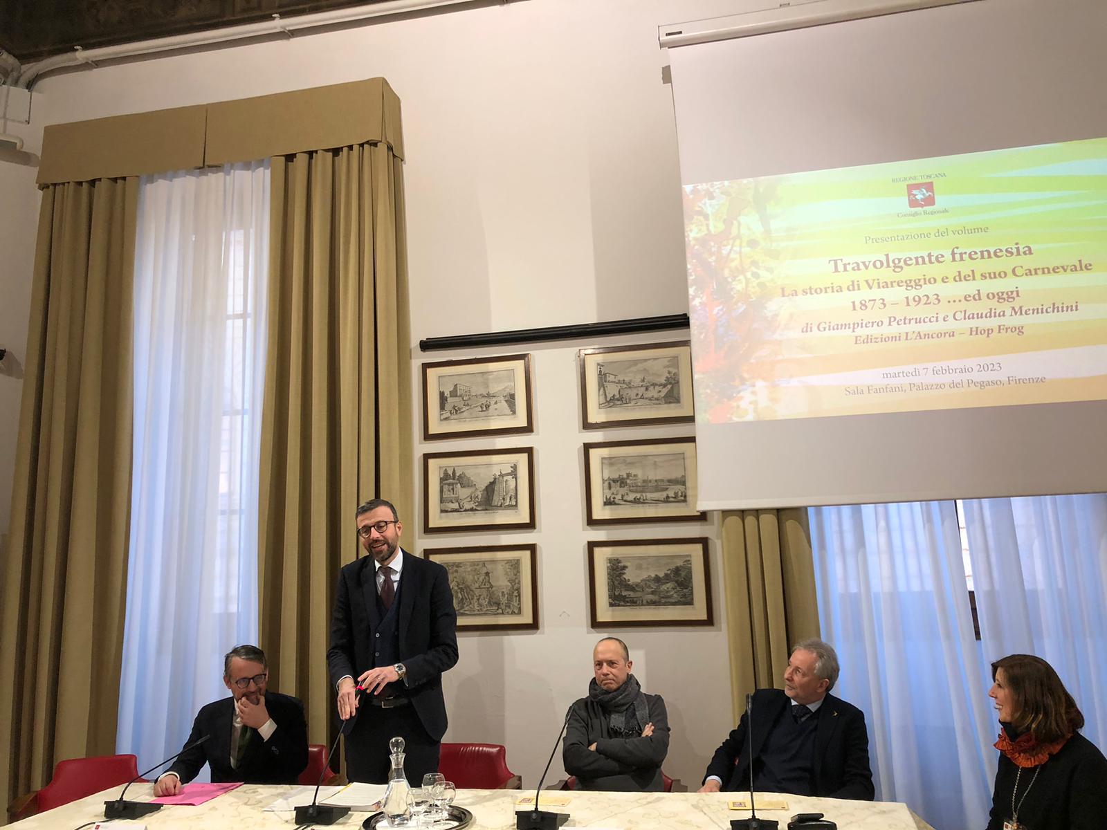 Firenze – È stato presentato nella sala Fanfani a palazzo del Pegaso il volume “Travolgente frenesia. La storia di Viareggio e del suo Carnevale dal 1873 al 1923 ed oggi” di Giampiero Petrucci e Claudia Menichini. Nel libro si parla della simbiosi, che dura da oltre 150 anni, tra Viareggio e il suo Carnevale. Nelle pagine si ripercorre la storia viareggina dal 1873 al 1923, nei primi 50 anni di vita ufficiale del Carnevale, attraverso innumerevoli notizie, avvenimenti e personaggi di ogni genere, con un salto in avanti sino ai giorni nostri. Dalla cronaca locale si passa alla storia mondiale, dall’arte si spazia alla musica, dalla medicina allo sport, dalla religione alla politica, dalla guerra al fascismo, dal cinema fino alla letteratura. Alla presentazione sono intervenuti, oltre agli autori, il presidente e il vicepresidente dell’Assemblea legislativa toscana Antonio Mazzeo e Marco Casucci, il consigliere regionale Massimiliano Baldini, Beatrice Taccola della Fondazione Carnevale.