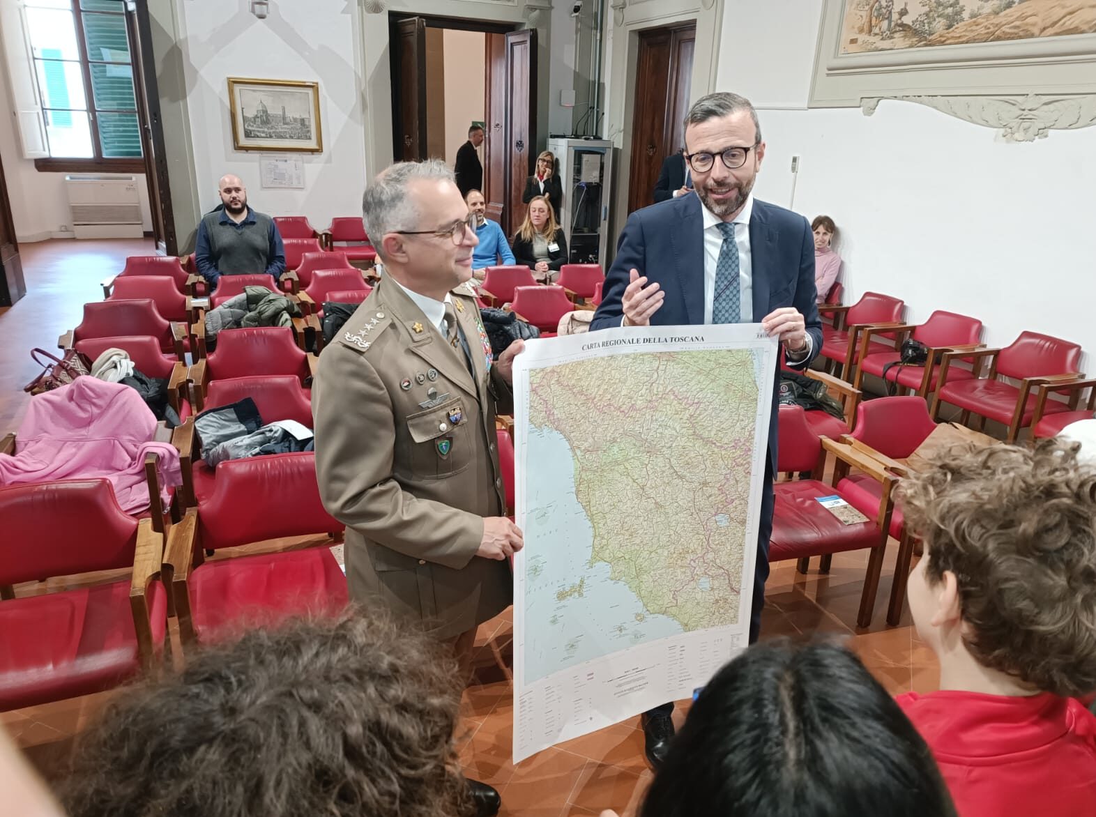 Il presidente Mazzeo ha consegnato ai ragazzi presenti in sala Gonfalone la carta geografica della Toscana. All’iniziativa era presente anche il consigliere regionale Gabriele Veneri.