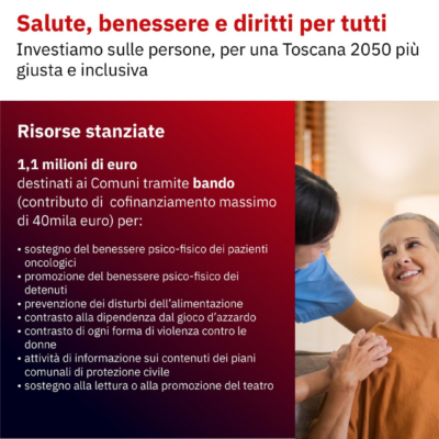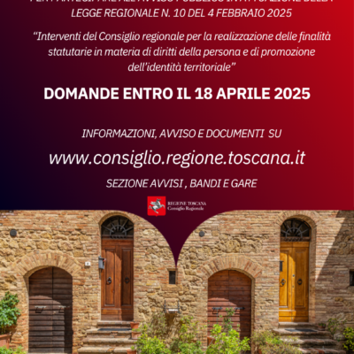“Il Consiglio regionale continua a dimostrare il proprio impegno concreto nel promuovere i diritti della persona e valorizzare l’identità territoriale” afferma il presidente Antonio Mazzeo, ricordando che le misure, anticipate lo scorso 6 febbraio in conferenza stampa insieme a tutti i membri dell’Ufficio di presidenza, “rientrano nell’obiettivo di costruire insieme la Toscana del 2050“. “Attraverso questo bando torniamo ad offrire ai Comuni, come già fatto negli anni scorsi, la possibilità di sostenere e sviluppare i loro progetti e stavolta lo facciamo su tematiche che ci stanno particolarmente a cuore – prosegue – dal contrasto alla violenza di genere alla lotta alle dipendenze, dal benessere psicofisico dei pazienti oncologici e dei detenuti alla prevenzione dei disturbi alimentari fino alla promozione della lettura e del teatro. Le iniziative riflettono i valori fondamentali della nostra Regione e puntano a costruire una Toscana sempre più inclusiva, solidale e attenta ai bisogni di chi è più in difficoltà”.