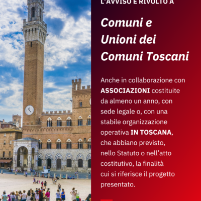 I Comuni possono presentare il proprio progetto anche in collaborazione con associazioni, costituite da almeno un anno, con sede legale o con una stabile organizzazione operativa in Toscana e che abbiano previsto nello statuto o nell’atto costitutivo la finalità cui si riferisce il progetto.