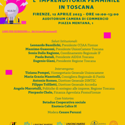L’iniziativa è stata presentata in conferenza stampa, questa mattina, giovedì 6 aprile, a palazzo del Pegaso. All’incontro con i giornalisti sono intervenuti il presidente del Consiglio regionale, Antonio Mazzeo, la presidente della commissione Sviluppo economico, Ilaria Bugetti, la consigliera regionale Elena Rosignoli, la presidente della commissione regionale pari opportunità Francesca Basanieri, con Sonia Dalla Ragione del coordinamento regionale IF, Massimo Guasconi, presidente di UnionCamere Toscana e Paola Butali, presidente di Aidda Toscana.