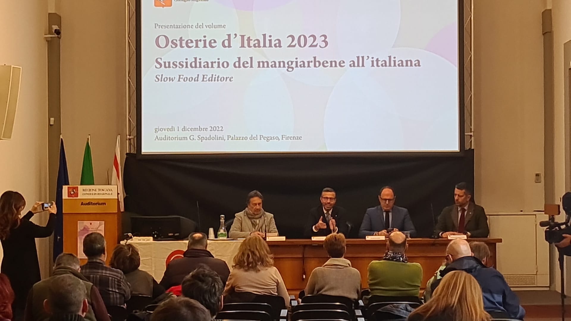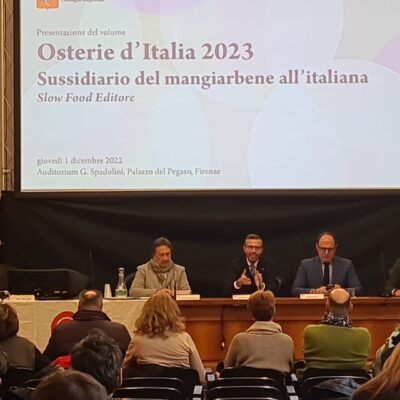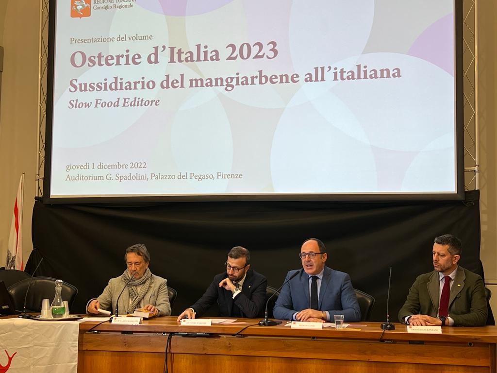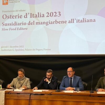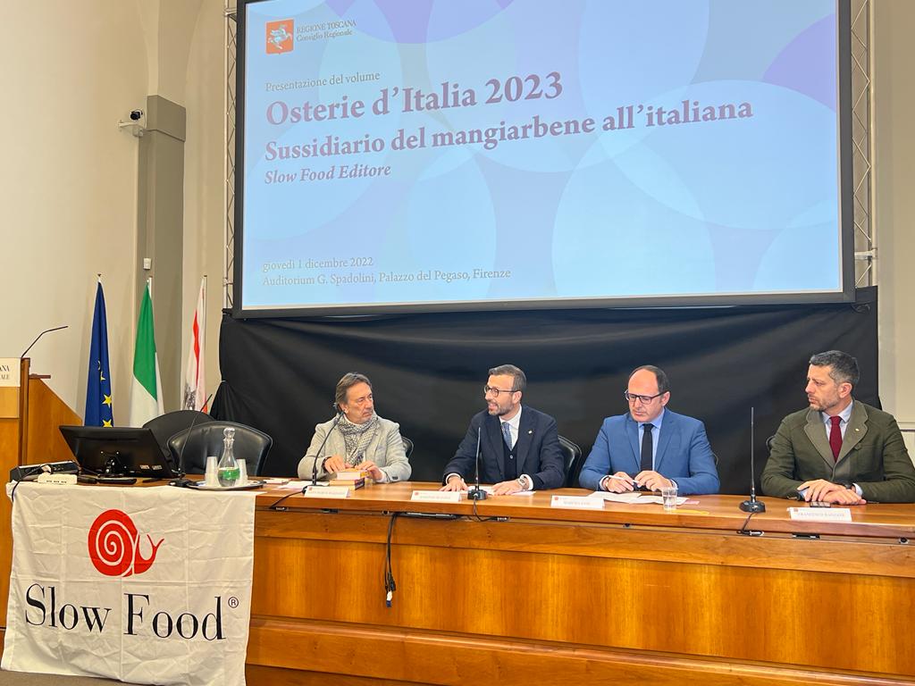 Firenze – Il sussidiario di slow food ‘Osterie d’Italia 2023’ premia la Toscana come protagonista tra le mete più interessanti dell’enogastronomia d’Italia. Nella 33esima edizione presentata stamani, giovedì 1 dicembre, in palazzo del Pegaso le ormai famose ‘chiocciole’ che slow food assegna come tratto distintivo di convivialità e scoperta del territorio premiano la nostra regione con: ‘Nonno Cianco’ di Abetone Cutigliano (Pistoia), l’ ‘Osteria dell’Enoteca’ di Firenze; ‘Azzighe – Osteria a metà’ di Livorno, ‘La Ciottolona’ di Montieri (Grosseto), ‘La botteGaia’ di Pistoia, ‘La casa del buono’ di Terranuova Bracciolini (Arezzo).