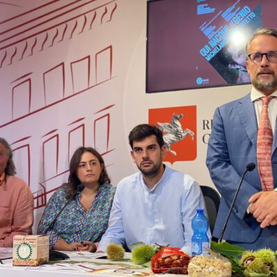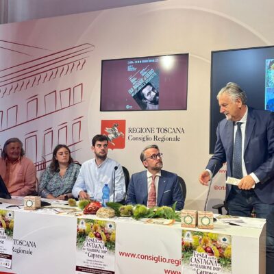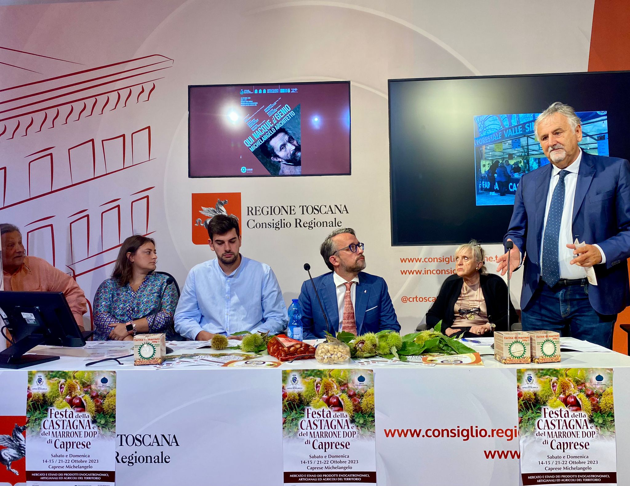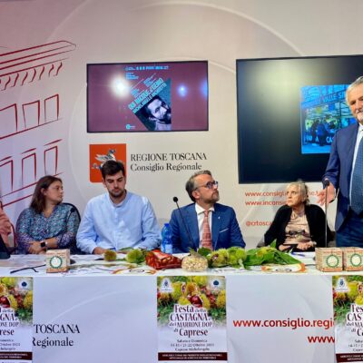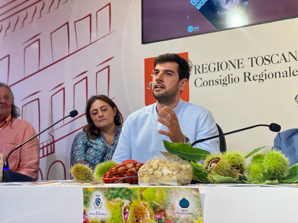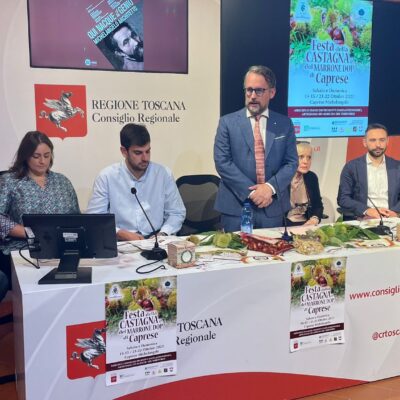 Firenze – In una conferenza stampa al Media Center Sassoli al palazzo del Pegaso è stata presentata la tradizionale Festa della Castagna che si svolge a Caprese Michelangelo (AR) nei weekend di ottobre del 14 e 15, del 21 e 22 ottobre.  A illustrare l’iniziativa insieme al vicepresidente dell’Assemblea toscana, Marco Casucci e al consigliere regionale Vincenzo Ceccarelli sono intervenuti il sindaco di Caprese Marida Brogialdi, il vicesindaco Paolo Acquisti ed i consiglieri comunali Simone Palermo e Fabio Santioni. Erano presenti anche Gino Lazzeri e Maria Teresa Baroni presidente e membro del Comitato organizzatore. Durante la Festa della Castagna vengono allestiti stands gastronomici con piatti a base di Marroni, bancarelle di prodotti tipici legati al territorio di Caprese Michelangelo quali miele, formaggio, birra agricola e tanto altro. Verranno organizzati laboratori per bambini e rievocazioni degli antichi mestieri.
