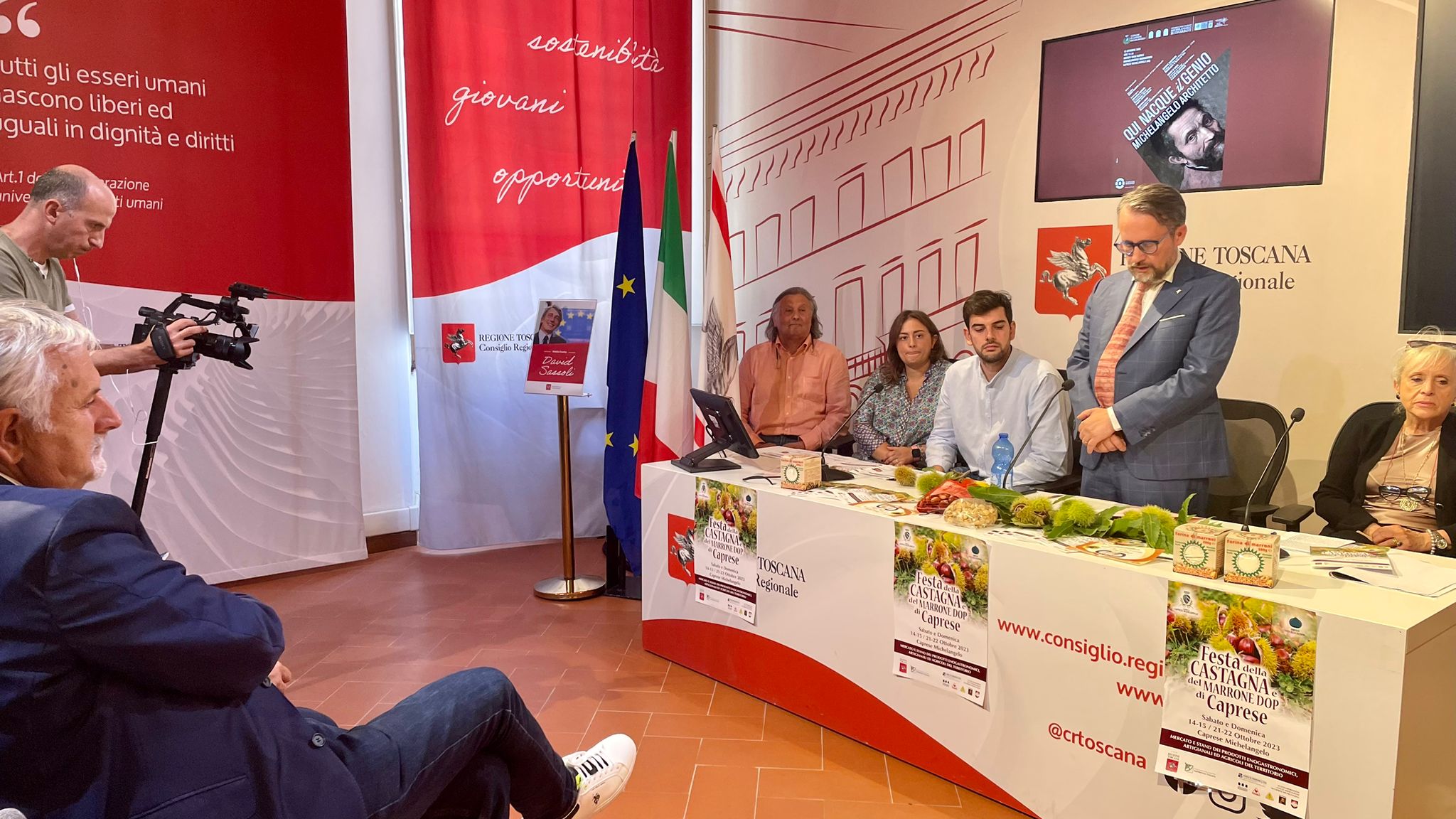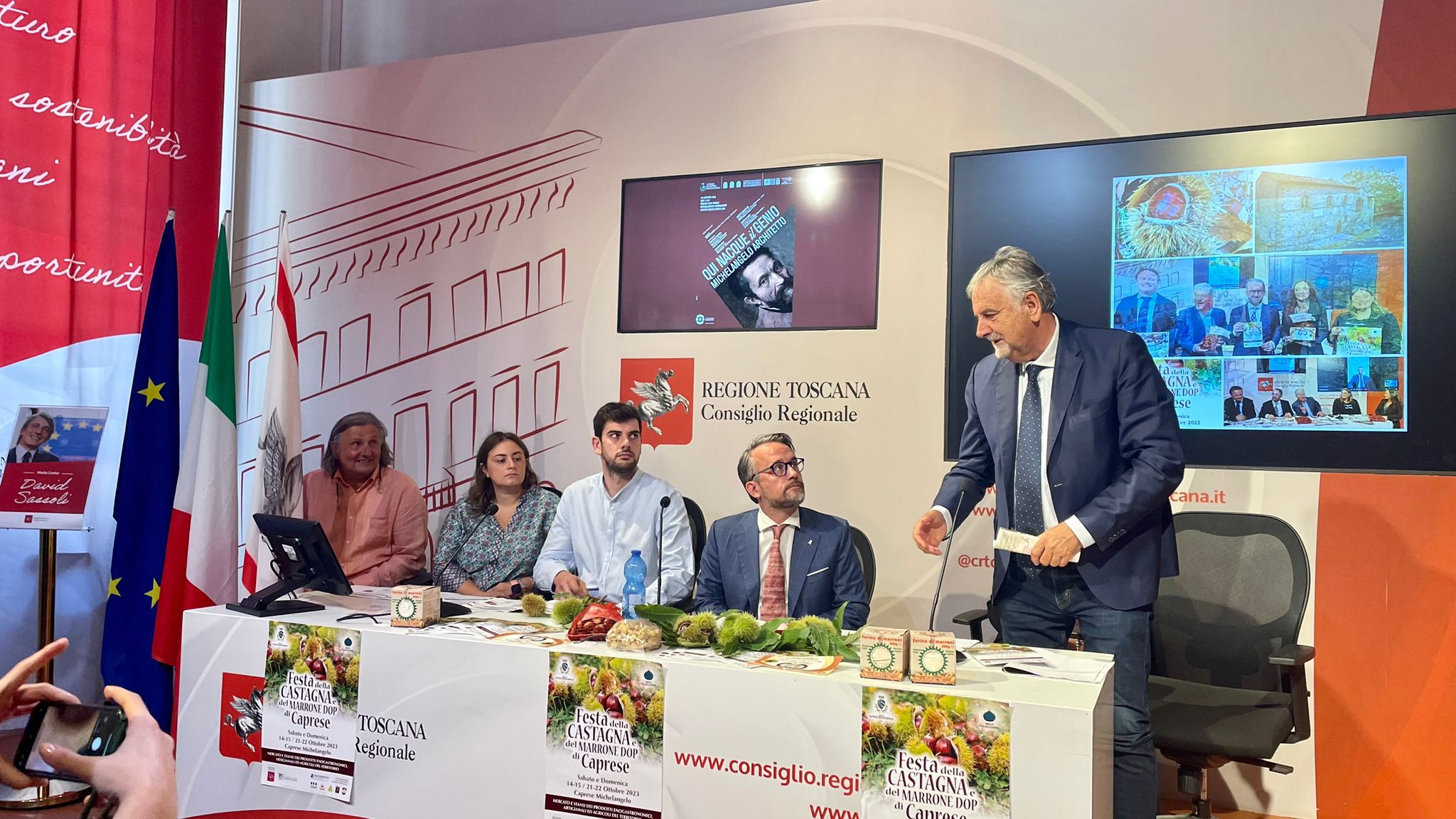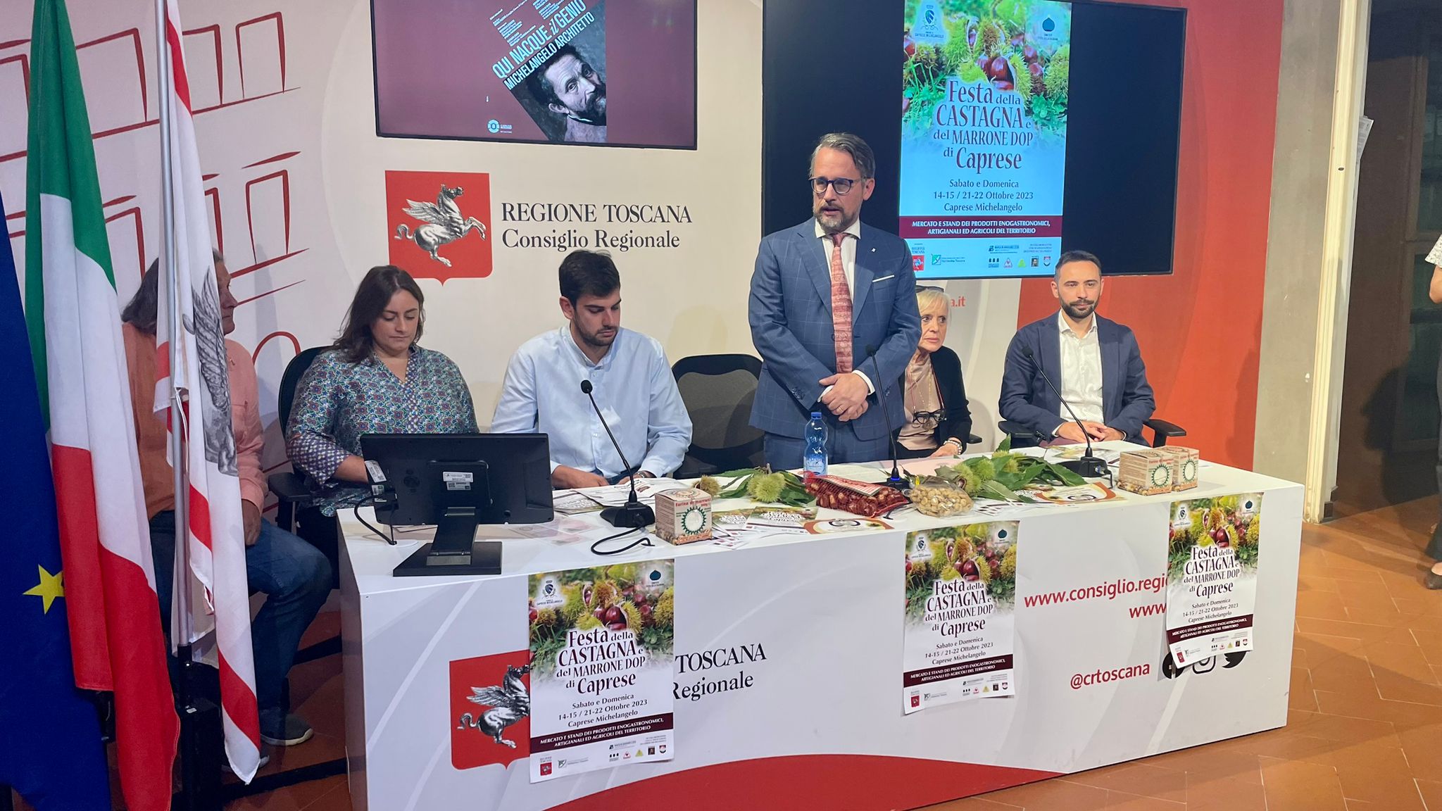 Firenze – In una conferenza stampa al Media Center Sassoli al palazzo del Pegaso è stata presentata la tradizionale Festa della Castagna che si svolge a Caprese Michelangelo (AR) nei weekend di ottobre del 14 e 15, del 21 e 22 ottobre.  A illustrare l’iniziativa insieme al vicepresidente dell’Assemblea toscana, Marco Casucci e al consigliere regionale Vincenzo Ceccarelli sono intervenuti il sindaco di Caprese Marida Brogialdi, il vicesindaco Paolo Acquisti ed i consiglieri comunali Simone Palermo e Fabio Santioni. Erano presenti anche Gino Lazzeri e Maria Teresa Baroni presidente e membro del Comitato organizzatore. Durante la Festa della Castagna vengono allestiti stands gastronomici con piatti a base di Marroni, bancarelle di prodotti tipici legati al territorio di Caprese Michelangelo quali miele, formaggio, birra agricola e tanto altro. Verranno organizzati laboratori per bambini e rievocazioni degli antichi mestieri.