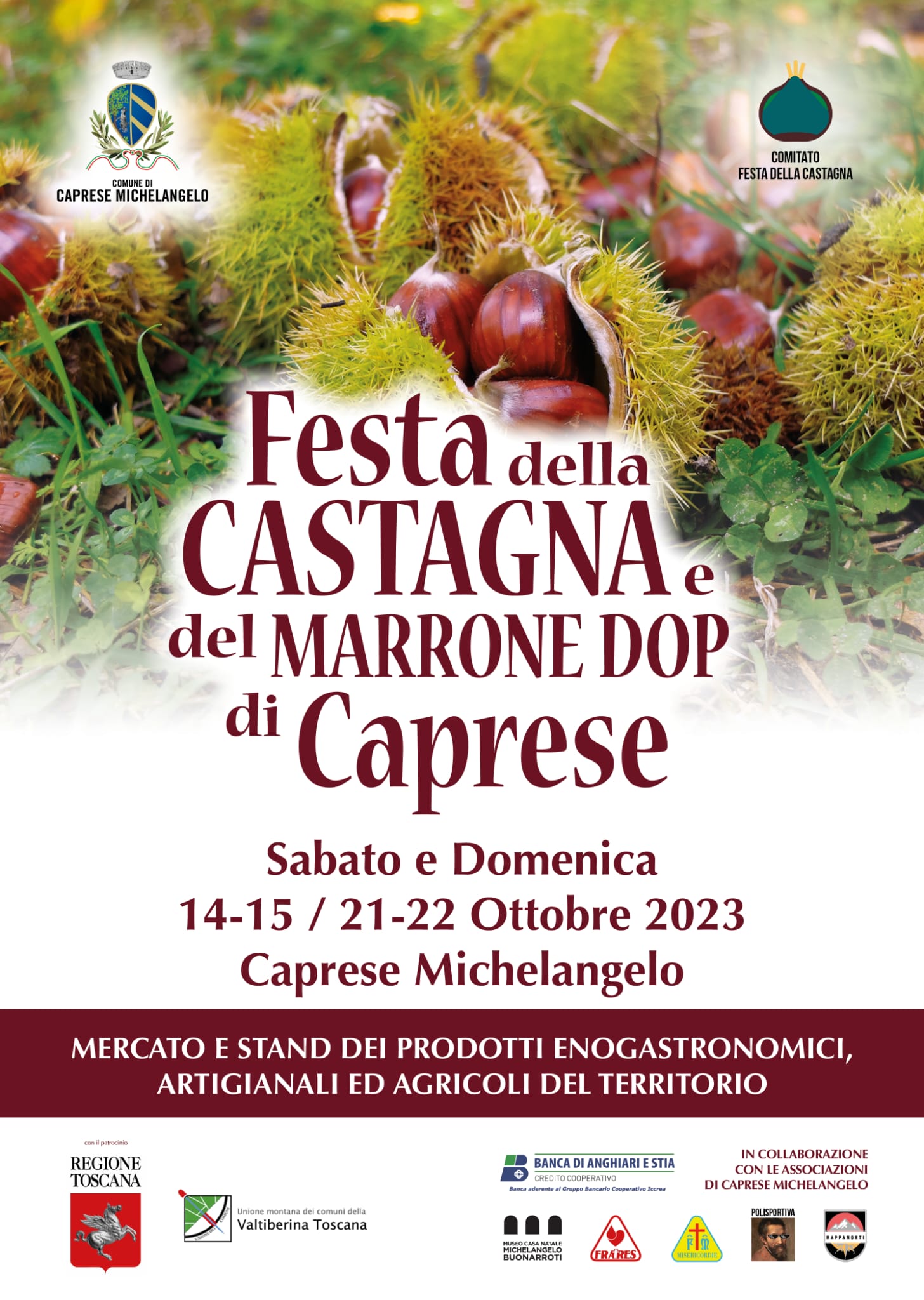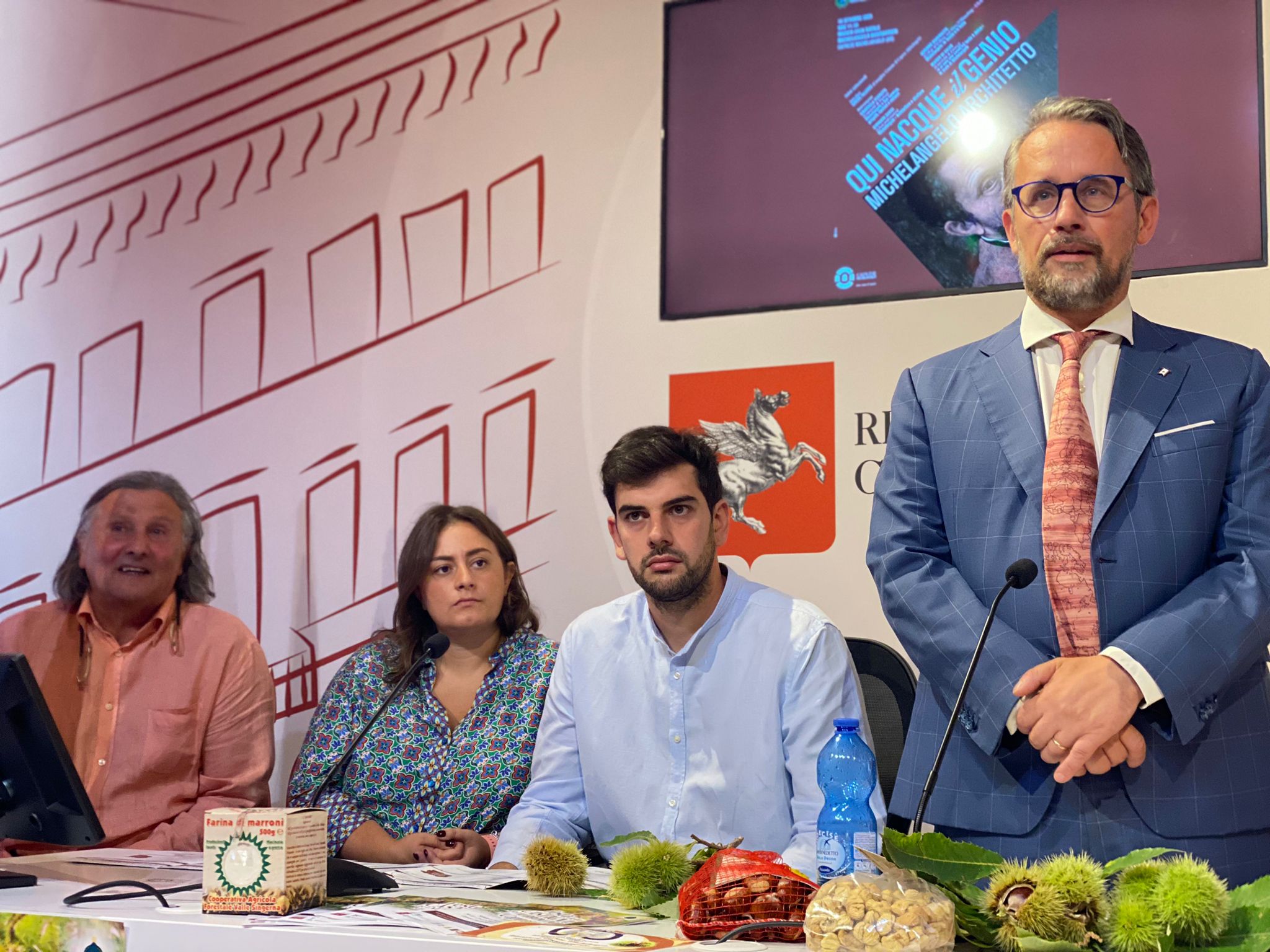 Presentato il tradizionale appuntamento con la castagna e il marrone dop che si svolge nei giorni del 14-15 e 21-22 ottobre. Sono intervenuti Marco Casucci vicepresidente del Consiglio regionale, Vincenzo Ceccarelli consigliere regionale, Marida Brogialdi sindaca di Caprese, Gino Lazzeri presidente del Comitato organizzatore. Nel corso della manifestazione anche una giornata di studio dedicata all’opera di Michelangelo Buonarroti