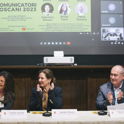 “Vorrei ringraziare il Corecom per aver scelto come comunicatori dell’anno toscani – ha detto Antonio Mazzeo presidente del Consiglio regionale – i nostri inviati di guerra, che svolgono un lavoro unico e riescono a raccontarci quello che accade lontano da noi e in luoghi dove la violenza sta nella vita di ogni giorno. Attraverso le loro parole riescono a costruire spazi di verità e dobbiamo comprendere che ogni guerra porta con sé violenza, morte e soprusi. Dico sempre ai ragazzi più giovani di non essere mai indifferenti e di cercare di capire cosa accade in questi territori più fragili. Grazie ai giornalisti che fanno questo lavoro difficile, mettendo a rischio la propria vita al servizio della verità e della libertà.”
