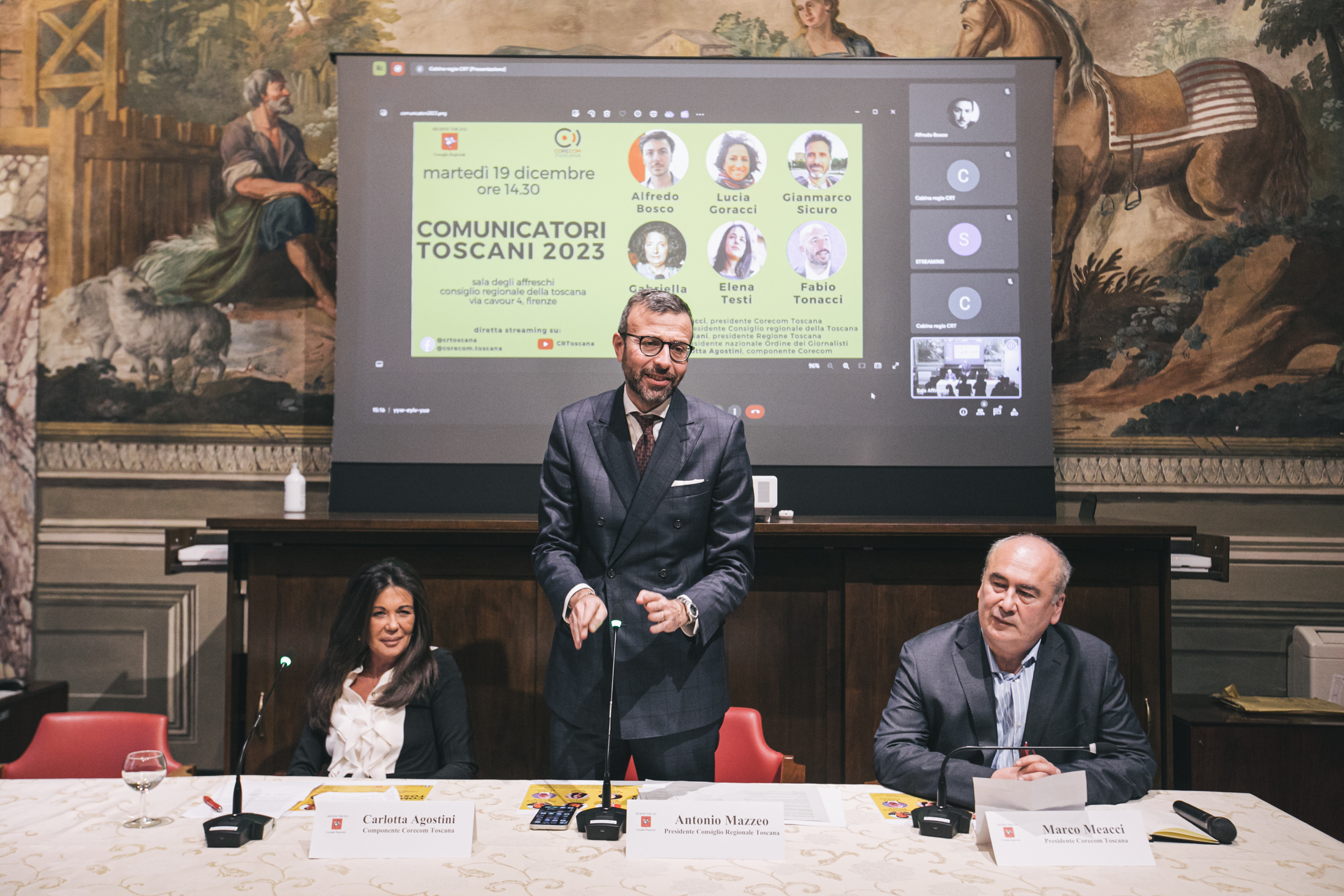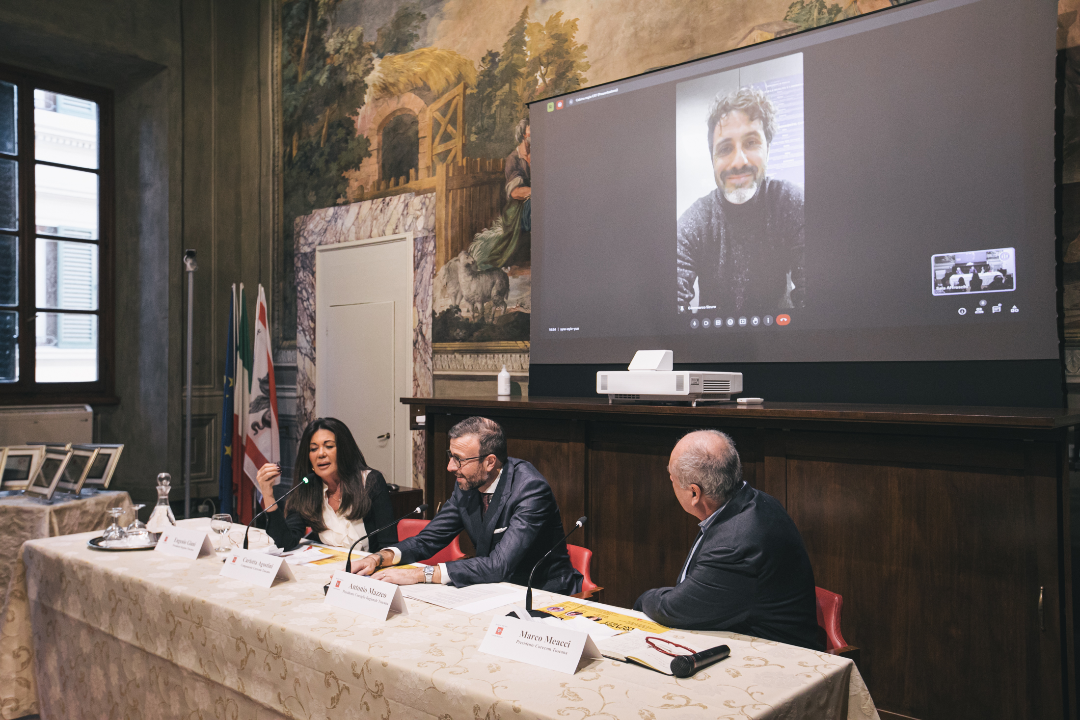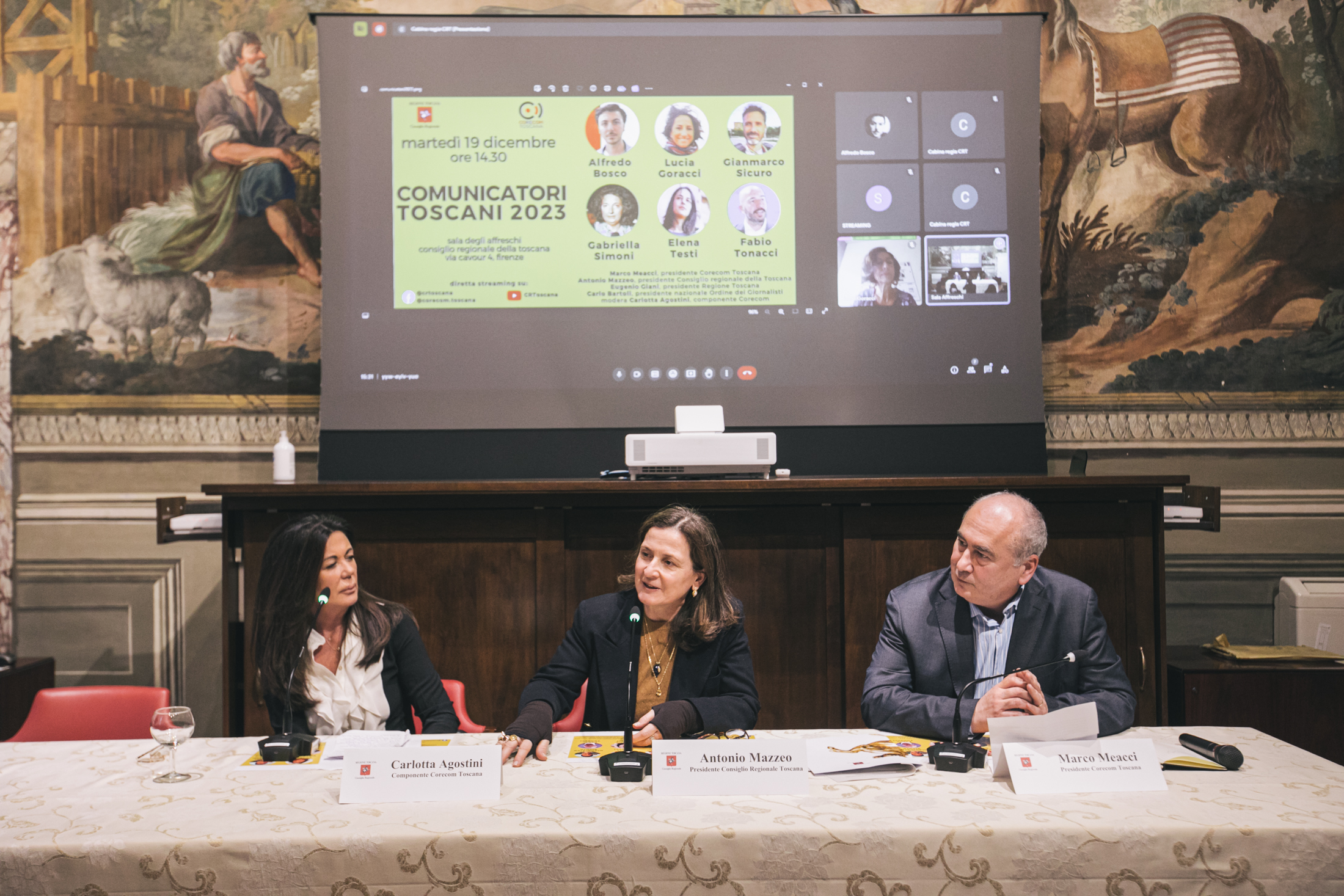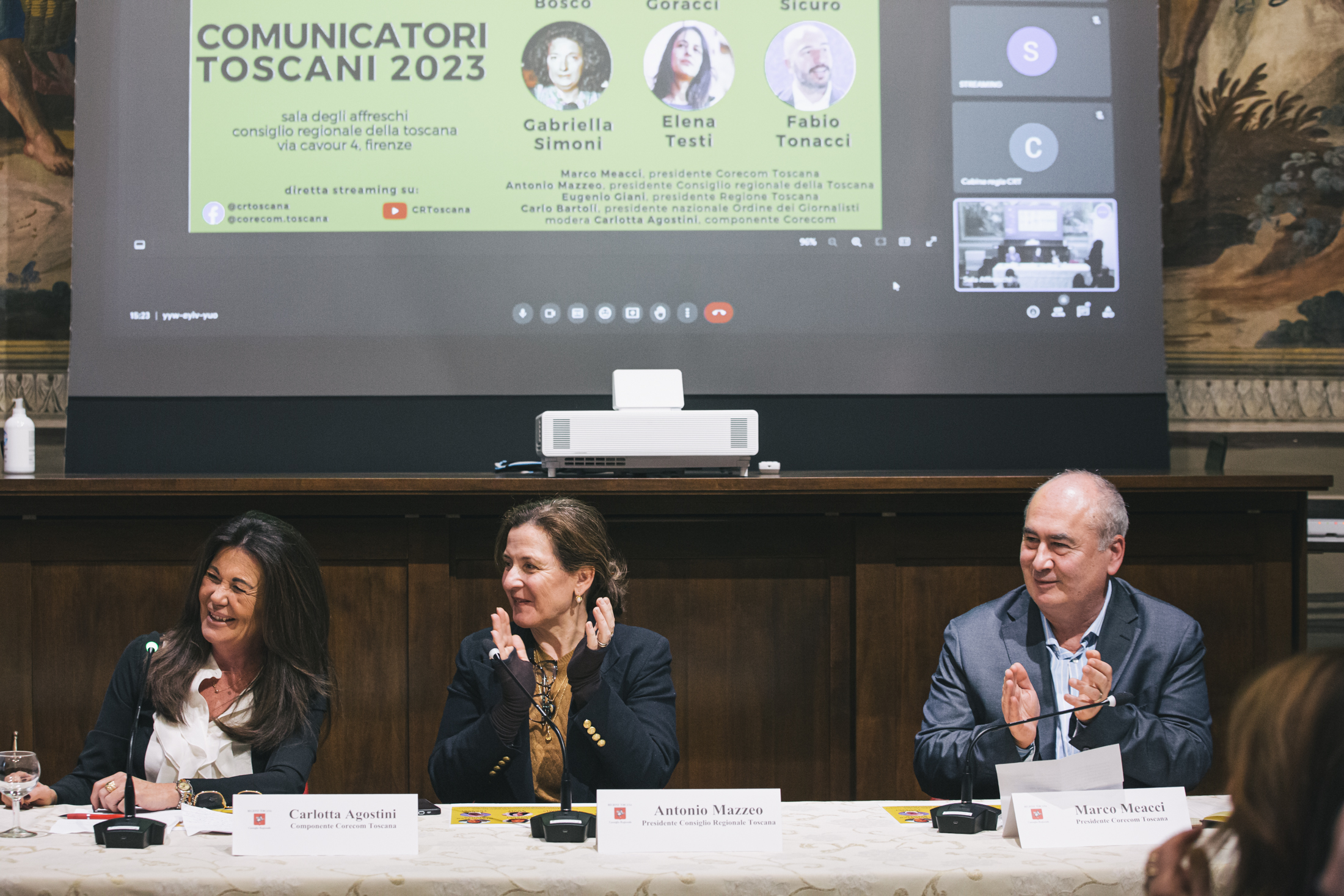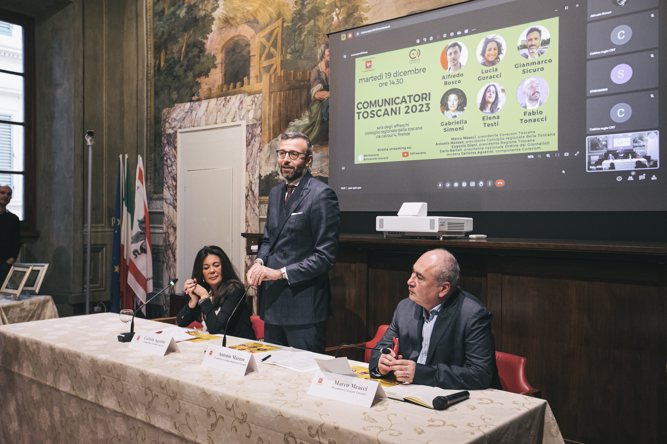 Alla cerimonia sono intervenuti Antonio Mazzeo, presidente del Consiglio regionale, Cristina Giachi, presidente della Commissione Cultura, Marco Meacci, presidente del Corecom