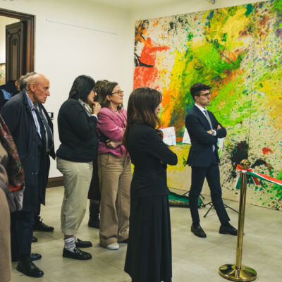 “C’è da farsi una domanda – ha detto il prof. Pasquale Giuseppe Macrì – che senso hanno queste macchie di colore? Shimamoto e il gruppo Gutai hanno cercato nel mondo della non forma, nel mondo contemporaneo un nuovo concetto di bello e di armonia che fosse coniugabile con la fisica moderna che pensa che l’universo non sia armonico, ma sia in esplosione. L’artista giapponese usa la tecnica dell’esplosione che dà un senso all’opera, quello di trovare la bellezza non nell’ordine, ma nel caos. Anche dentro di noi spesso i momenti più belli non sono quelli ordinari e quotidiani, ma quelli che il caos ci porta a vivere delle passioni forti.”