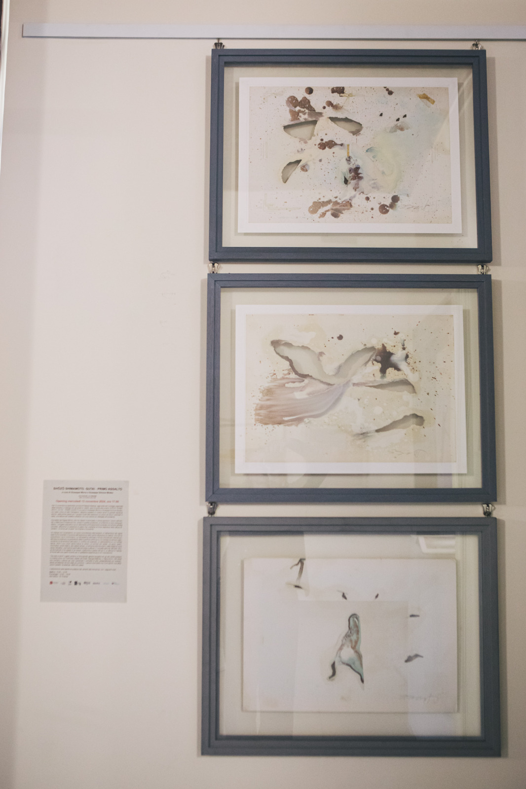 “Accostiamoci quindi alle opere di questi artisti che da un mondo lontano – dice il critico e curatore Giuseppe Simone Modeo – portano oggi la loro arte nella Città di una diversa concretezza, fatta di massa e di misura e da qui indicano la strada della indeterminatezza, della leggerezza, del caos “cosmetizzato” da una profonda spiritualità. Quanta gioia avrebbero ancora provato questi artisti proprio per questa mostra, a Firenze, nella città del Brunelleschi che sì, forse, avrebbero inviso tanto quanto e forse più che Piet Mondrian! Come il pittore olandese, infatti, il nostro grande architetto riteneva di poter misurare, contenere, coprire tutto. Per tutto poteva esserci una forma ed il Tutto avrebbe potuto essere, dalla forza creativa dell’artista, assoggettato al disegno umano. La Firenze del ‘400, come l’Amsterdam della prima metà del Novecento, rappresenta il momento di generativa antitesi dell’estetica Gutai. Firenze ricorda il punto in cui l’arte diventa per secoli sapienza occidentale ma è anche la città, e questo sarebbe piaciuto ai nostri giapponesi, in cui tramonta l’arte e l’astrazione bizantina in nome di una nuova concretezza. Ecco, è questa la mia confessione e comunione di gioia nell’ammirare e nel narrare l’arte di Shimamoto e del suo gruppo: gioia che deriva dalla effrazione di ogni limite pittorico e dalla diffusione dello spirito, del senso, della percezione intellettuale in ognuno di noi.”