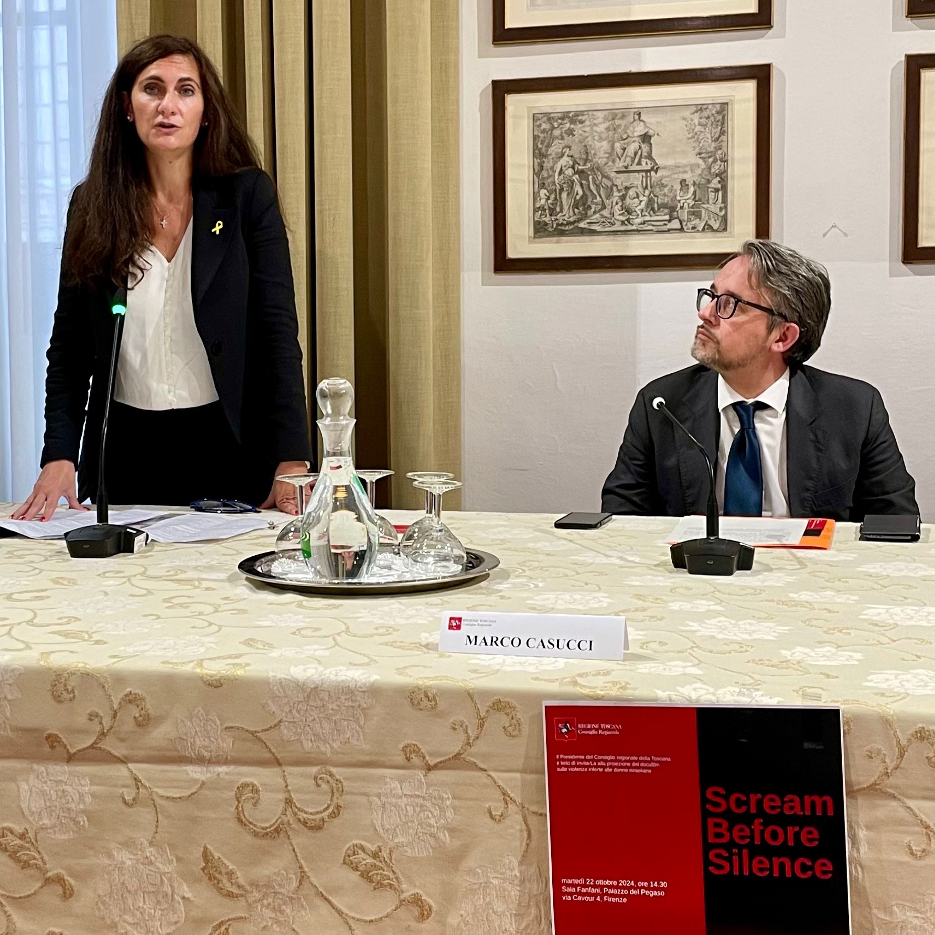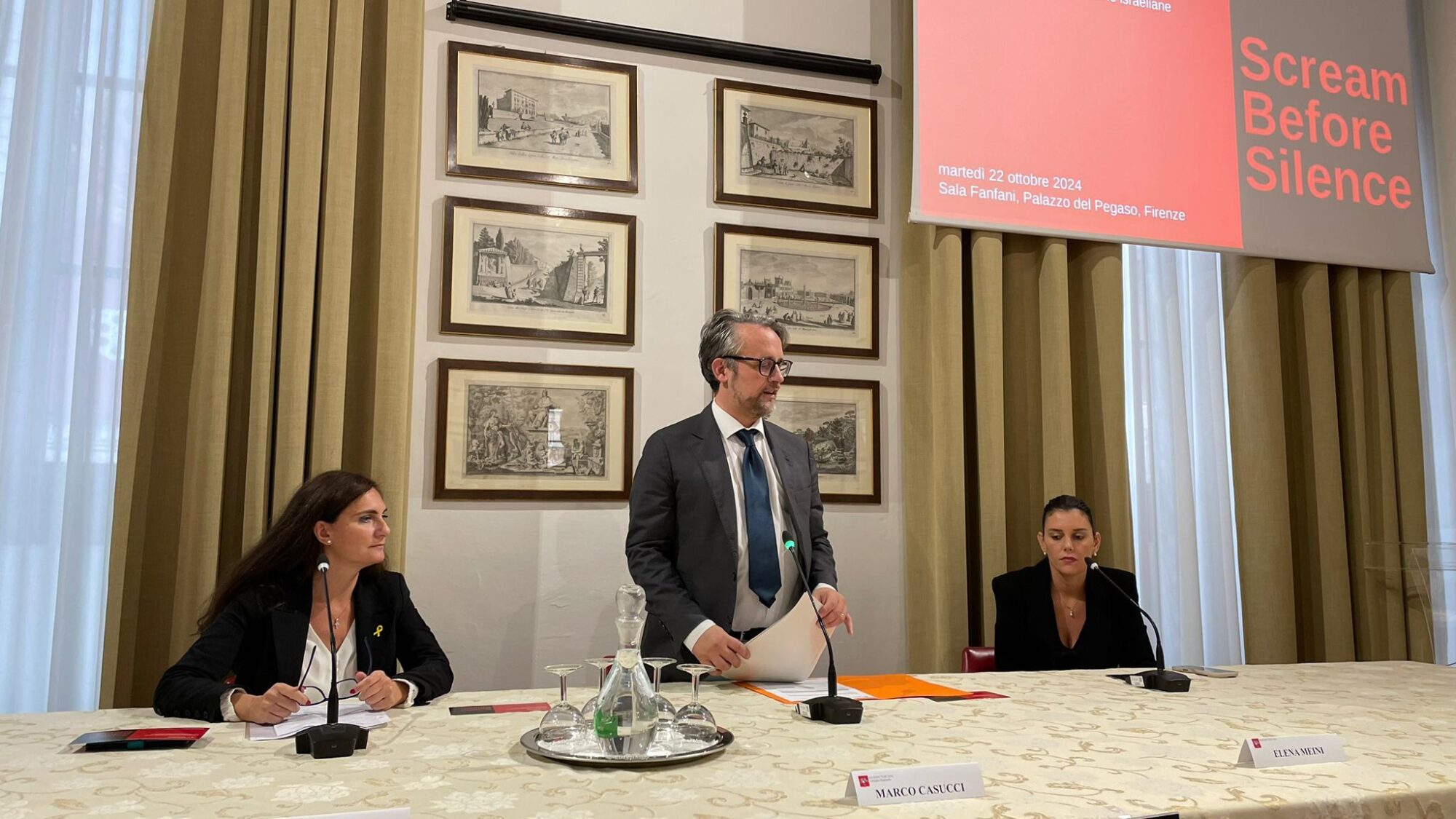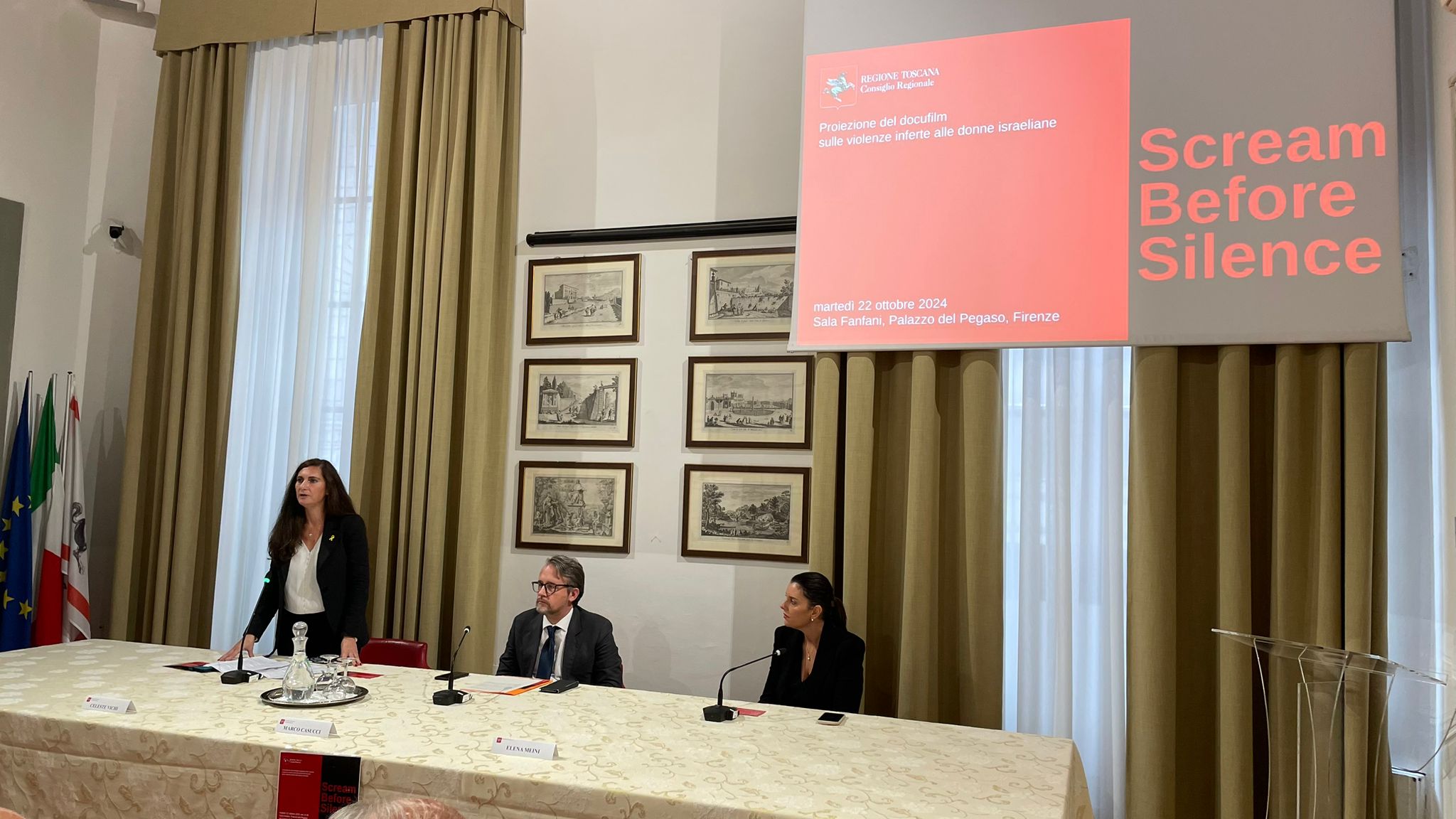 Firenze – ‘Screams Before Silence’ è il titolo del docufilm che esplora la violenza sessuale durante l’attacco guidato da Hamas contro Israele, il 7 ottobre 2023 e che è stato proiettato nella sala Fanfani di palazzo del Pegaso. Dopo i saluti istituzionali del vicepresidente del Consiglio regionale Marco Casucci sono intervenuti la consigliera regionale Elena Meini e la presidente dell’Unione Associazioni Italia-Israele Celeste Vichi. Era presente anche il consigliere regionale Giovanni Galli.