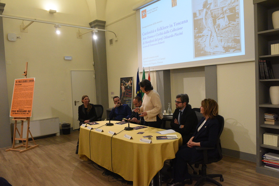 Firenze – Nello spazio espositivo Ciampi a palazzo del Pegaso (Firenze, via de’ Pucci 16/r) è stata inaugurata, giovedì 12 marzo, dalla presidente del Consiglio regionale Stefania Saccardi, la mostra “Curiosità e folklore in Toscana. Arte Donna e Civiltà dalla Collezione di Manifesti del professor Odoardo Piscini” a cura di Francesca Roberti. La collezione Piscini è uno scrigno di 14mila manifesti illustrati del XX secolo e sino ad oggi, immagini che parlano di storia, di umanità, della donna, di vita civile e tradizione, senza trascurare l’arte fiorentina e toscana. 60 manifesti selezionatissimi provenienti dalla collezione del professor Piscini, una raccolta che vede la sua nascita 60 anni fa, quando Odoardo appassionato di arte e libri decise di iniziare a raccogliere quello che a suo tempo era il documento informativo per i cittadini. Importanti illustratori, grafici ed artisti hanno firmato i manifesti che venivano affissi nelle vie principali delle città.