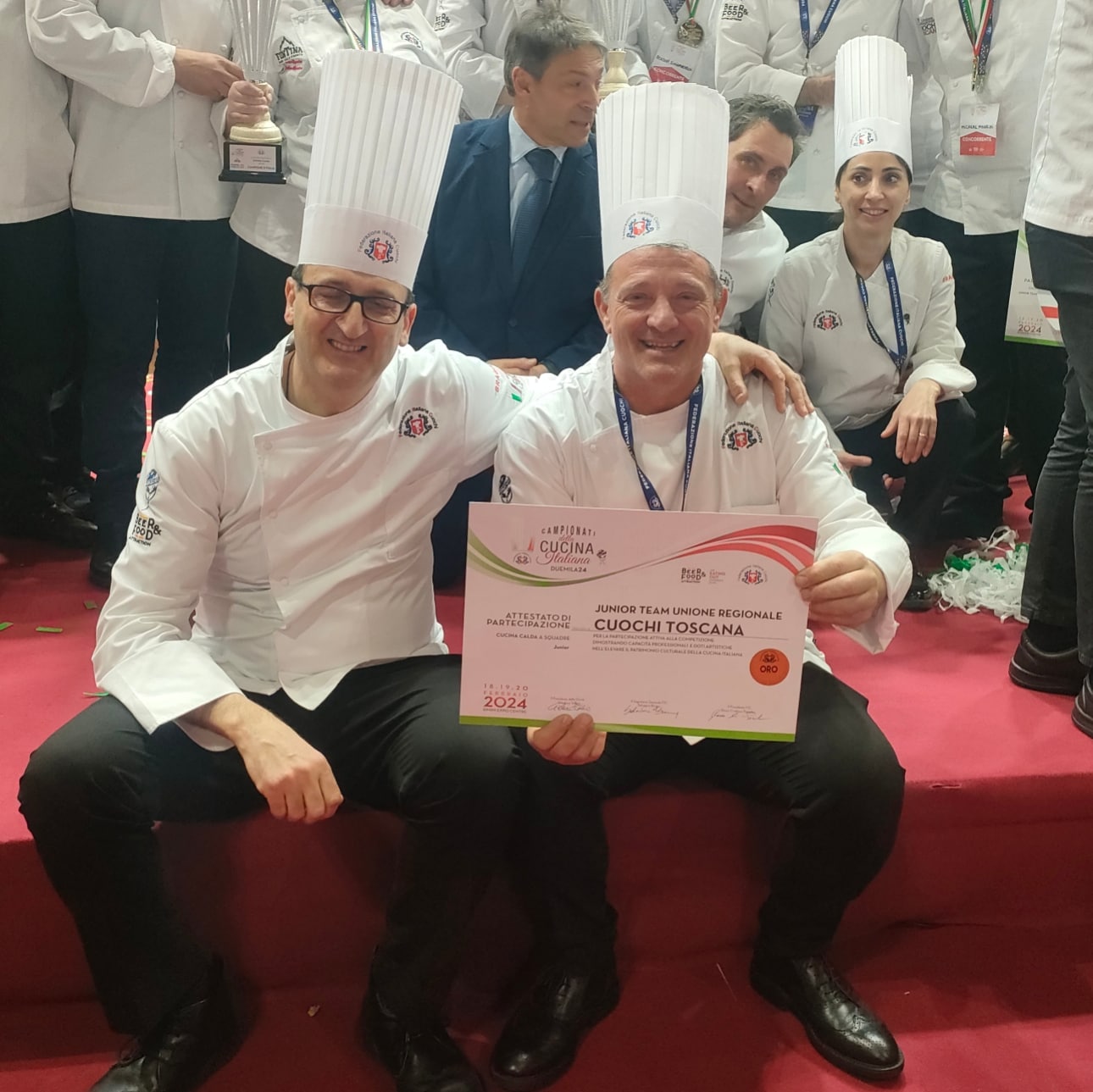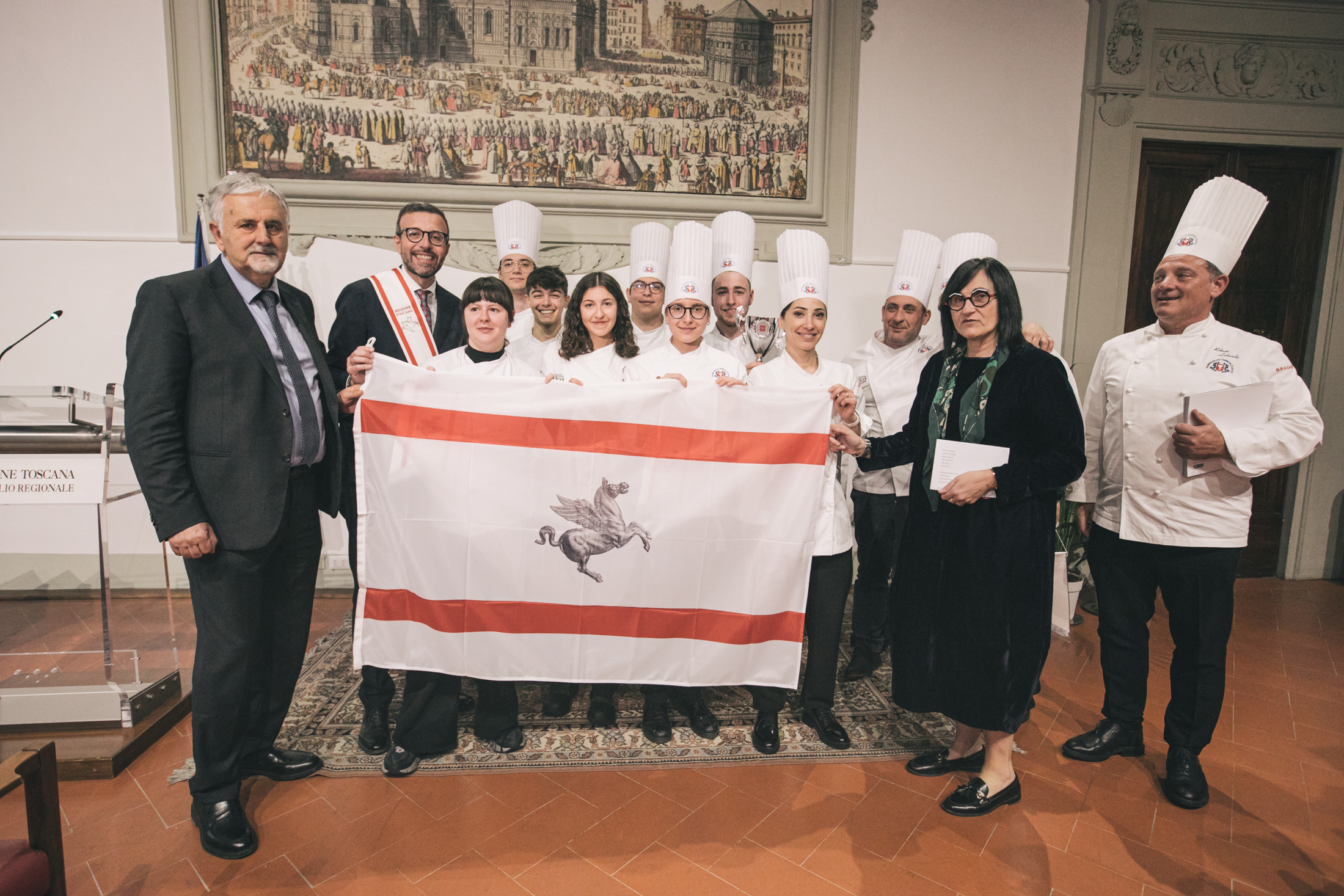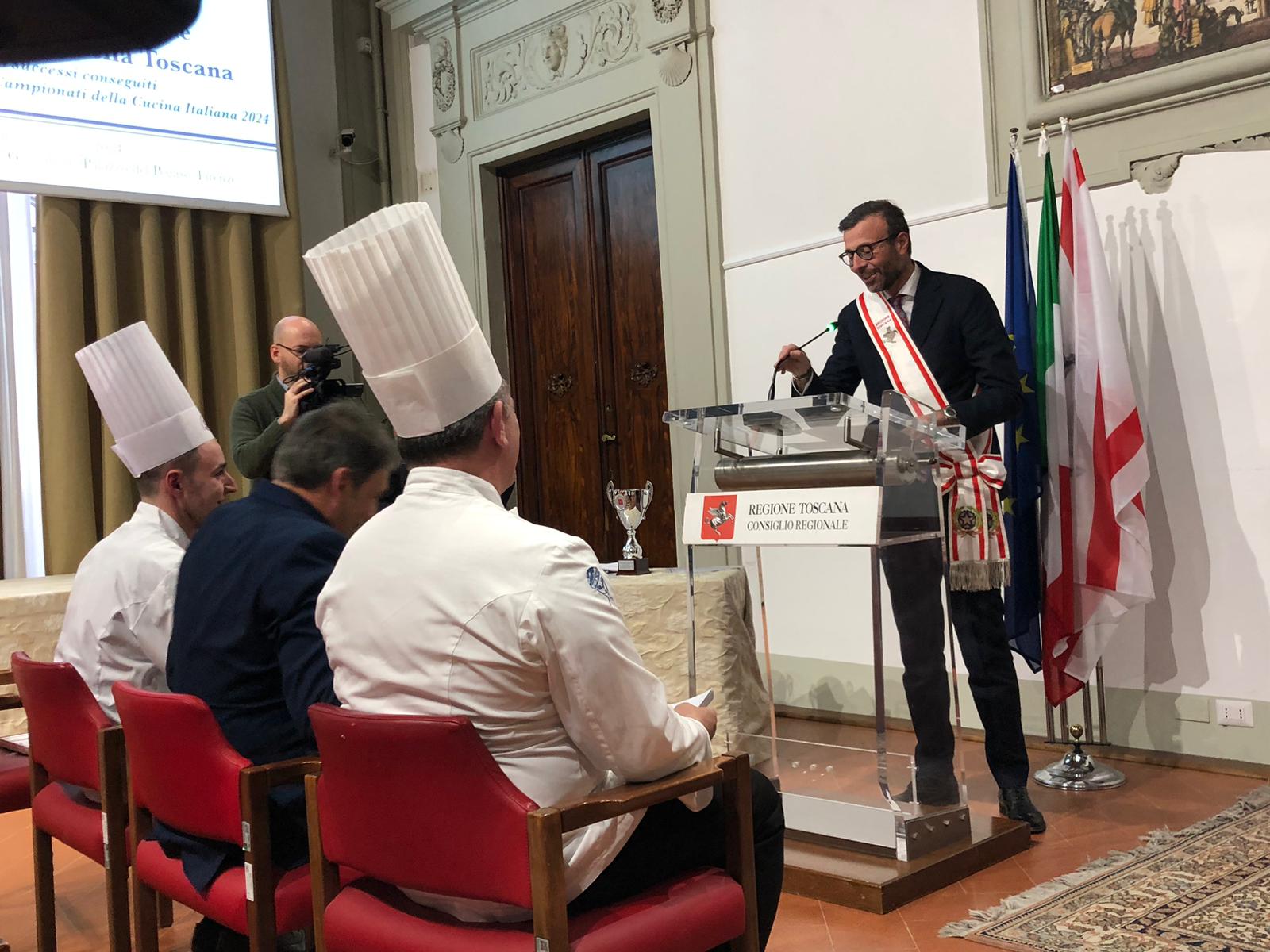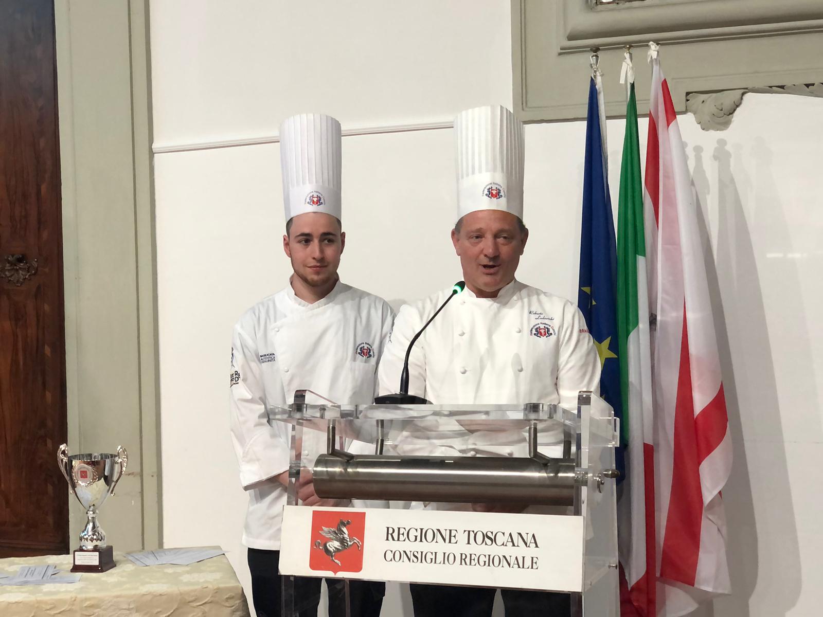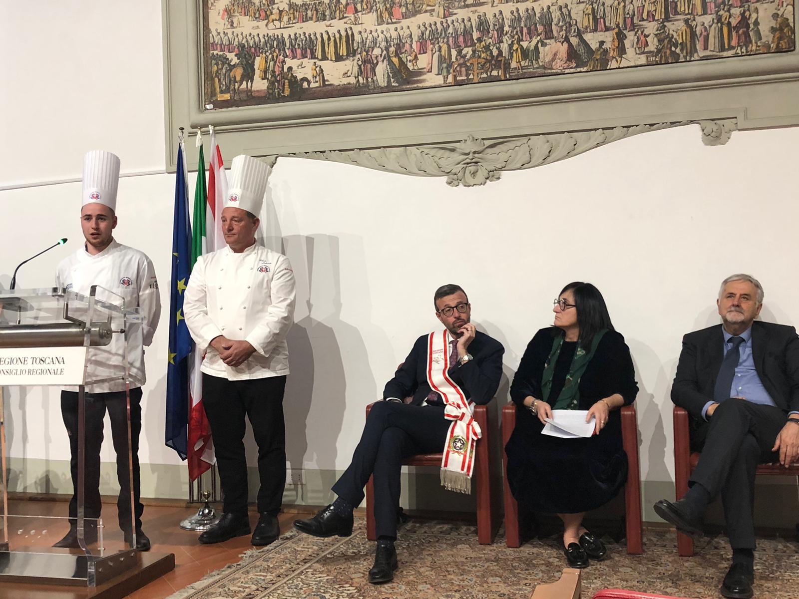 A consegnare il premio nelle mani del team manager della squadra, Tommaso Monaci dell’Associazione Cuochi Arezzo, il presidente dell’Assemblea legislativa Antonio Mazzeo: “Siete motivo di orgoglio, non è scontato arrivare a questi risultati. Risultati raggiunti coniugando tradizione e innovazione. Sapere che ragazze e ragazzi giovanissimi riescono a valorizzare la Toscana, con la sua cucina, la filiera corta e la sua identità, mi dà il senso che è stato fatto un ottimo lavoro”.