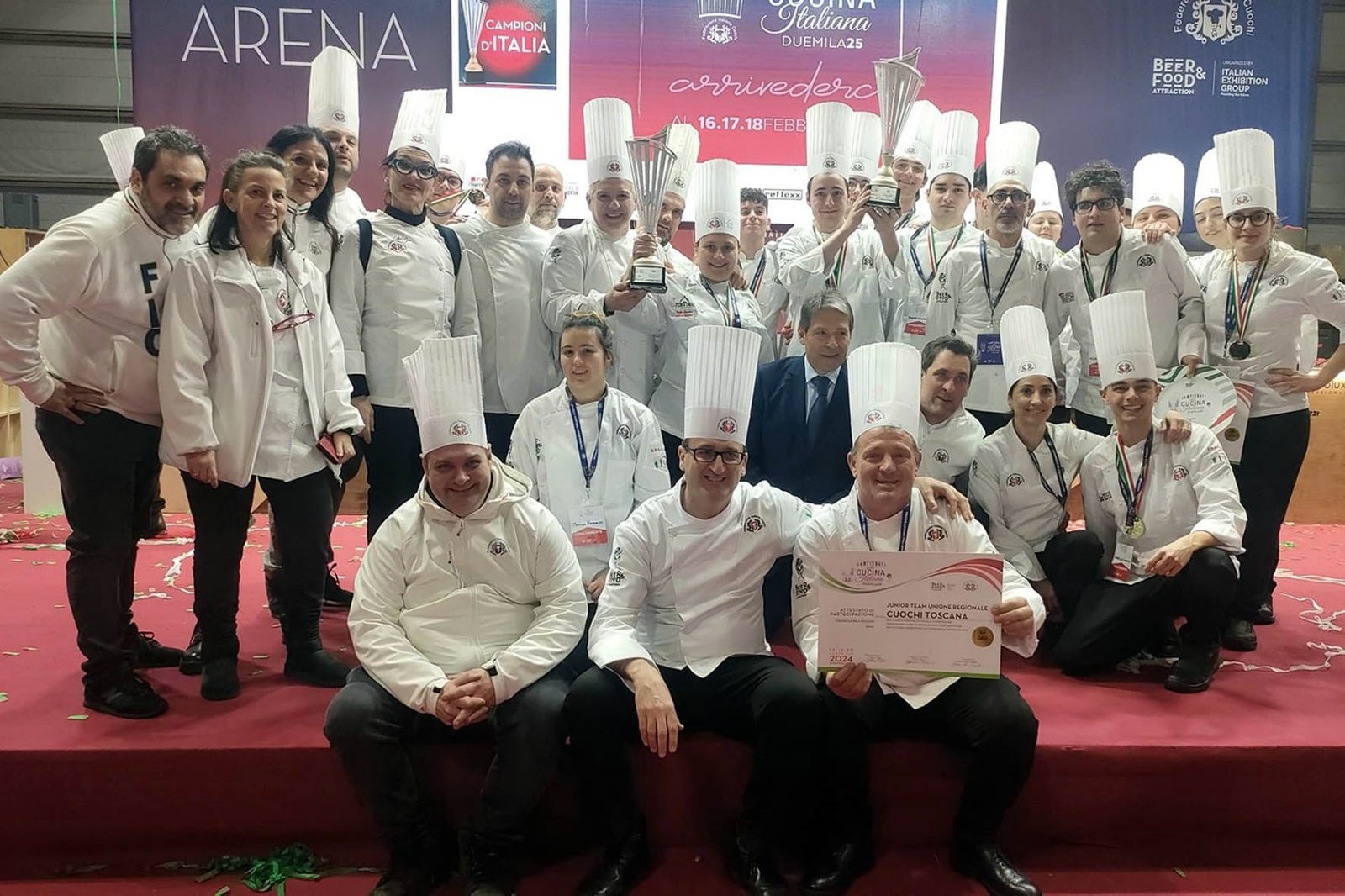 “Questa volta a vincere sono stati i giovani – le parole del consigliere regionale Vincenzo Ceccarelli – e vista la bravura dei loro maestri era inevitabile. Un’esperienza partita da Arezzo con Roberto Lodovichi che è una delle anime dell’Unione regionale dei cuochi”. Poi rivolgendosi ai ragazzi ha aggiunto: “Non avete solo il compito di deliziare i palati, ma di comunicare un territorio con le sue tradizioni e le sue materie prime, e che lo abbiate fatto ai campionati italiani ci riempie di orgoglio”.
