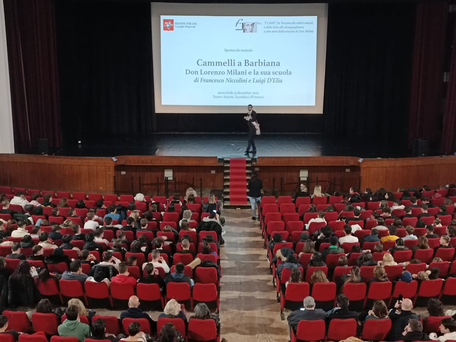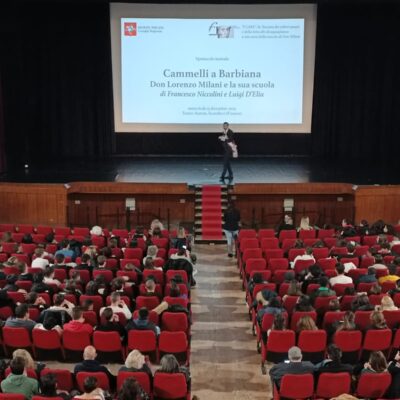 Il racconto teatrale, prodotto da Inti, con Luigi D’Elia e la regia di Fabrizio Saccomanno, è andato in scena sul palco del Teatro Aurora di Scandicci, con il direttore artistico Alessandro Calonaci a fare gli onori di casa, con un doppio appuntamento, martedì 12 dicembre, con la presenza del consigliere regionale Fausto Merlotti, mentre la replica, dedicata alle scuole, è andata in scena il 13 dicembre, e ha visto la partecipazione del presidente del Consiglio regionale Antonio Mazzeo che ha parlato dal palco agli oltre 300 ragazzi intervenuti: “La Festa della Toscana è stata dedicata quest’anno a un grande toscano, Don Lorenzo Milani. I suoi erano messaggi di speranza e di uguaglianza, e siamo felici che questo spettacolo parli proprio alle ragazze e ai ragazzi che tanto Don Milani amava”.