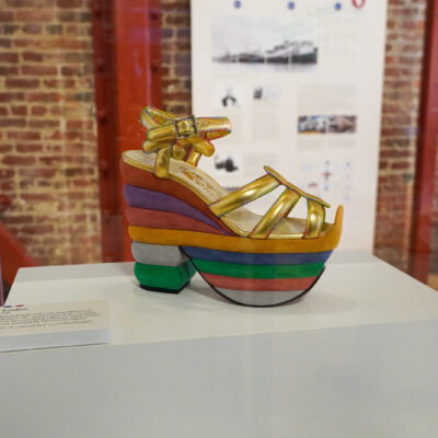 Ferragamo – Rainbow. Modello creato da Salvatore Ferragamo nel 1938 per Judy Garland. La zeppa in sughero è una delle invenzioni più significative di Ferragamo e fu progettata per rispondere ad un’esigenza di funzionalità. Caratteristica del modello è la ricchezza cromatica, tratto stilistico distintivo delle calzature Ferragamo.