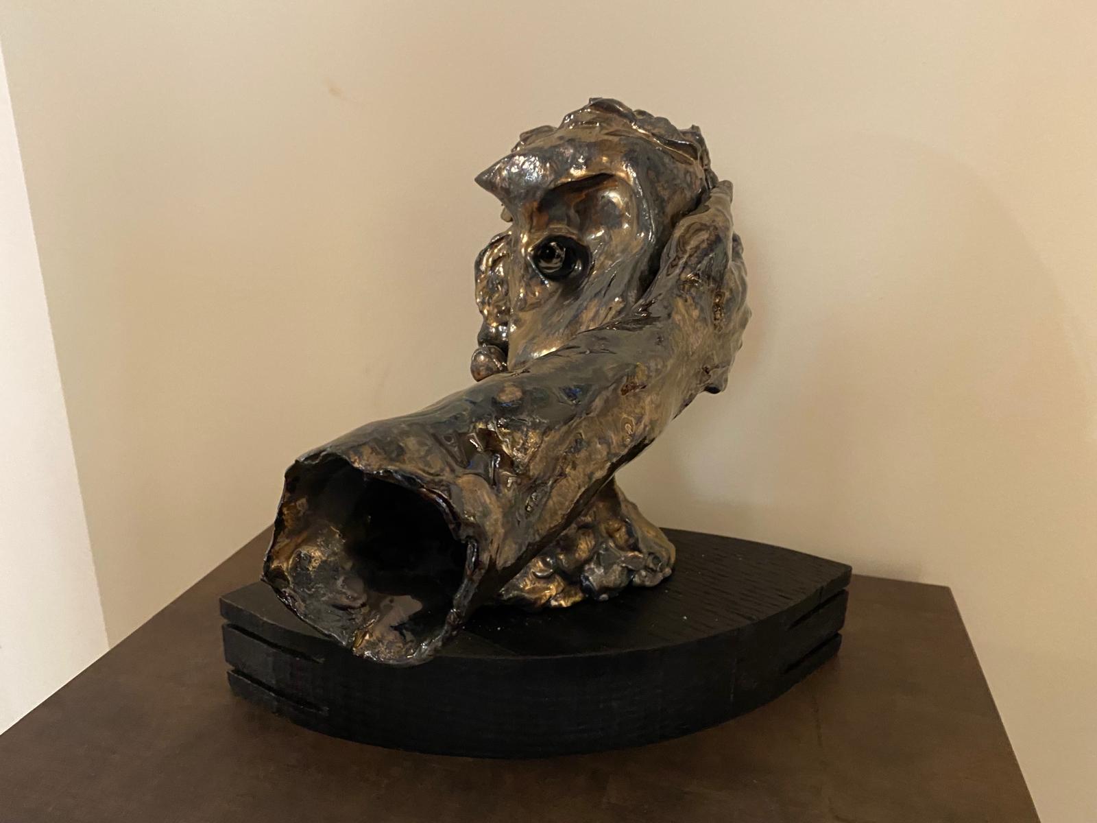 Alessio Musella, curatore e critico d’arte, sottolinea come la scultura sia una ceramica a tre fuochi. “Essa ha delle colorazioni particolari – ha evidenziato – Il grigio argenteo ci riporta al buio della violenza, al lato oscuro di chi colpisce sapendo che il male non si fermerà al dolore fisico e arriverà fino all’anima. Ma la colorazione d’oro, nello sguardo della donna, fa intravedere una luce, la voglia di cambiare, di allontanarsi dal buio, di gridare mai più, e ci fa sperare che quello schiaffo possa diventare una carezza”.