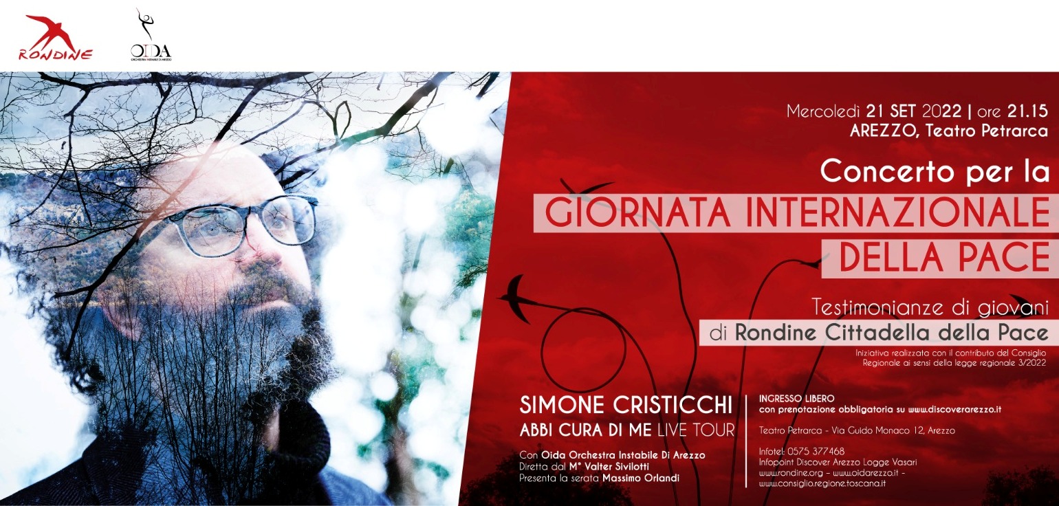 Firenze – Arezzo celebra il 21 settembre, Giornata Internazionale per la Pace promossa dalle Nazioni Unite, con un evento artistico unico e di grande intensità. La serata, sostenuta e finanziata dal Consiglio Regionale della Toscana, in attuazione della legge 3/2022 e organizzata con Rondine Cittadella della Pace e Oida Orchestra Instabile di Arezzo vedrà salire sul palco del Teatro Petrarca Simone Cristicchi.