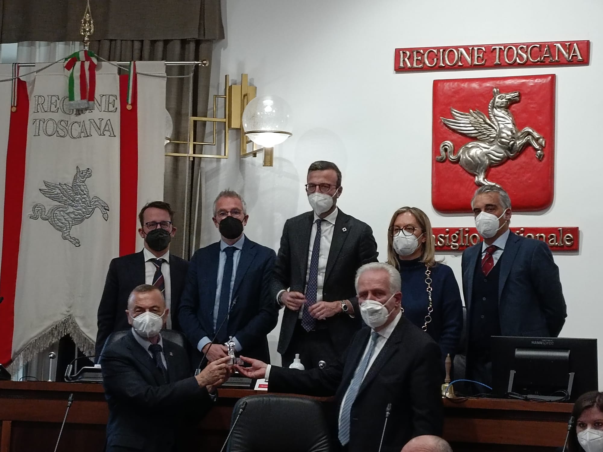 In conclusione della seduta, il presidente Mazzeo ha voluto consegnare insieme, con tutto l’Ufficio di presidenza del Consiglio regionale e al presidente Giani, il Pegaso alato a Guido Giacometti.
