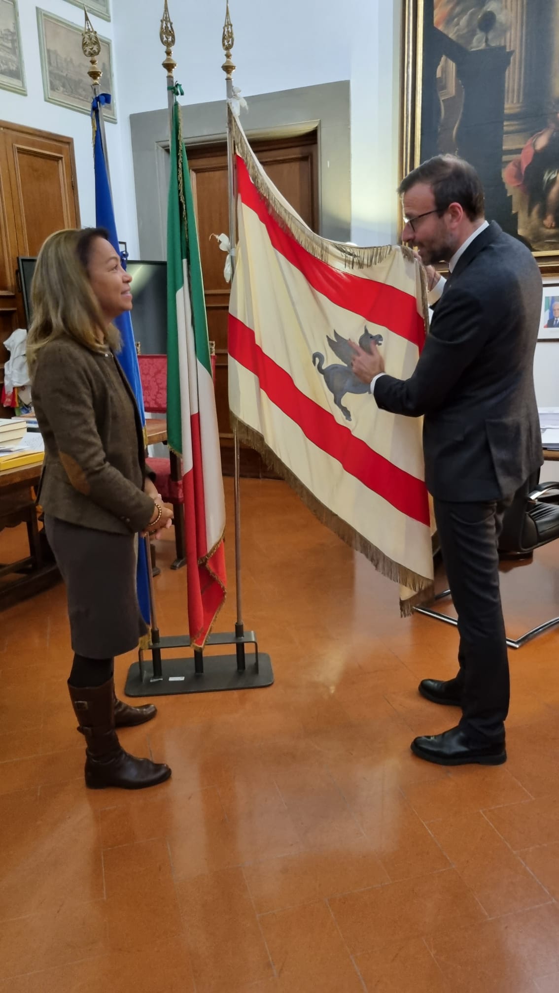 A conclusione dell’incontro la console ha firmato il libro degli ospiti riservato agli incontri ufficiali nella sede del Consiglio. Il presidente Mazzeo ha donato alla console Ballard una copia del volume in italiano e inglese con la storia di palazzo del Pegaso e un foulard artigianale realizzato in Toscana con il Pegaso alato simbolo della Regione.