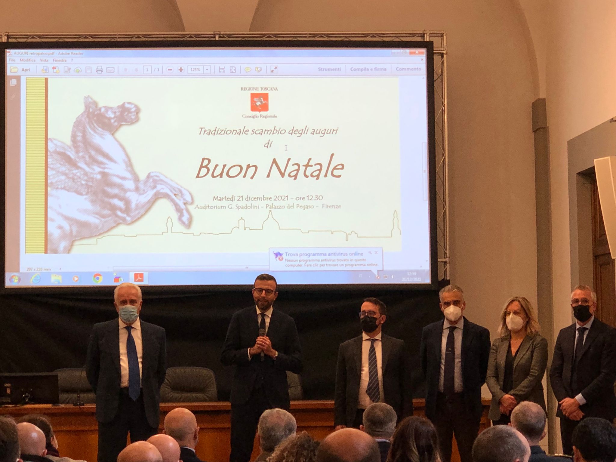 Firenze – In Auditorium Giovanni Spadolini, a palazzo del Pegaso, di fronte ad autorità civili, militari e religiose, insieme a dipendenti e rappresentanti della società, si è svolto oggi – martedì 21 dicembre – il tradizionale scambio di auguri di Buone Feste, con i presidenti del Consiglio e della Giunta Regionale, Antonio Mazzeo ed Eugenio Giani.
