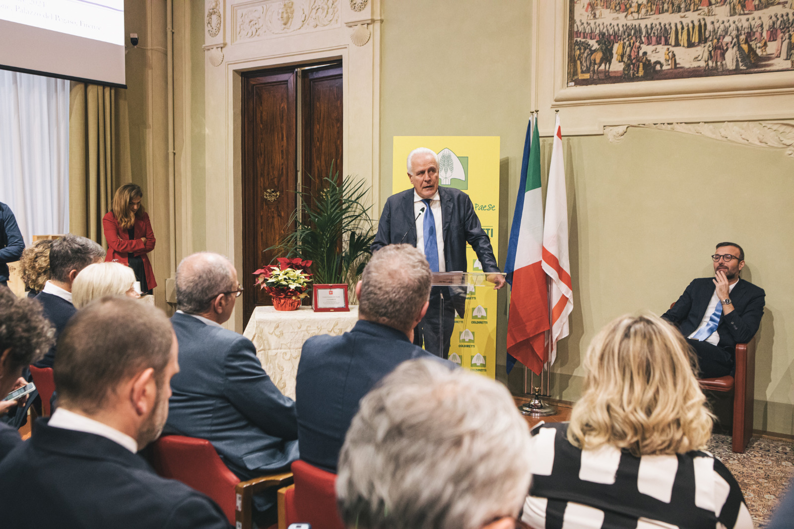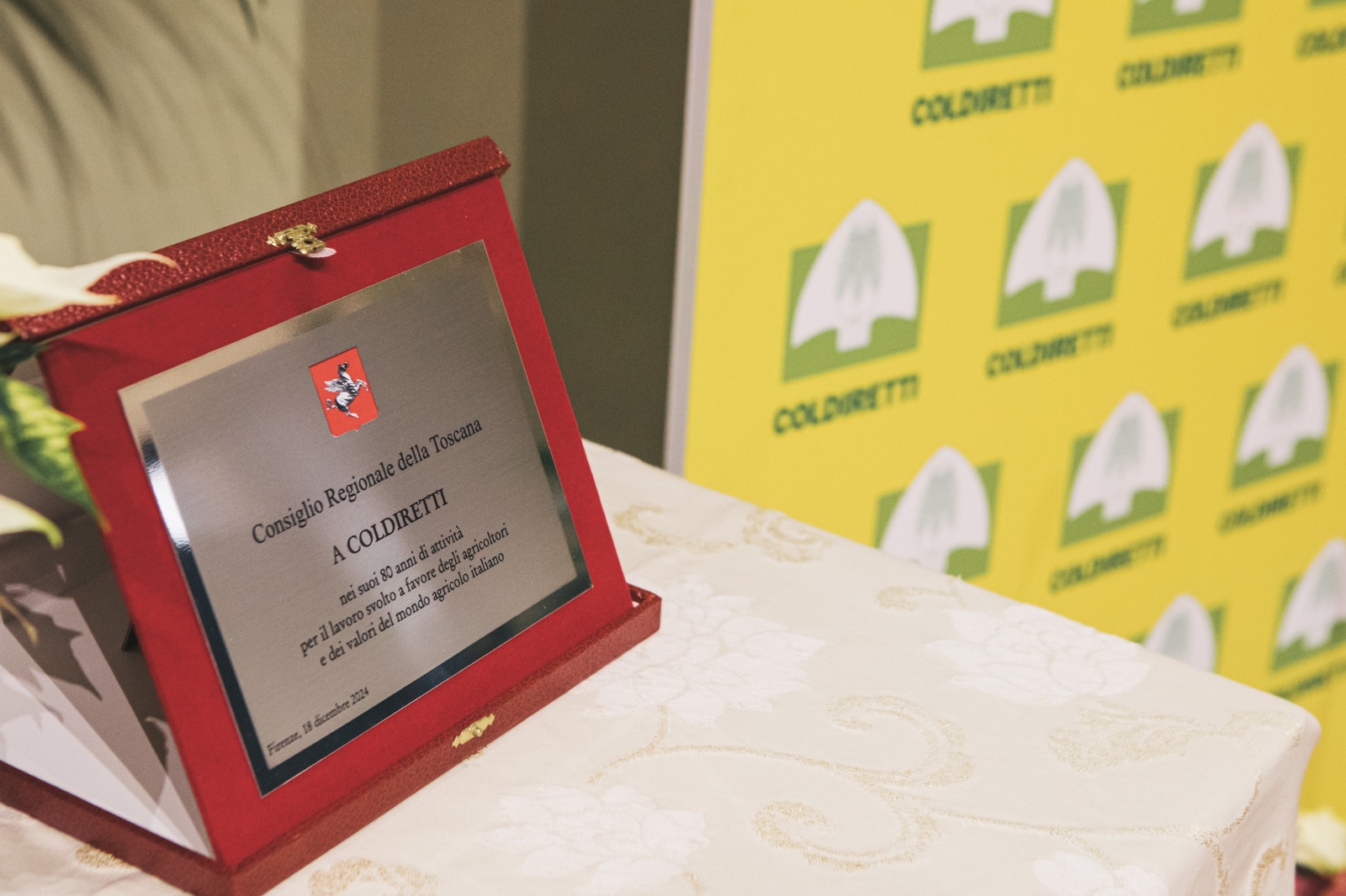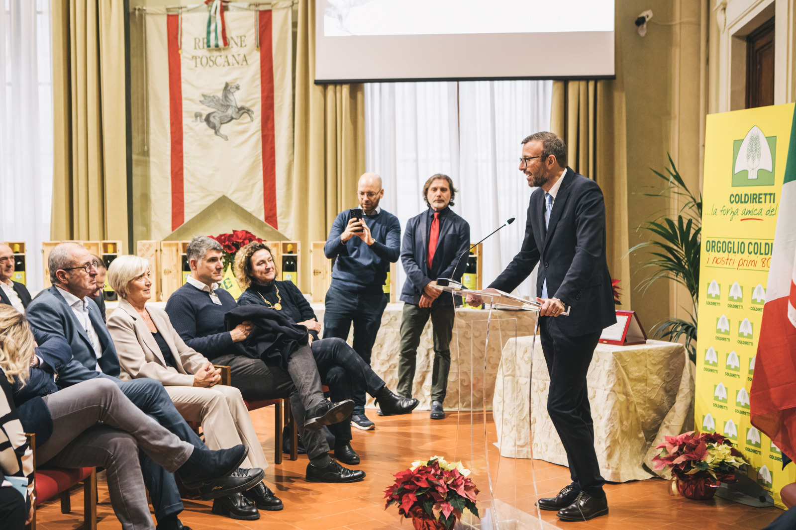 Firenze – Il Consiglio regionale ha premiato, mercoledì 18 dicembre, Coldiretti toscana in occasione di un compleanno importante. L’associazione che nella regione conta 25mila soci e 54 sedi operative festeggia nel 2024 gli ottant’anni dalla fondazione il 30 ottobre del 1944 da parte di Paolo Bonomi giovane partigiano cattolico proveniente da una famiglia contadina. In una sala Gonfalone gremita il presidente dell’Assemblea legislativa Antonio Mazzeo ha consegnato una targa nelle mani della presidente Letizia Cesani, con loro il presidente della Giunta regionale Eugenio Giani e i membri dell’Ufficio di presidenza del Consiglio regionale Stefano Scaramelli, Marco Casucci, Federica Fratoni e Diego Petrucci.