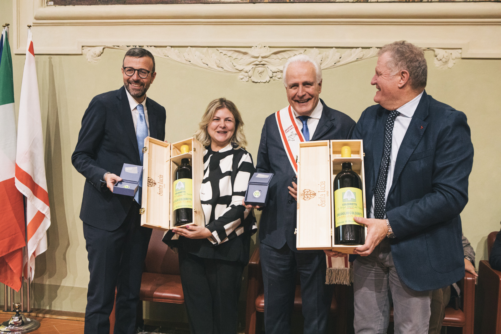 Erano presenti alla cerimonia, in cui Coldiretti ha donato al presidente Mazzeo, al presidente Giani e ai consiglieri delle medaglie celebrative e una bottiglia di vino, l’assessora regionale Stefania Saccardi, i consiglieri regionali Elena Meini, Lucia De Robertis, Fiammetta Capirossi, Donatella Spadi, Luciana Bartolini, Vincenzo Ceccarelli, Marco Landi, Vittorio Fantozzi, Enrico Sostegni, Marco Niccolai, Gabriele Veneri, Cristiano Benucci, Mario Puppa e Maurizio Sguanci.