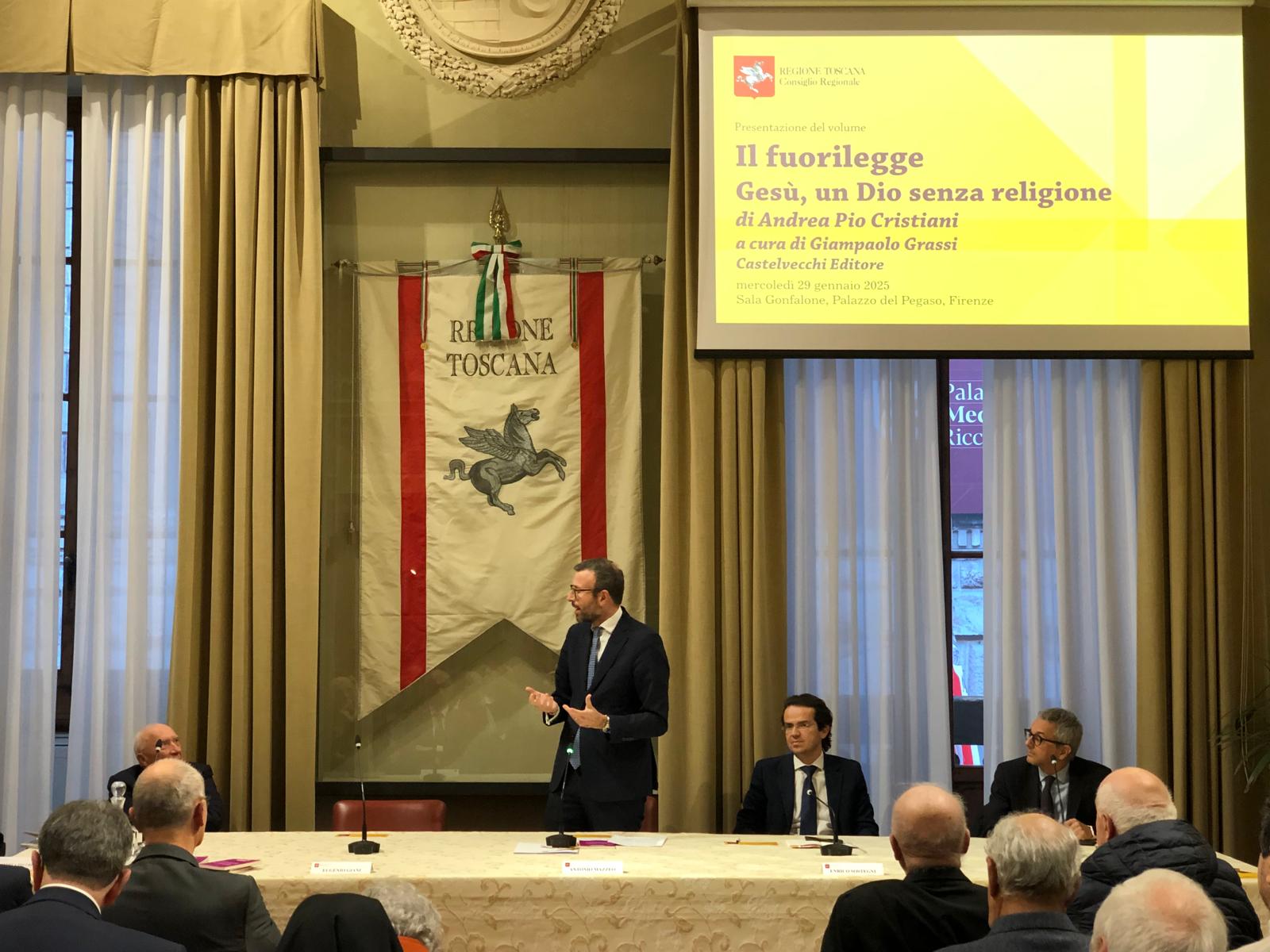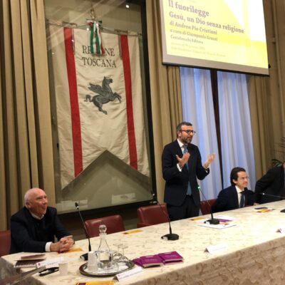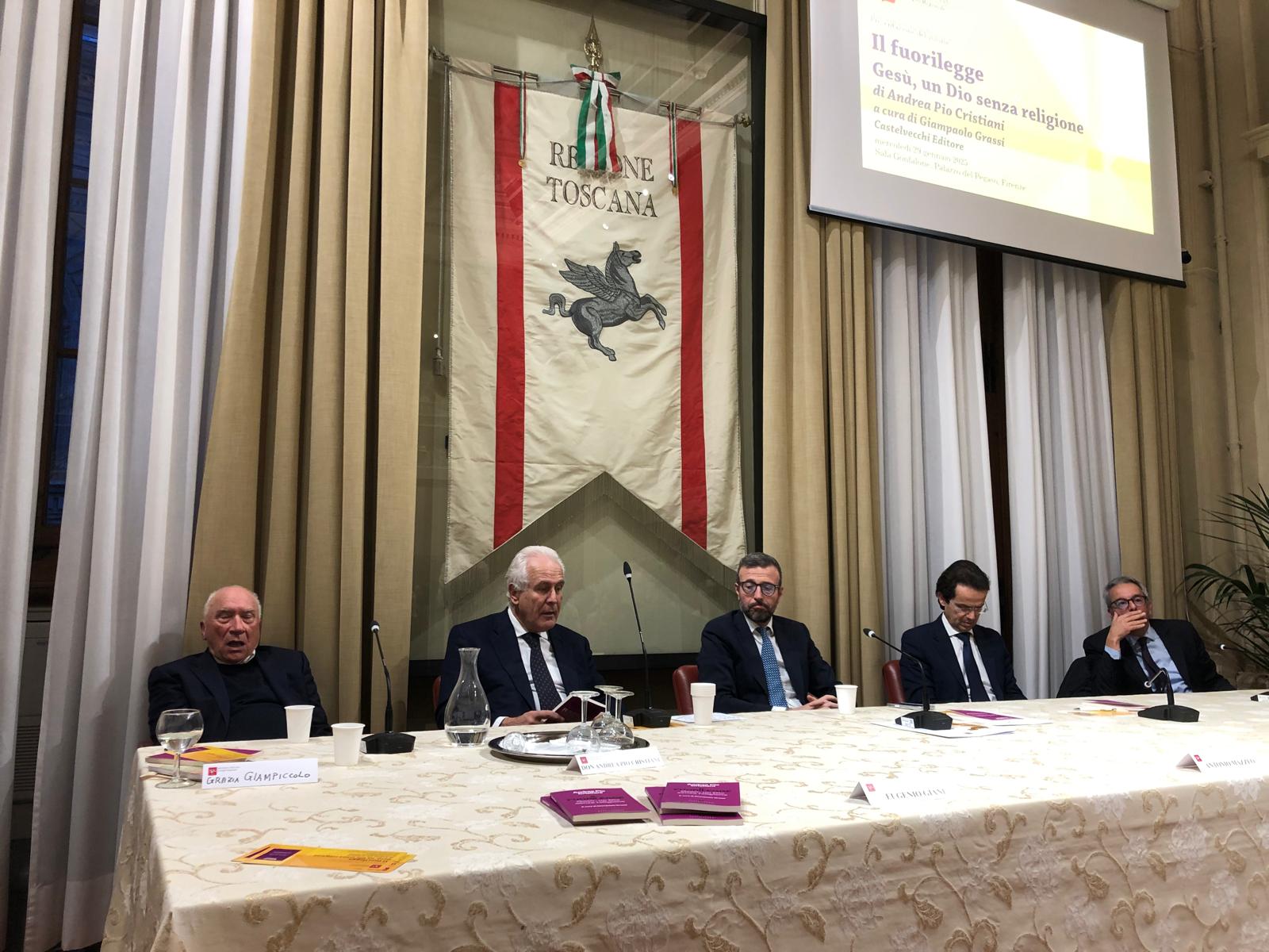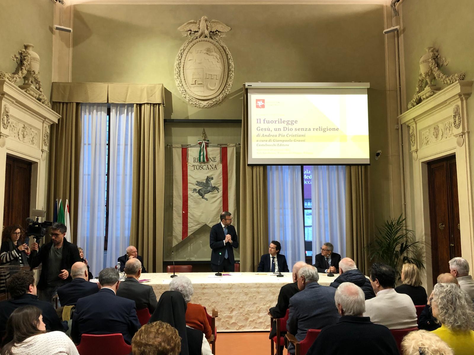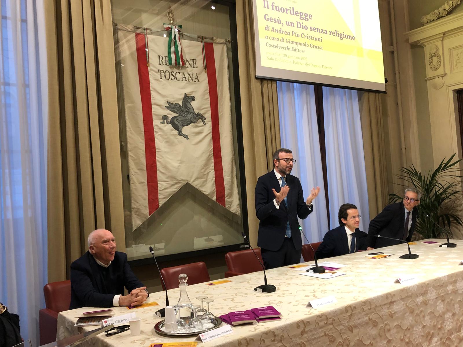 Firenze – È stato presentato mercoledì 29 gennaio nella sala Gonfalone di palazzo del Pegaso il libro ‘Il fuorilegge. Gesù un Dio senza religione’, di don Andrea Pio Cristiani, a cura di Giampaolo Grassi. Un dibattito moderato da Grazia Giampiccolo e animato dagli interventi del presidente del Consiglio regionale Antonio Mazzeo, del presidente della Giunta Eugenio Giani e del consigliere regionale Enrico Sostegni. Non sono mancate testimonianze importanti come quella del Vescovo emerito di Pinerolo monsignor Pier Giorgio Debernardi e di Gianni Lusena console onorario della Colombia a Firenze. Erano presenti l’assessora regionale Alessandra Nardini e i consiglieri regionali Marco Martini e Andrea Pieroni.