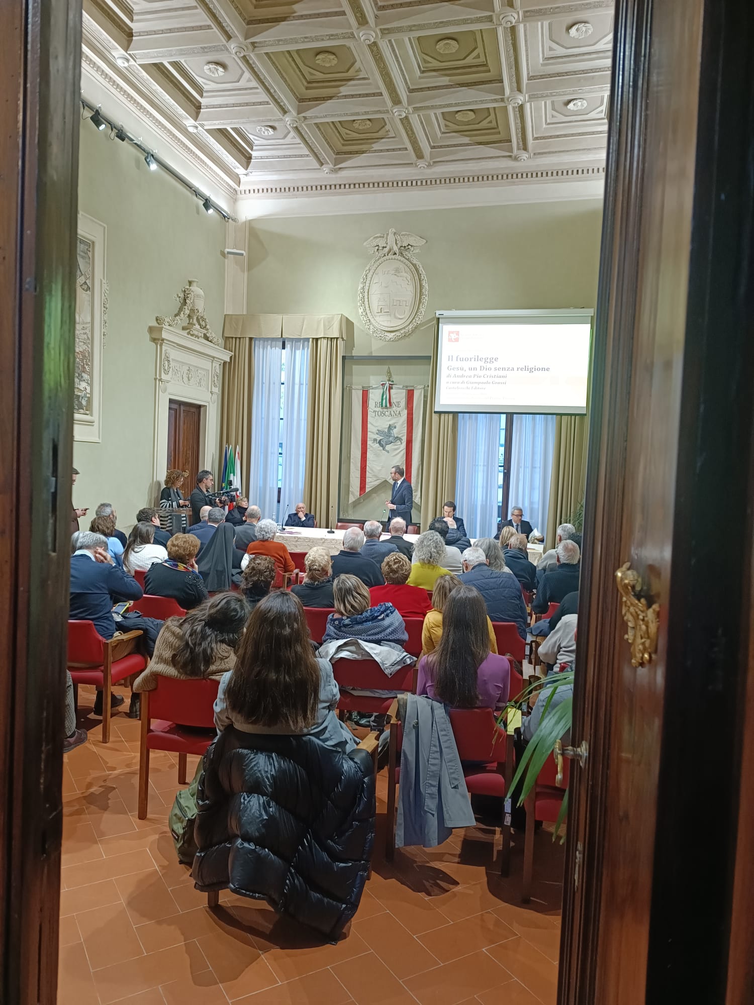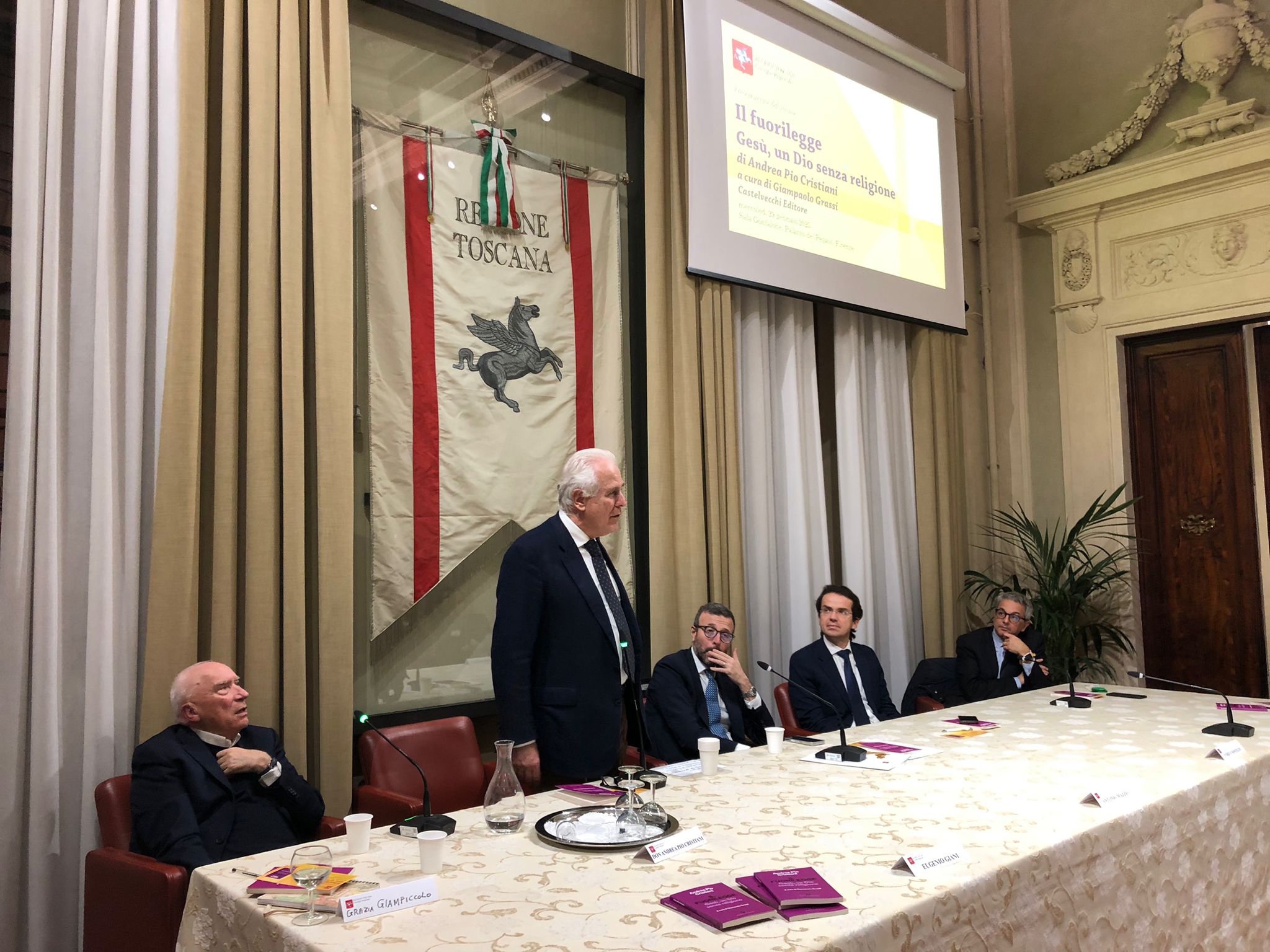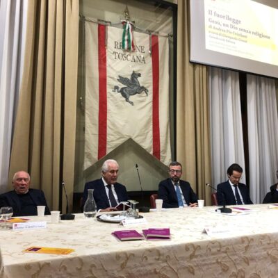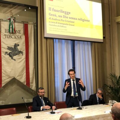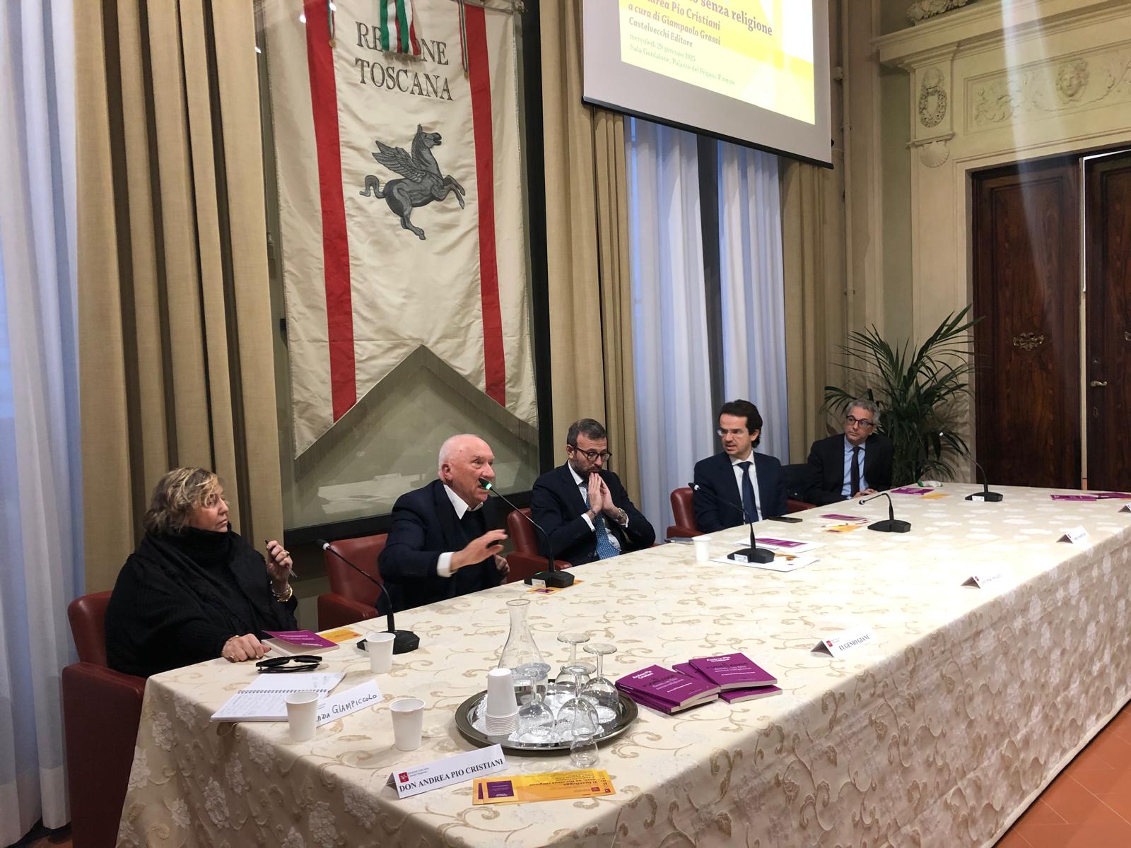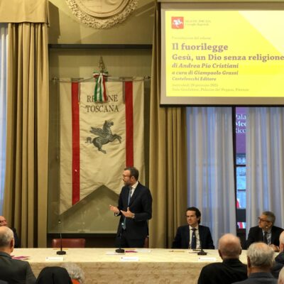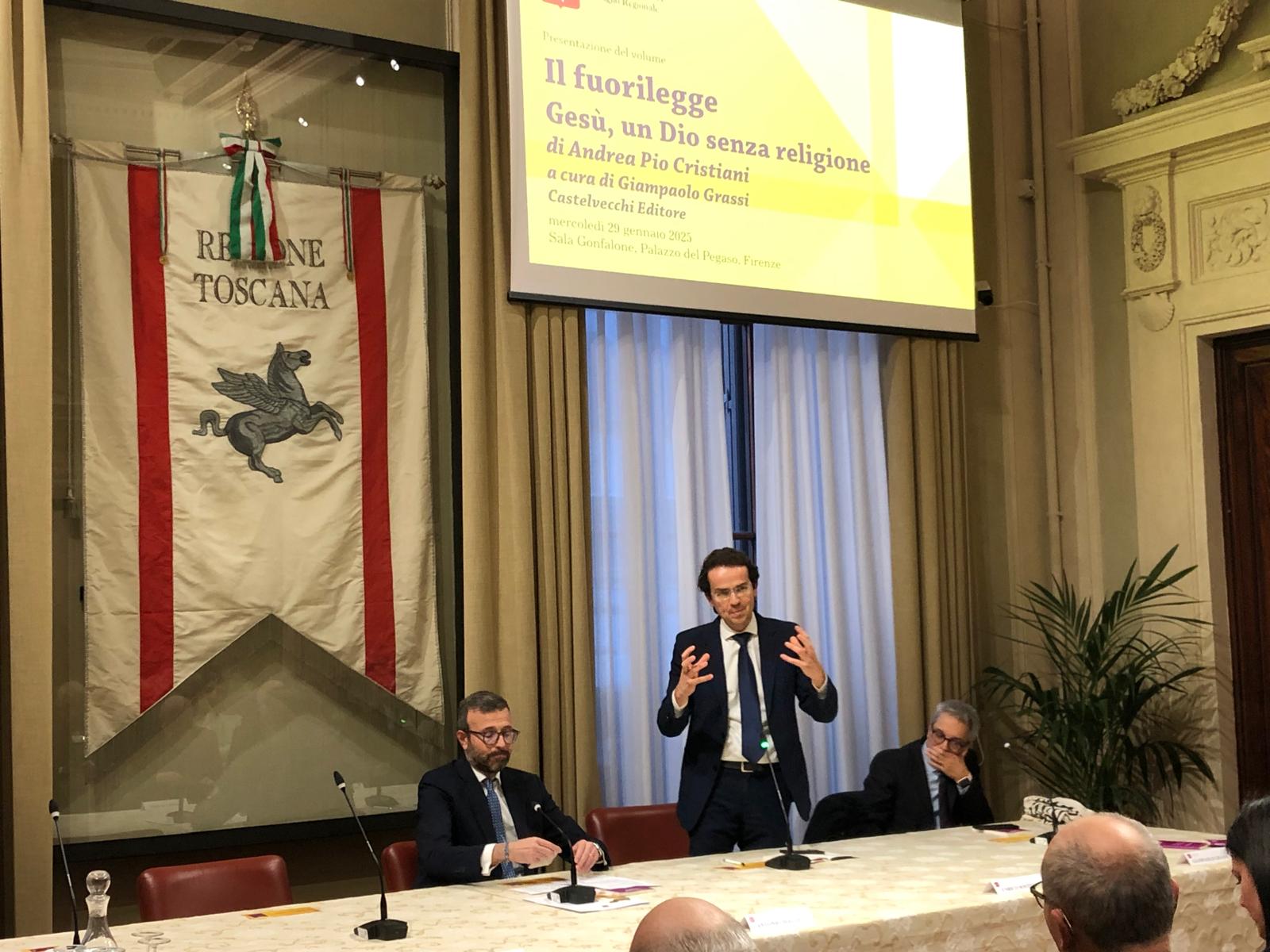 Firenze – È stato presentato mercoledì 29 gennaio nella sala Gonfalone di palazzo del Pegaso il libro ‘Il fuorilegge. Gesù un Dio senza religione’, di don Andrea Pio Cristiani, a cura di Giampaolo Grassi. Un dibattito moderato da Grazia Giampiccolo e animato dagli interventi del presidente del Consiglio regionale Antonio Mazzeo, del presidente della Giunta Eugenio Giani e del consigliere regionale Enrico Sostegni. Non sono mancate testimonianze importanti come quella del Vescovo emerito di Pinerolo monsignor Pier Giorgio Debernardi e di Gianni Lusena console onorario della Colombia a Firenze. Erano presenti l’assessora regionale Alessandra Nardini e i consiglieri regionali Marco Martini e Andrea Pieroni.