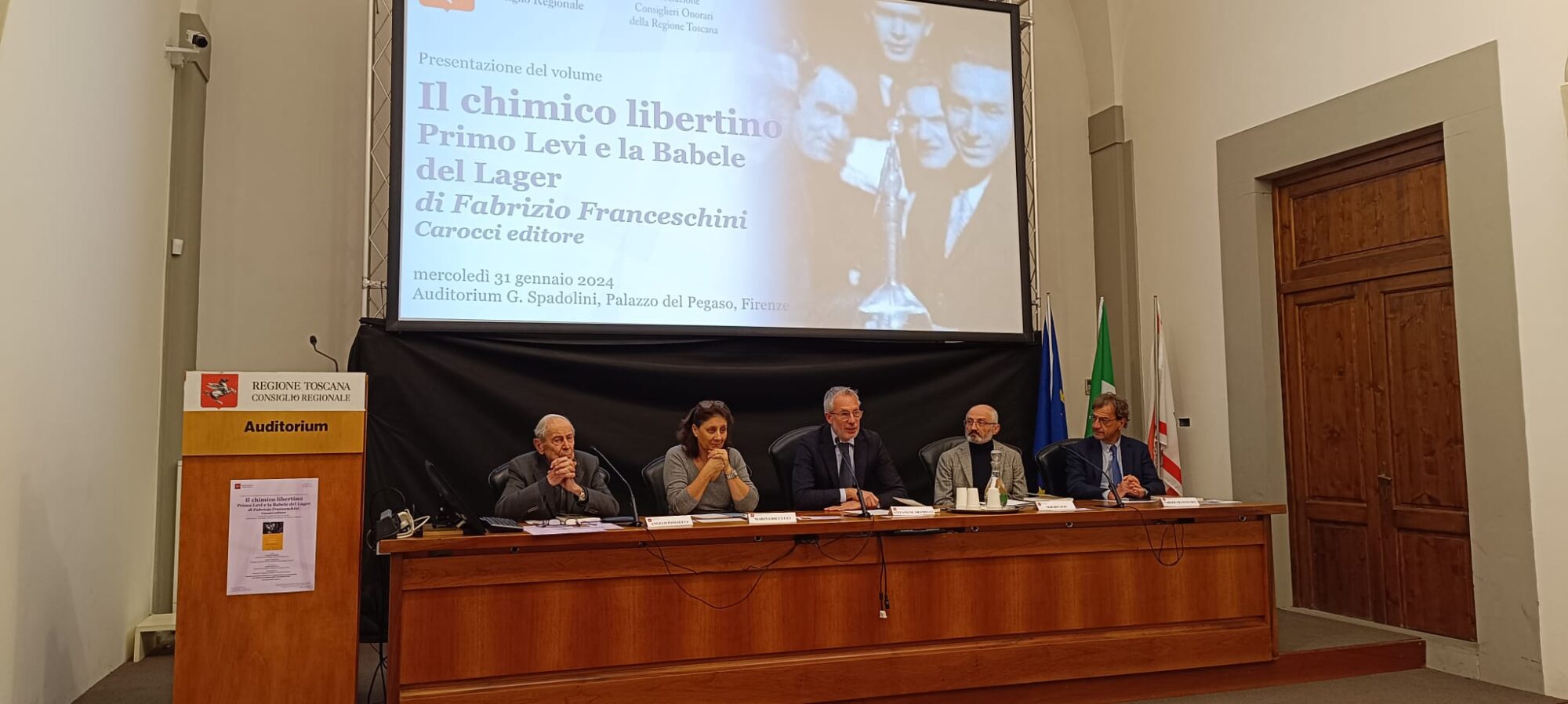Firenze – All’auditorium Spadolini di palazzo del Pegaso è stato presentato il libro “Il chimico libertino. Primo Levi e la Babele del Lager” di Fabrizio Franceschini. Sono intervenuti Angelo Passaleva, presidente emerito dell’Associazione dei Consiglieri Onorari, Stefano Scaramelli, vicepresidente del Consiglio regionale, Marina Riccucci, docente di Letteratura italiana (Università di Pisa), Neri Binazzi, docente di Linguistica italiana (Università di Firenze). Erano presenti studentesse e studenti del corso magistrale di Letteratura italiana dell’Università di Pisa.