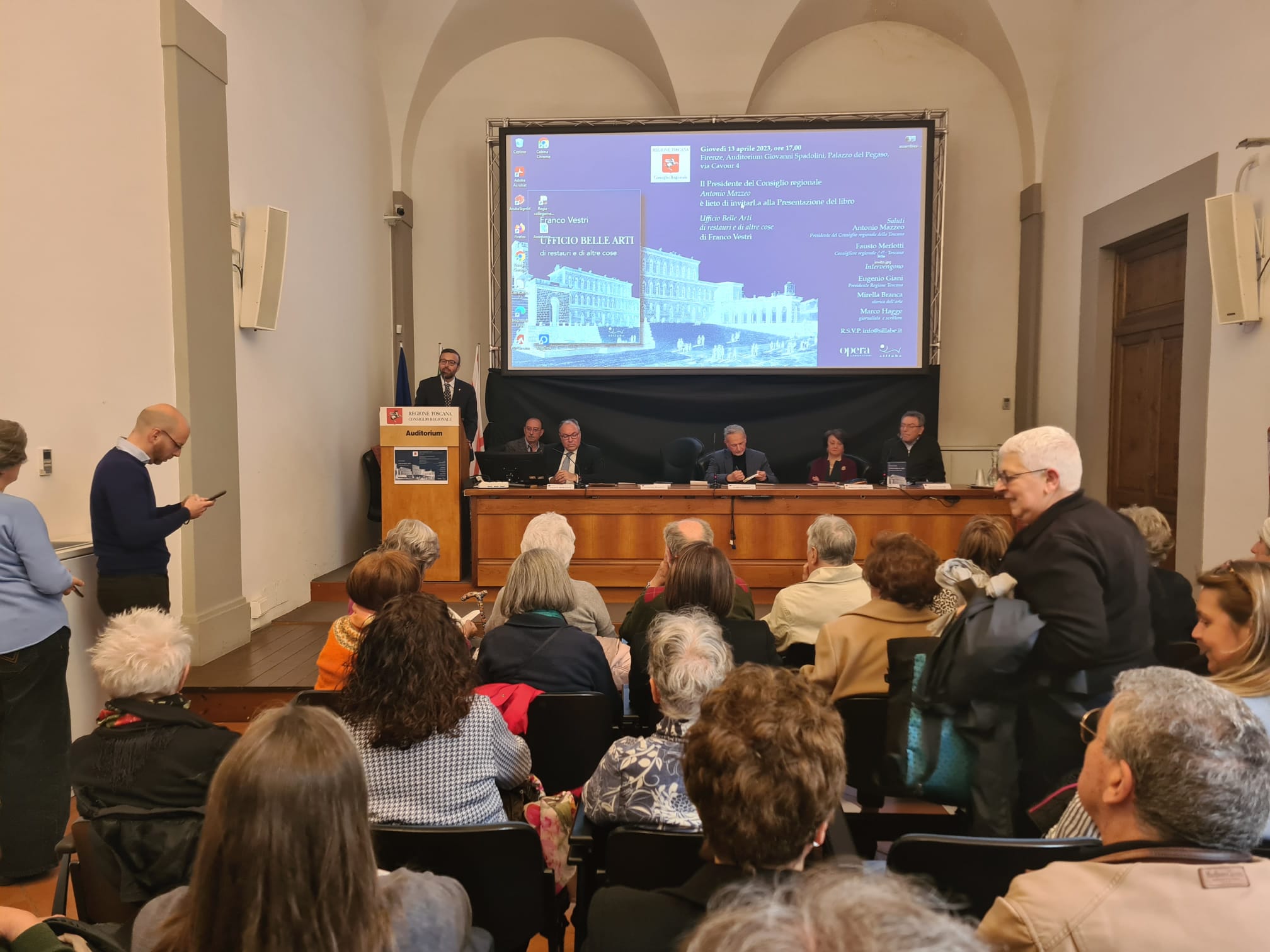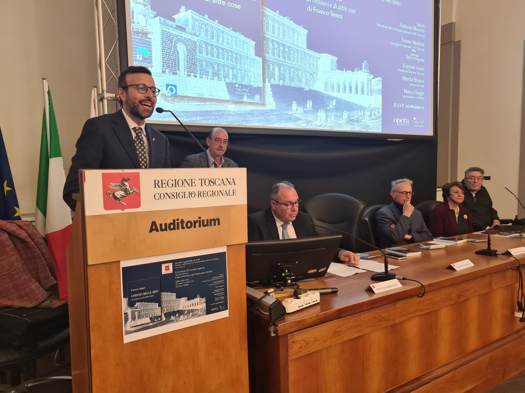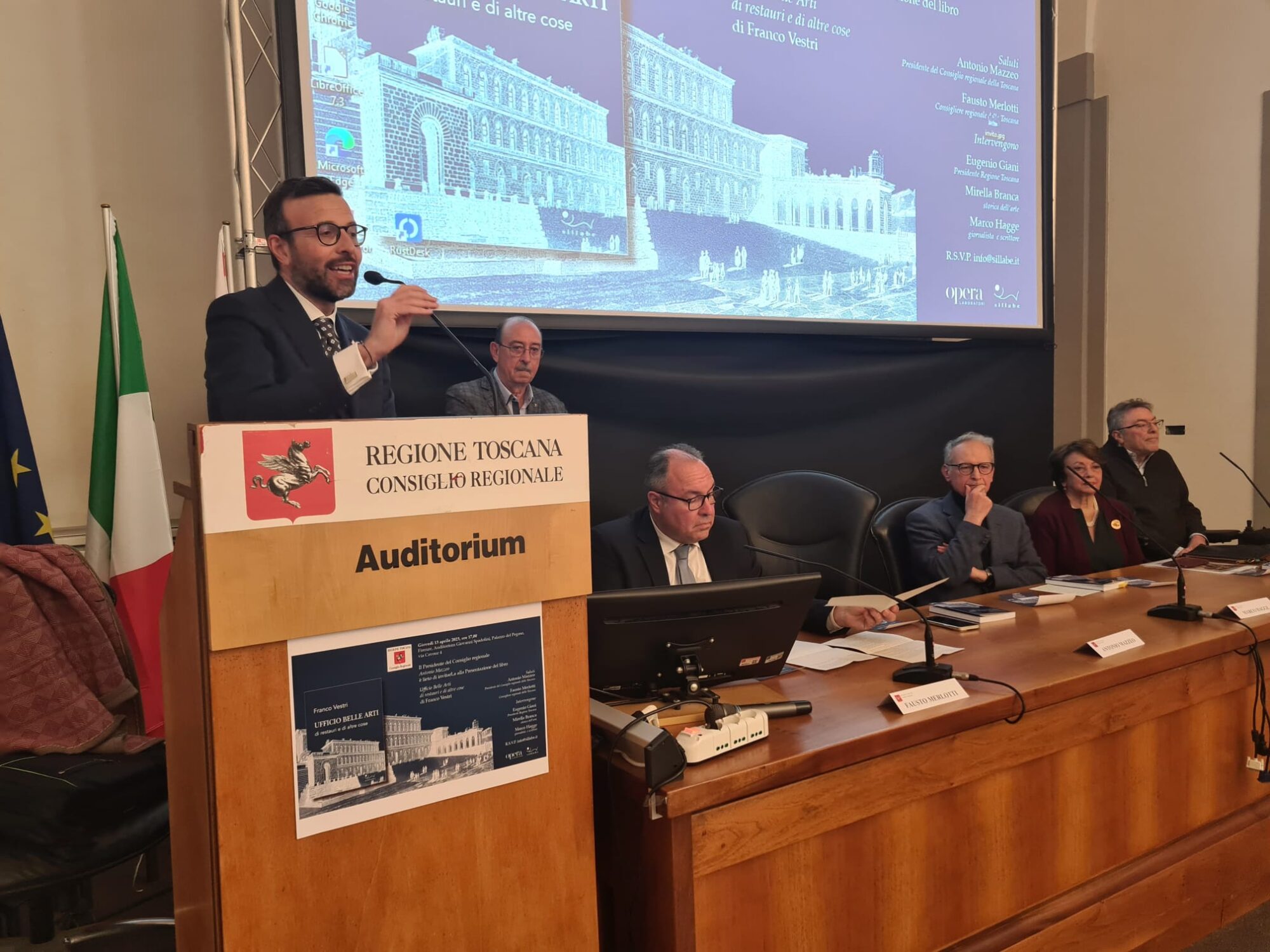 Firenze – “Per il portato di cultura, inno alla bellezza e storia dell’arte che questa terra ha creato e custodisce, io penso che questo libro dovremmo portarlo nelle scuole, per farlo conoscere alle studentesse e agli studenti, perché dobbiamo costruire cultura di bellezza, di rispetto del nostro patrimonio artistico e culturale. Noi dobbiamo far capire quanto c’è ancora da fare nel mare di bellezza in cui viviamo, per tramandarla alle generazioni future. Perché, come ho detto molte volte, diffondere cultura è costruire libertà. Lo ha detto il presidente del Consiglio regionale, Antonio Mazzeo, intervenendo alla presentazione del volume Ufficio Belle Arti di Franco Vestri (edizioni Sillabe) che si è svolta nell’auditorium del palazzo del Pegaso.