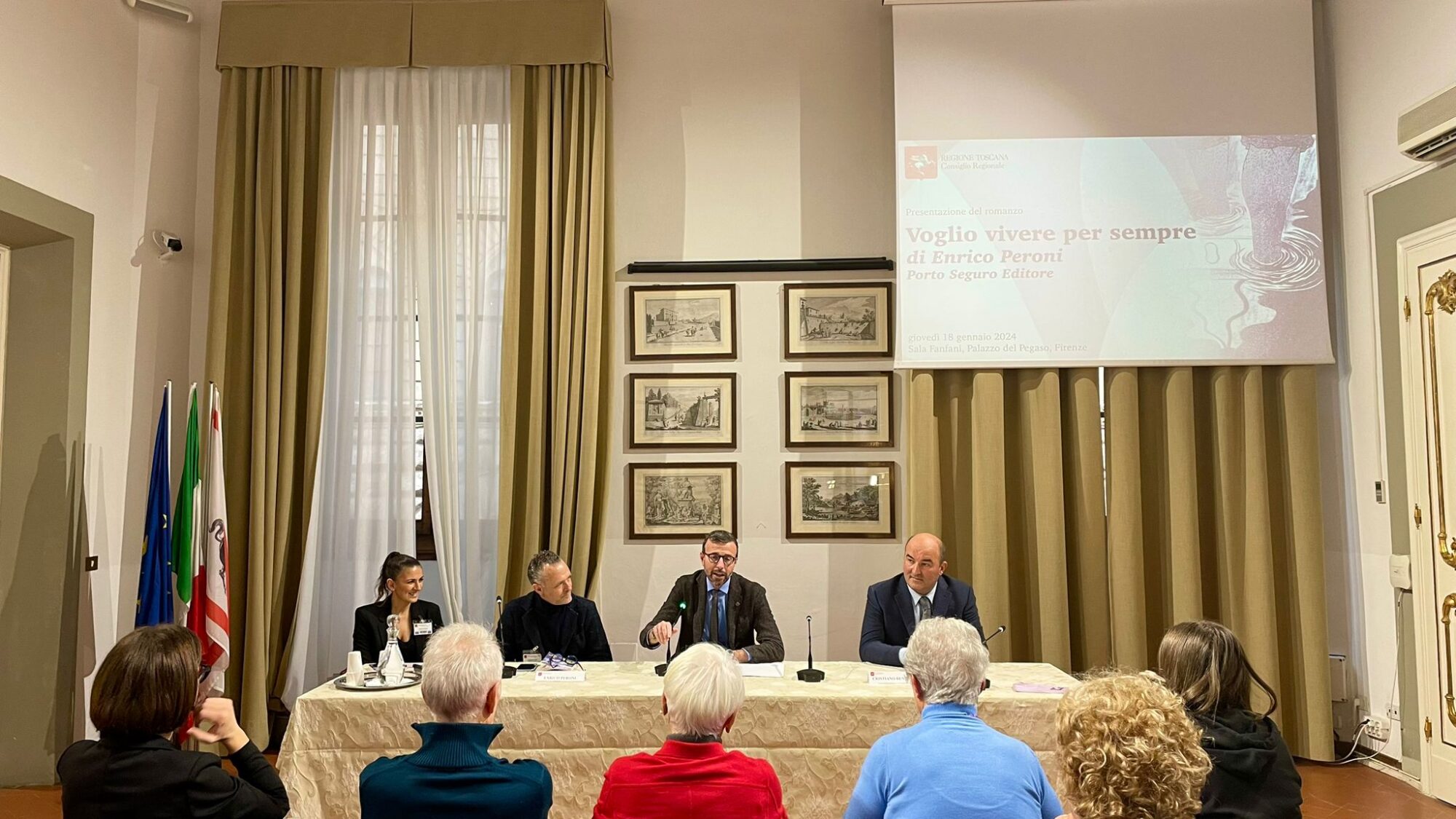 Firenze – Il presidente del Consiglio regionale della Toscana, Antonio Mazzeo, e il consigliere regionale Cristiano Benucci hanno presentato in sala Fanfani il libro di Enrico Peroni “Voglio vivere per sempre”. Ha moderato l’incontro Valentina Taranto alla presenza dell’autore. “Vivere per sempre” è un emozionante e intenso romanzo ambientato nella Firenze del 1966, durante i tragici giorni dell’alluvione. Sette Angeli del fango si incontrano durante la collaborazione e si confidano così profondamente da diventare stretti amici, ognuno conoscitore della storia e dell’intimità degli altri. La tragedia che colpisce Firenze accomuna i protagonisti e dà loro spunto di riflessione e discussione sulla precarietà della vita e sulla ricerca della vera felicità. Attraverso una favola apparentemente per bambini, scoperta in una scatola tra il fango, gli Angeli, scopriranno quale è il vero significato per “vivere per sempre”.