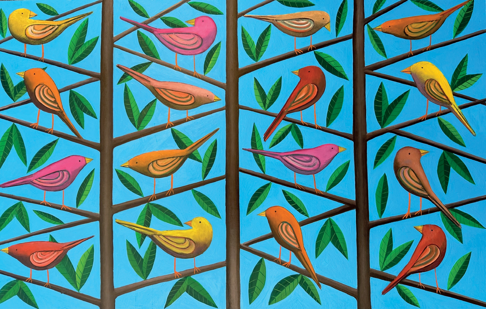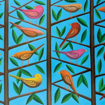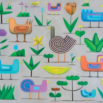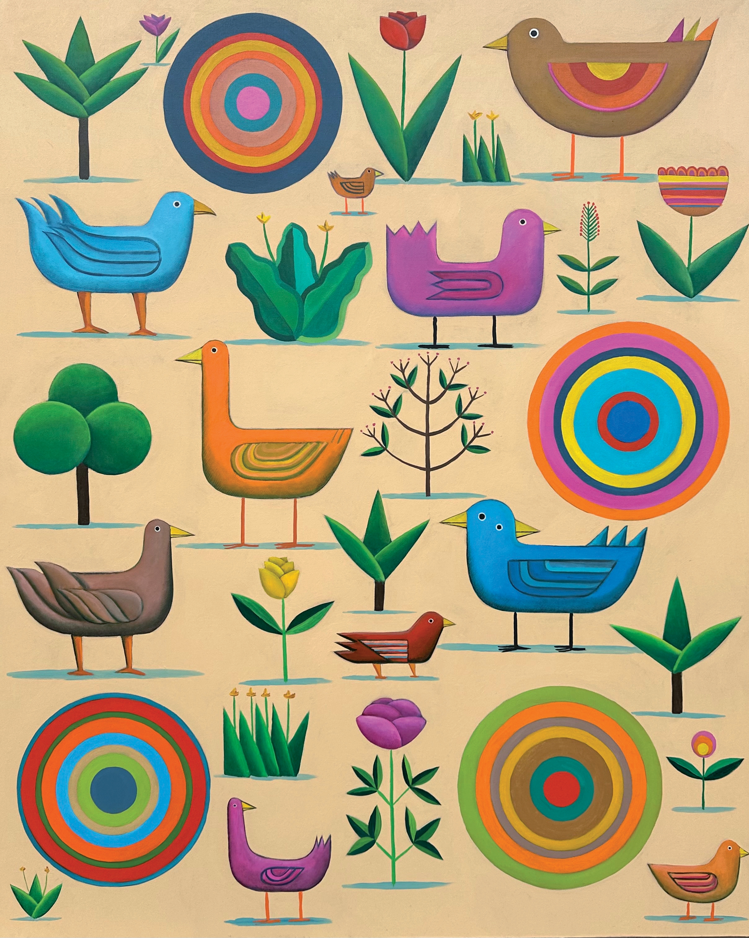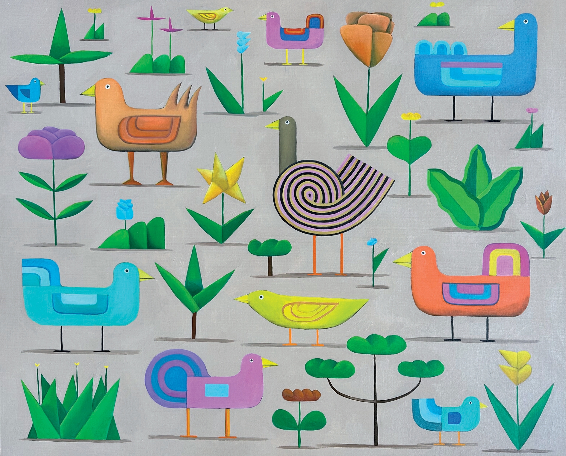 - Uccelli e piante, 130×150, 2023, olio su tela