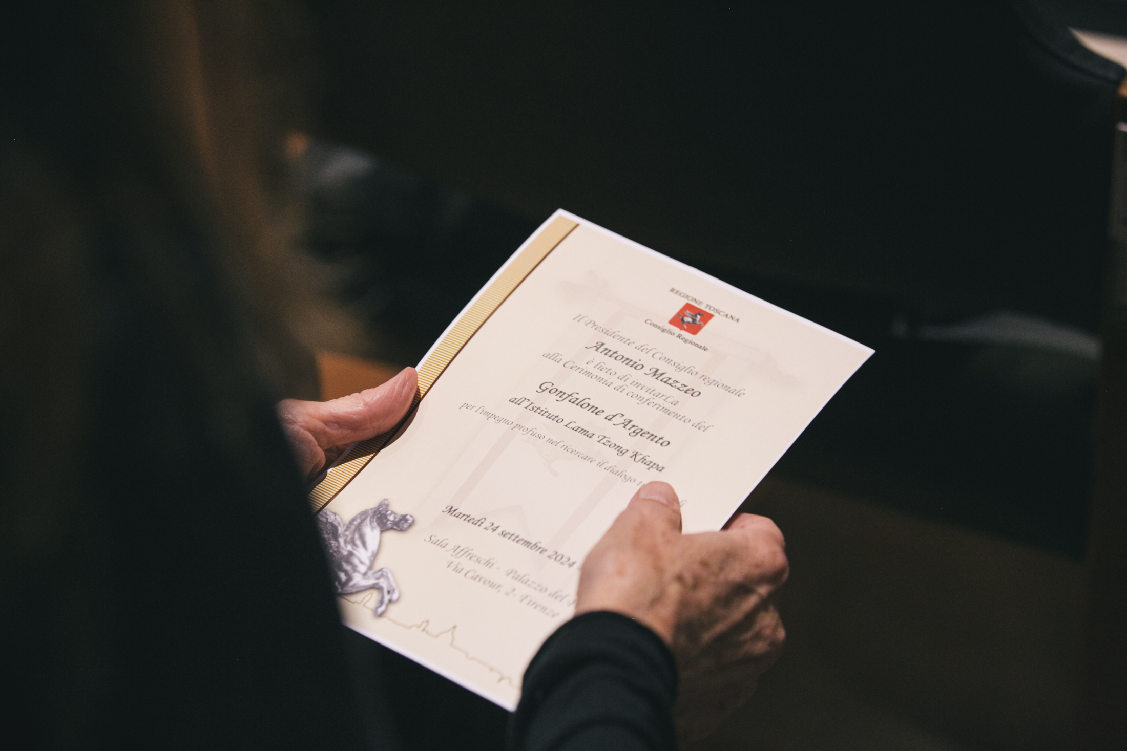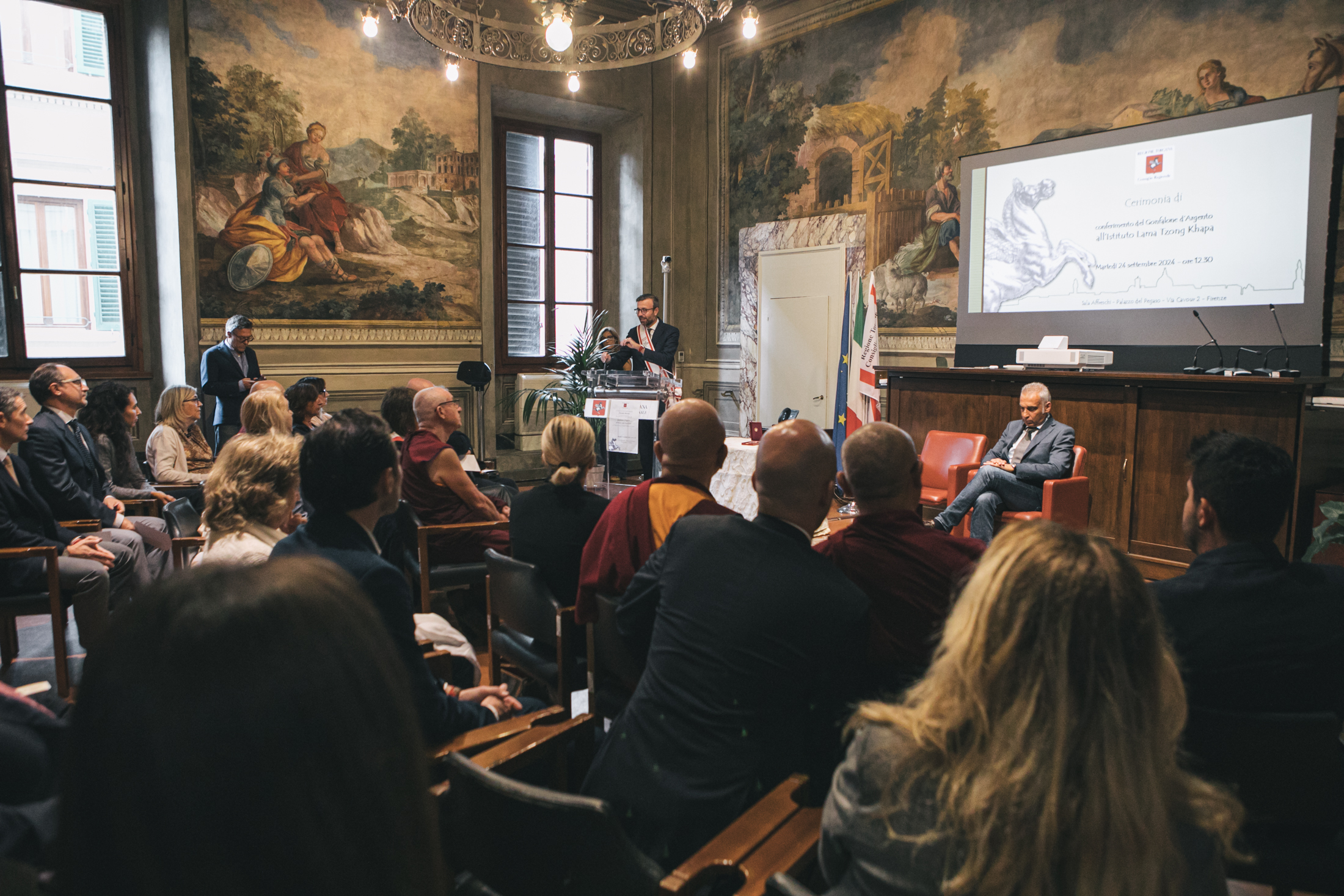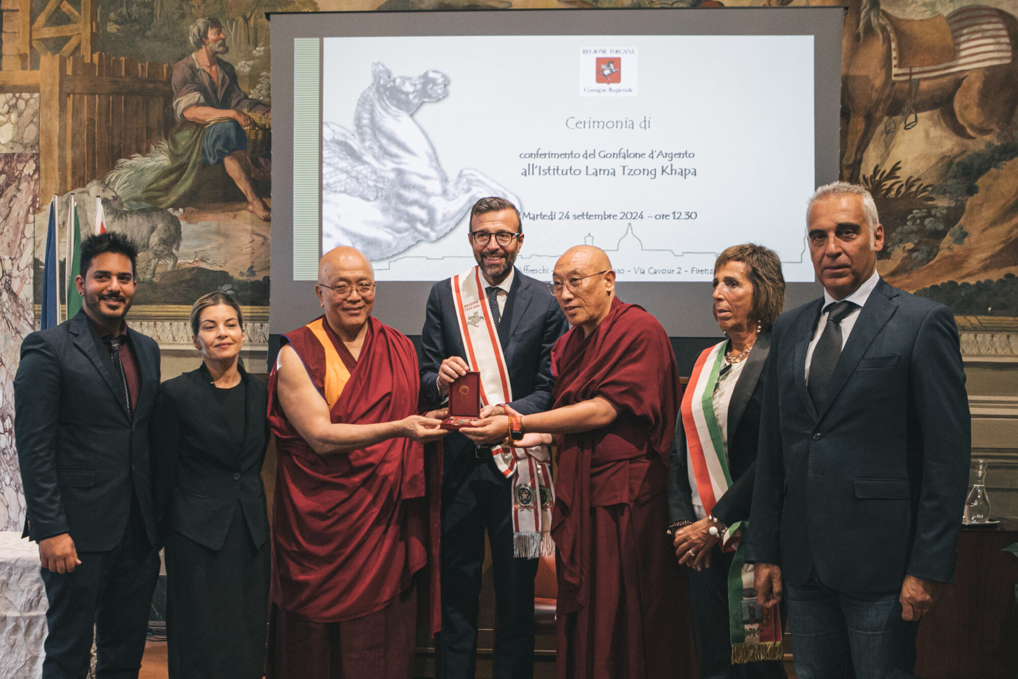 Firenze – Il presidente del Consiglio regionale Antonio Mazzeo ha consegnato il Gonfalone d’Argento all’Istituto Lama Tzong Khapa di Pomaia (Pisa) centro internazionale per lo studio e la pratica del buddismo tibetano tra i più importanti d’Europa, per l’impegno profuso nel ricercare il dialogo tra i popoli. Un riconoscimento proposto dal consigliere segretario Diego Petrucci, presente alla cerimonia, e votato all’unanimità dall’Ufficio di presidenza dell’Assemblea legislativa. A ricevere l’onorificenza la presidente dell’Istituto Lucia Landi.