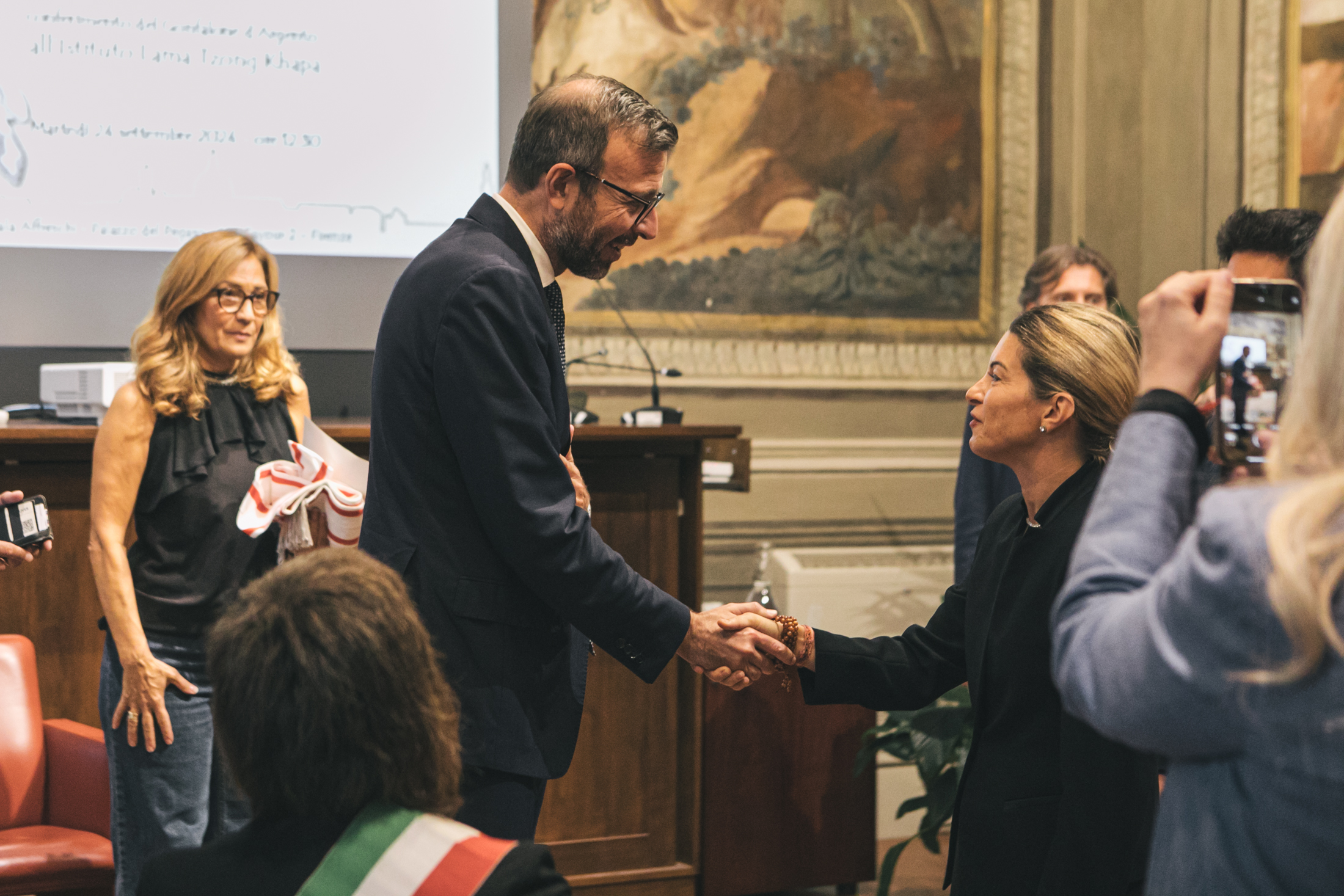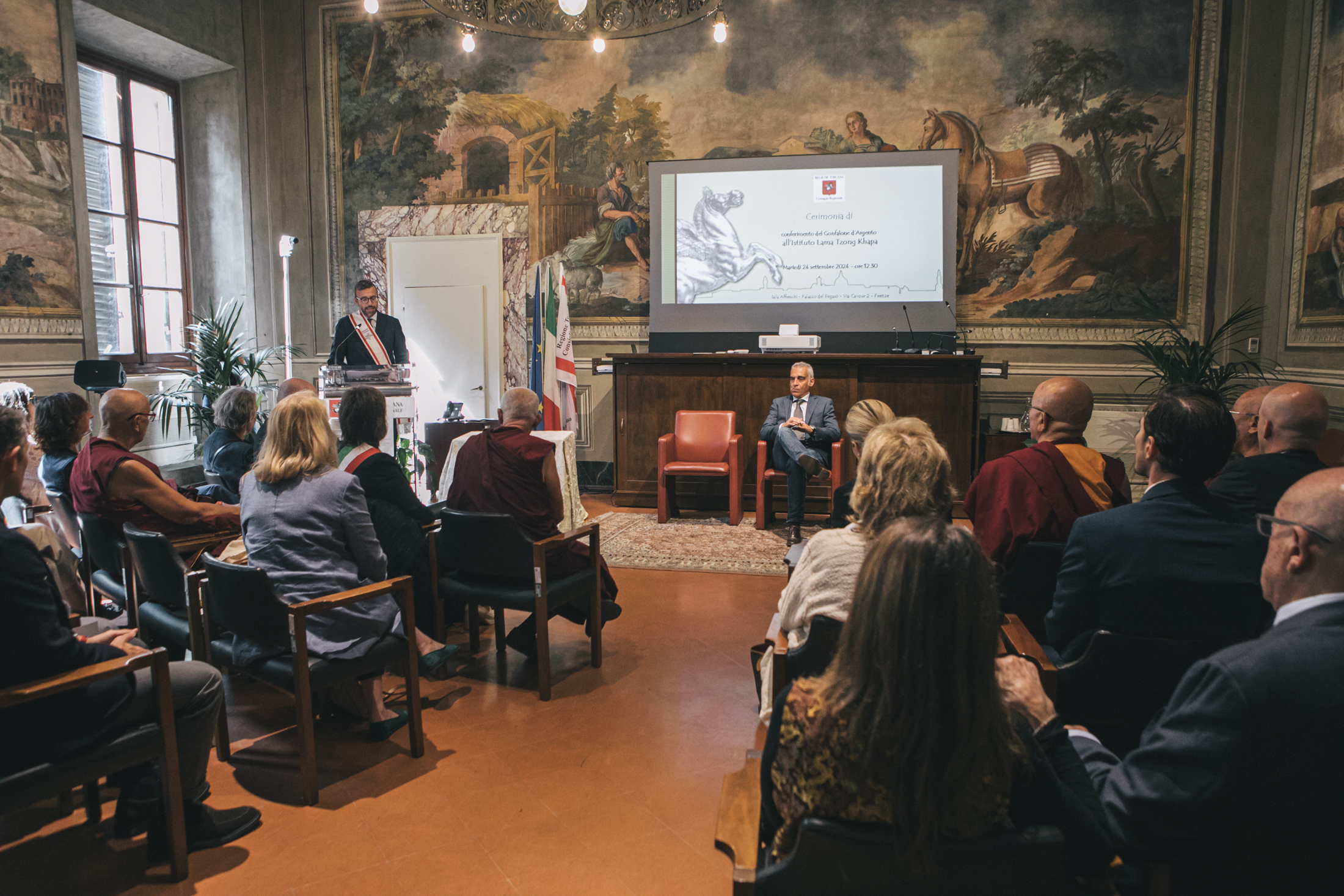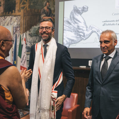 “Oggi è un giorno importante per i componenti di questa grande famiglia che dal 1977 porta avanti messaggi di pace, di inclusione e lo studio della tradizione buddista Mahāyāna”, ha sottolineato la presidente dell’Istituto Lucia Landi ricevendo il Gonfalone d’Argento. “Noi – ha spiegato – ci ispiriamo alle parole di sua sanità il Dalai Lama e di tutti i nostri maestri che ci hanno insegnato che l’Istituto è un posto aperto a tutti, è un luogo di pace dove poter aprire cuore e mente per trovare la tranquillità. Crediamo da sempre nel dialogo interreligioso, nell’accoglienza e nel diffondere uno spirito di fratellanza”.