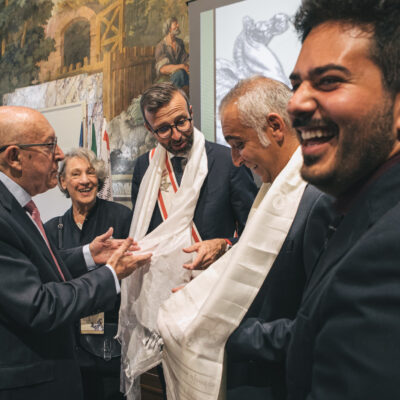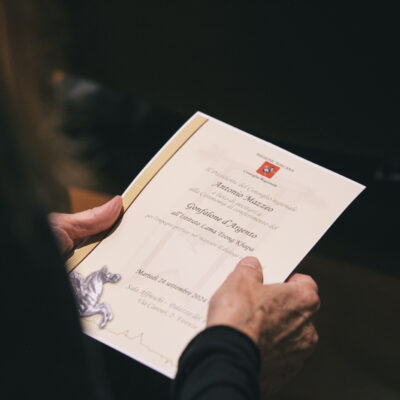 Erano presenti alla consegna del Gonfalone d’Argento il direttore dell’Istituto Valerio Tallarico, il venerabile Massimo Stordi, presidente Fondazione Sangha ETS e Angela Terzani Staude, scrittrice e moglie di Tiziano Terzani.