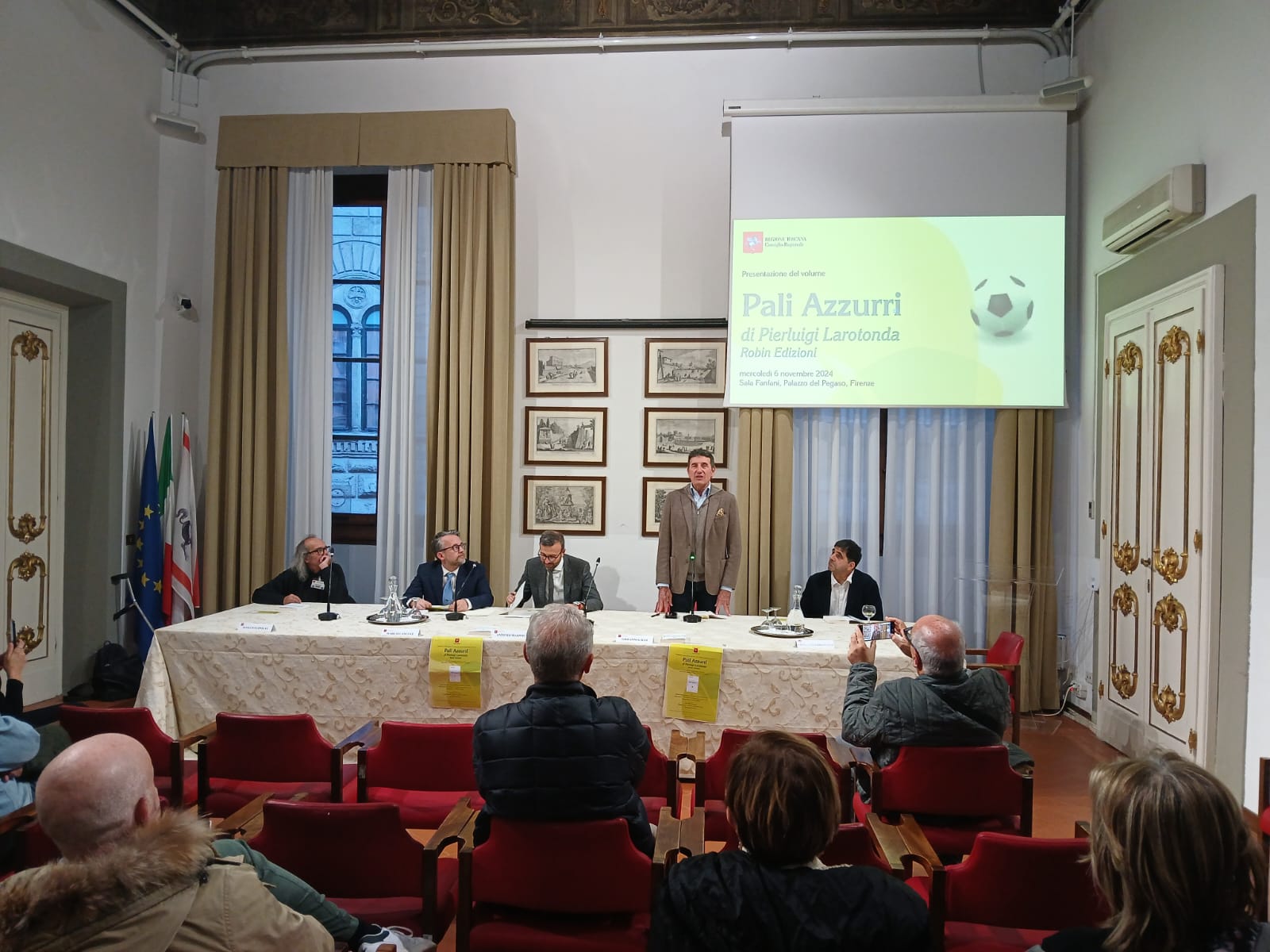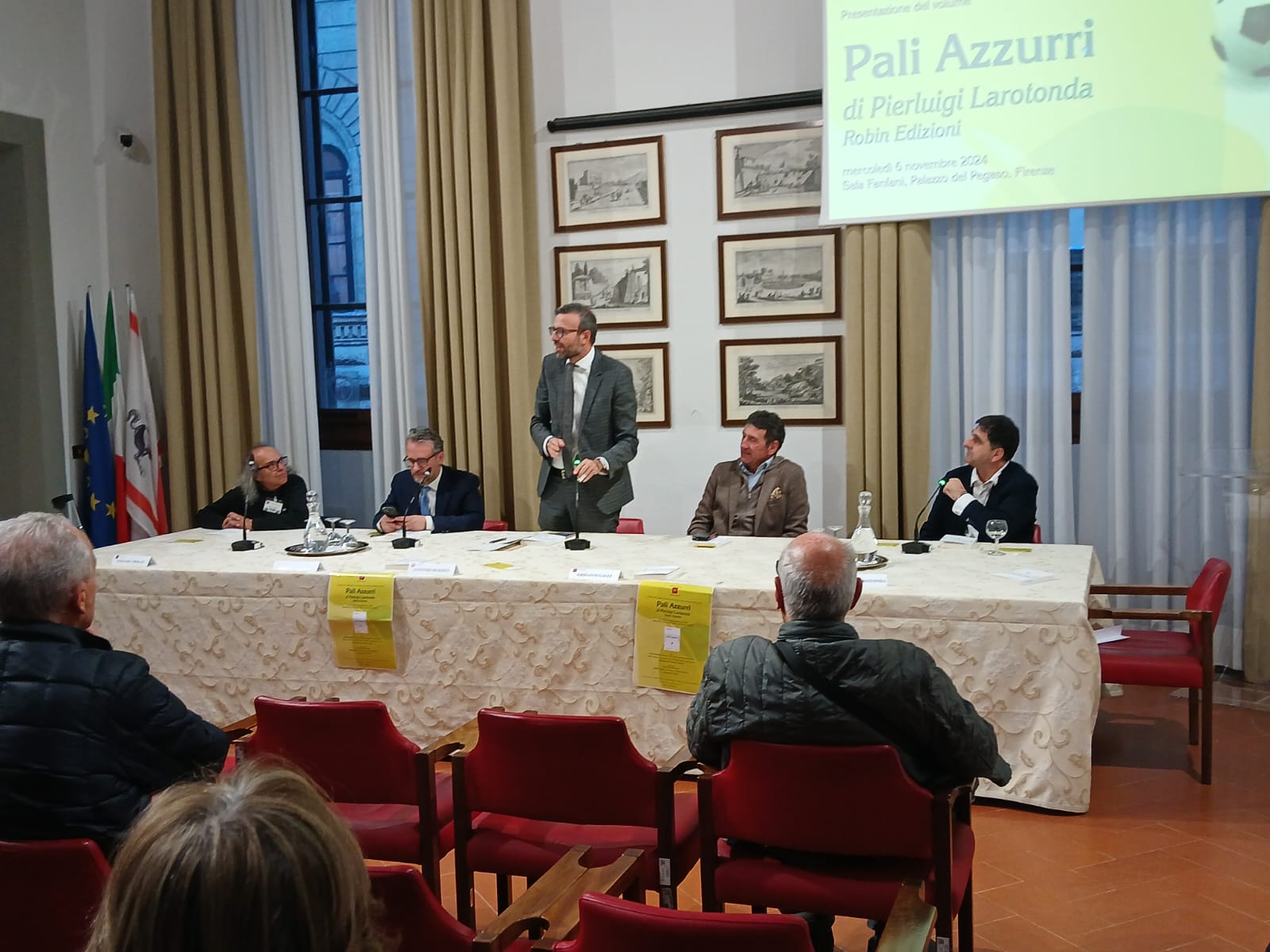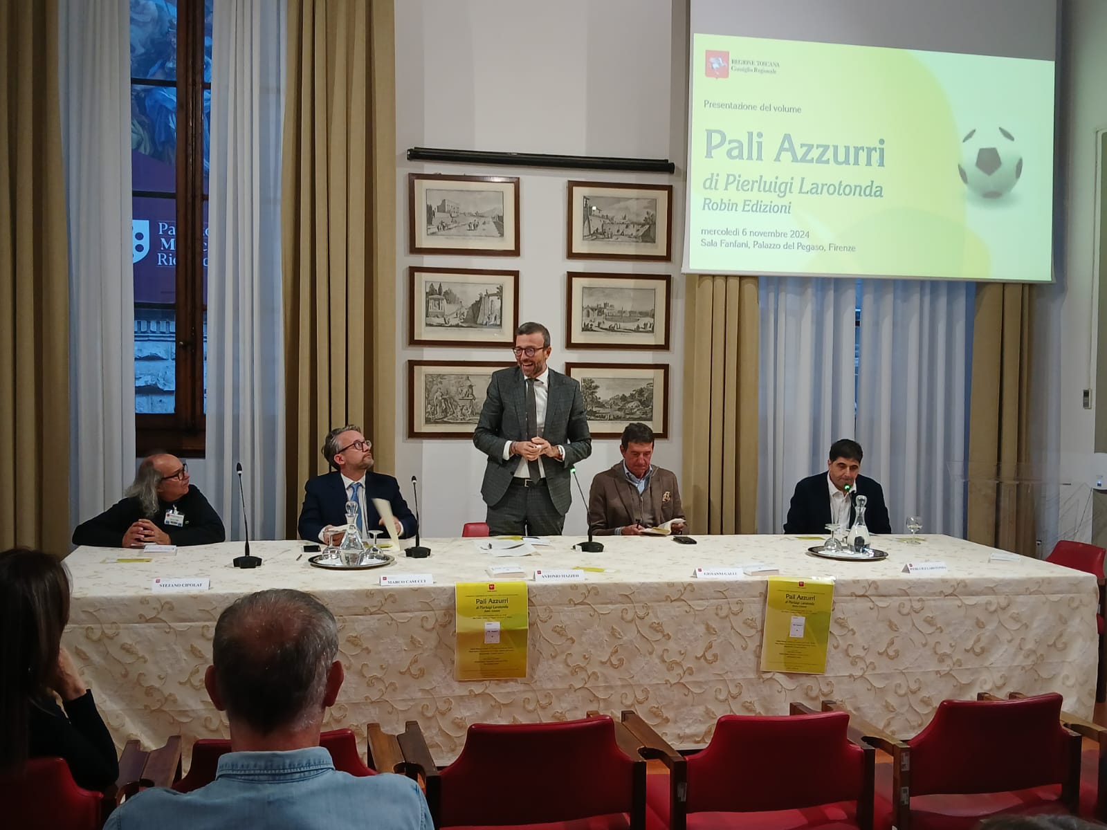 Firenze – Il calcio visto dalla parte del portiere, raccontato passando in rassegna i numeri uno della Nazionale italiana, dalla prima partita ufficiale del 1910 ai giorni nostri. Questo è ‘Pali Azzurri’, il libro di Pierluigi Larotonda, Robin edizioni, presentato ieri pomeriggio, mercoledì 6 novembre, nella sala Fanfani del palazzo del Pegaso. All’incontro hanno preso parte il presidente del Consiglio regionale della Toscana, Antonio Mazzeo, il vicepresidente Marco Casucci e il consigliere Giovanni Galli, già portiere della nazionale, che del libro ha scritto la prefazione. Con loro, l’autore e il disegnatore Stefano Cipolat, che ha arricchito con le illustrazioni i 69 profili proposti da Larotonda. In sala, anche il consigliere regionale Marco Martini.