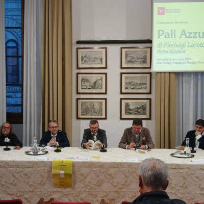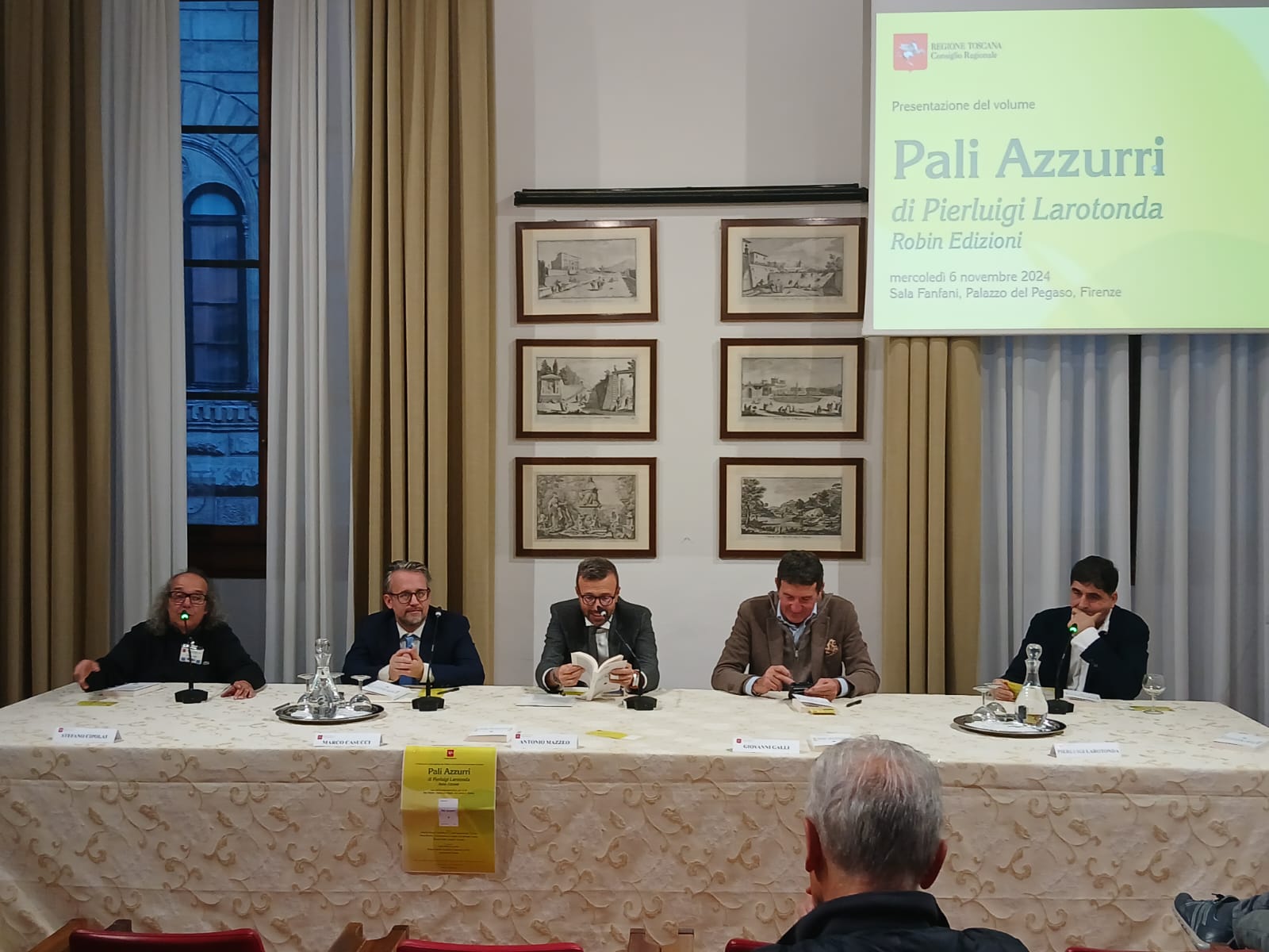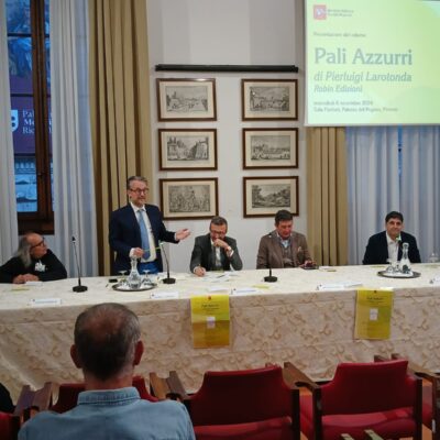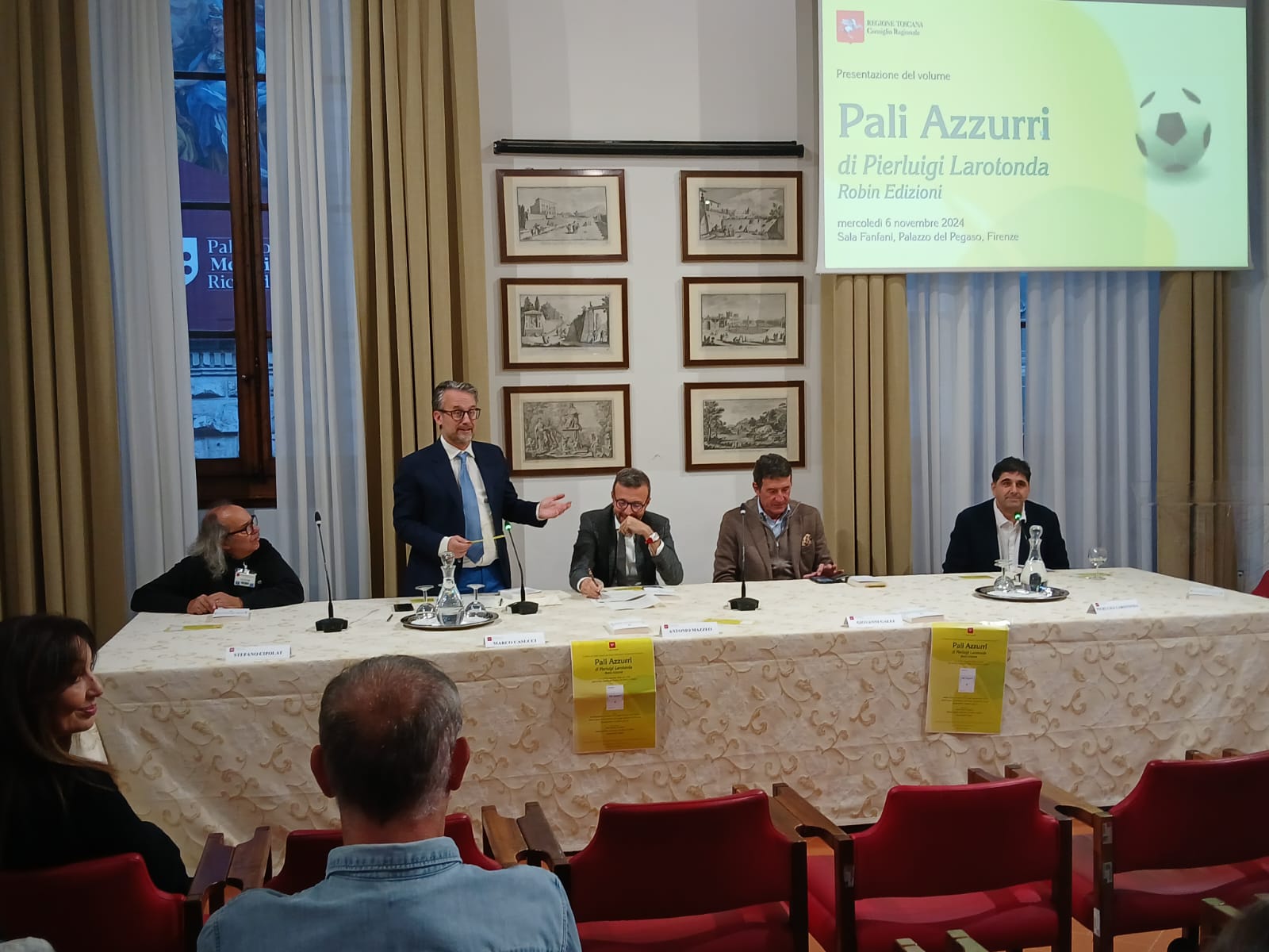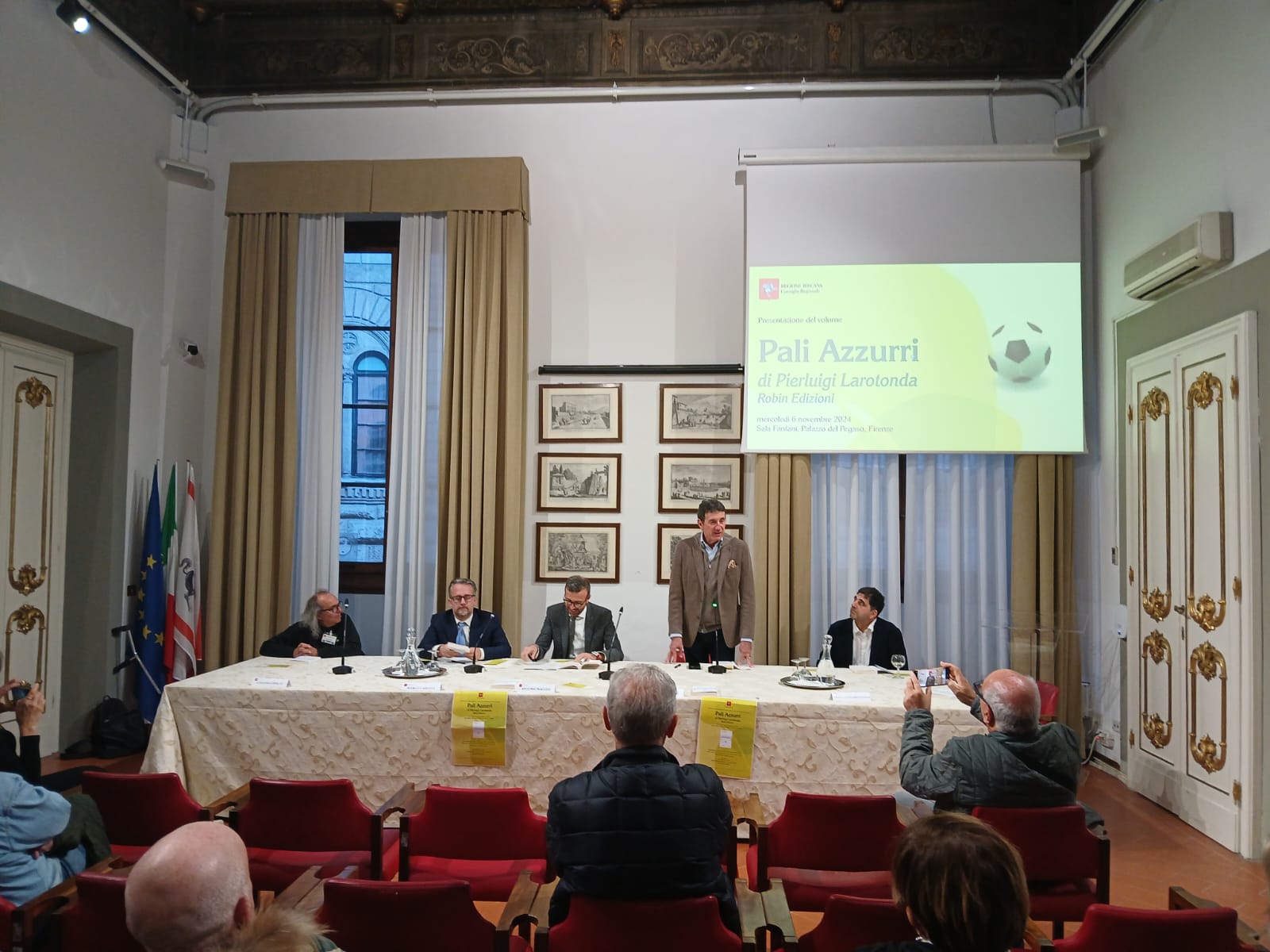 Firenze – Il calcio visto dalla parte del portiere, raccontato passando in rassegna i numeri uno della Nazionale italiana, dalla prima partita ufficiale del 1910 ai giorni nostri. Questo è ‘Pali Azzurri’, il libro di Pierluigi Larotonda, Robin edizioni, presentato ieri pomeriggio, mercoledì 6 novembre, nella sala Fanfani del palazzo del Pegaso. All’incontro hanno preso parte il presidente del Consiglio regionale della Toscana, Antonio Mazzeo, il vicepresidente Marco Casucci e il consigliere Giovanni Galli, già portiere della nazionale, che del libro ha scritto la prefazione. Con loro, l’autore e il disegnatore Stefano Cipolat, che ha arricchito con le illustrazioni i 69 profili proposti da Larotonda. In sala, anche il consigliere regionale Marco Martini.
