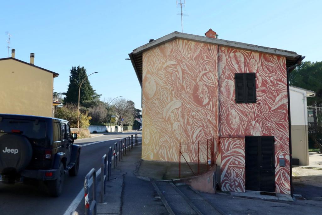 L’opera di Muz si intitola “Costruzioni #5”. Incontrate le classi del liceo artistico Virgilio e preso visione dei loro elaborati, l’artista ha individuato i soggetti in grado di rispecchiare la visione della città da parte dei ragazzi: piazza Farinata degli Uberti, con la Collegiata di Sant’Andrea, e il Santuario della Madonna del Pozzo. Ha adottato entrambi gli spunti distribuendoli uno nella parte inferiore e l’altro in quella superiore della torretta di e-Distribuzione e della costruzione adiacente, in viale Palestro. Per quanto riguarda il primo livello, l’idea alla base è stata riproporre, grazie anche a un gioco di prospettiva cromatico, il portico del santuario cercando di inglobare la porta trasformandola nell’entrata. Per quanto riguarda, il livello superiore, il soggetto preso in esame è stato la Collegiata. Per la parte centrale, cercando anche qui di inglobare le due finestre presenti, è stato utilizzato e reinterpretato il piccolo timpano centrale presente sulla facciata della chiesa. Per le parti laterali, la forma è stata ricavata dalla vetrata policroma dietro l’altare maggiore, riproponendo, grazie a un gioco cromatico, un effetto di illuminazione interna. Interessante il collegamento che si crea con l’elemento del vetro, produzione storica presente sul territorio empolese.