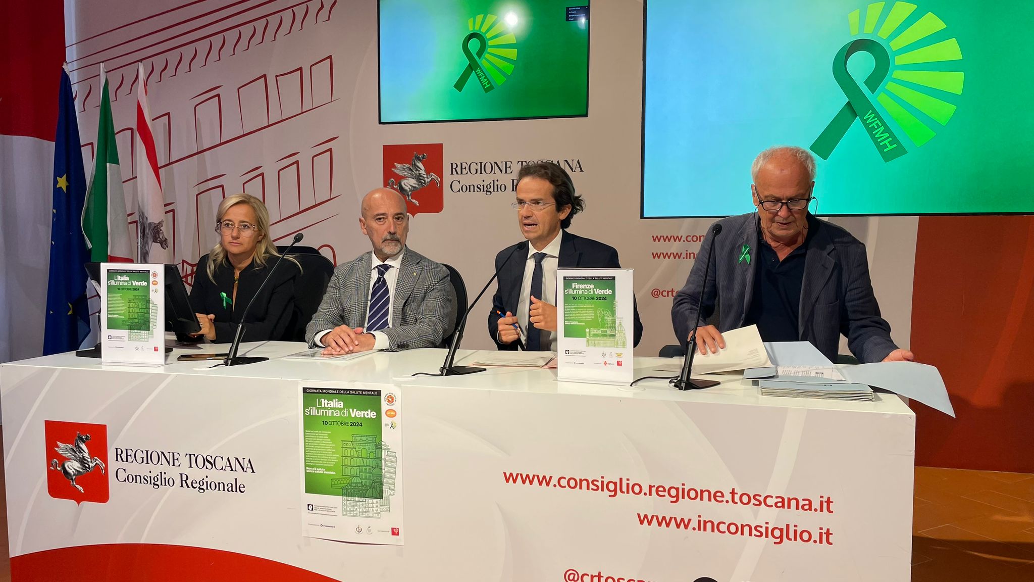 Firenze – Quattordici gli eventi che, a partire da sabato 28 settembre fino a sabato 10 ottobre, si svolgeranno sul territorio toscano in occasione della Giornata mondiale della salute mentale 2024, quando anche palazzo del Pegaso, sede del Consiglio regionale, aderirà all’iniziativa “L’Italia si illumina di verde”. Il programma, promosso dal Coordinamento Toscano delle Associazioni per la Salute Mentale, è stato presentato questa mattina a palazzo del Pegaso. Sono intervenuti Enrico Sostegni, presidente della commissione Sanità del Consiglio regionale, Fabrizio Starace, presidente della Società Italiana di Epidemiologia Psichiatrica, Galileo Guidi, presidente del Coordinamento Toscano delle Associazioni di Salute Mentale, Chiara Pellitti, delegata dal Coordinamento per la Federazione Mondiale della Salute Mentale WFMH.