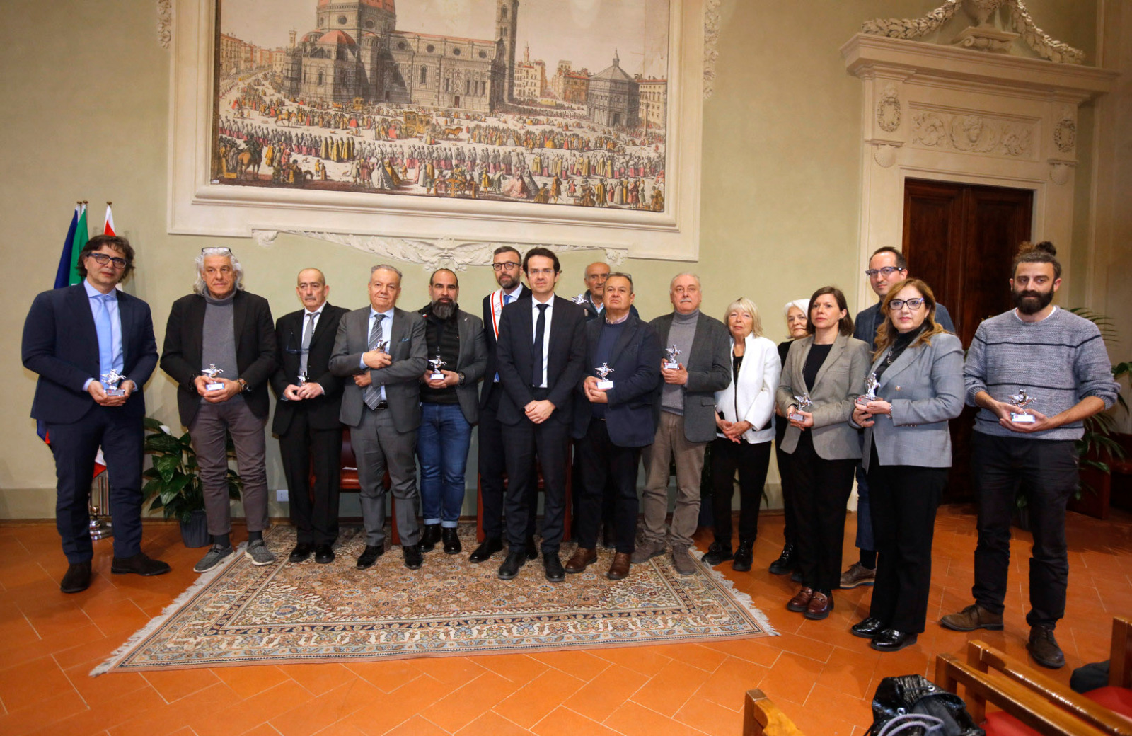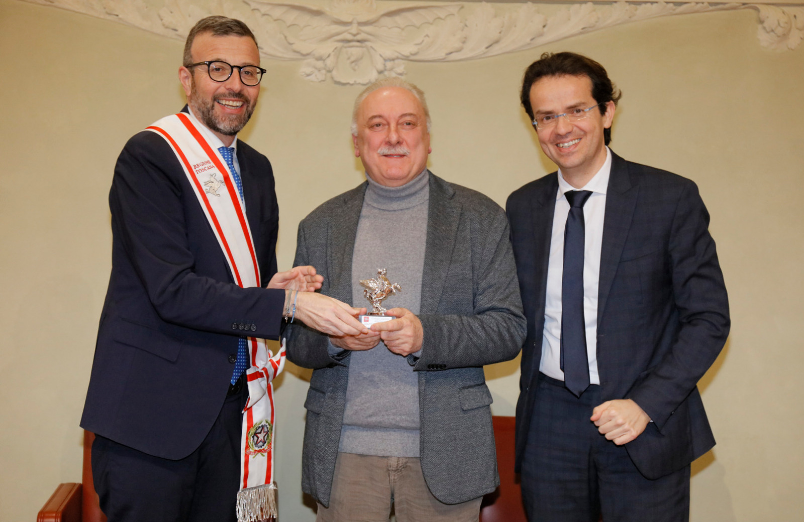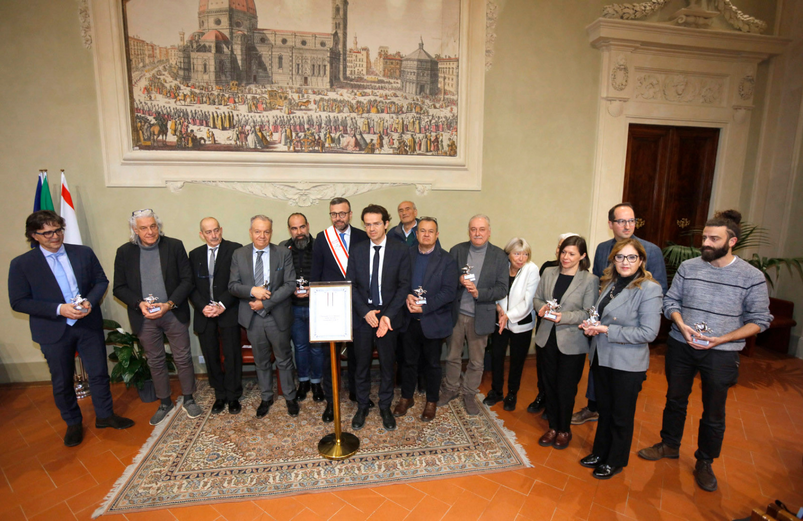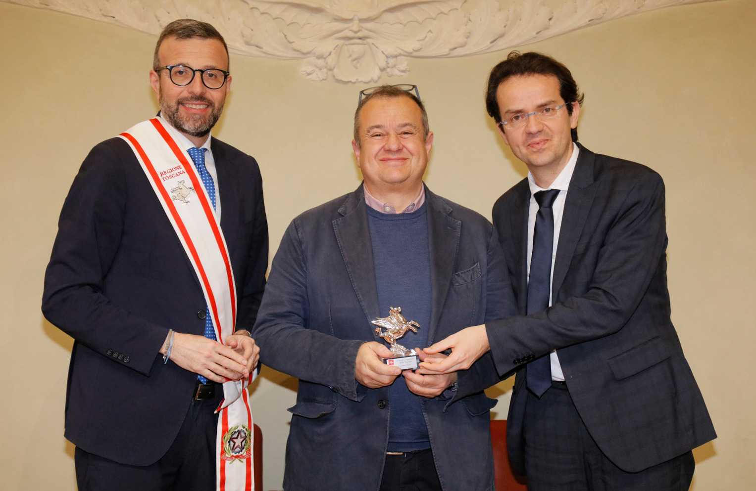 Una targa raffigurante il Gonfalone d’argento, idealmente consegnato a tutti gli operatori della sanità, resterà esposta da oggi nelle sale del palazzo del Pegaso, con l’iscrizione “Al personale socio sanitario della Toscana vittima del Covid-19, nel ricordo del sacrificio della propria vita”. Il Trofeo Pegaso, statuetta raffigurante il Pegaso alato, è stato consegnato a ciascun ordine e organizzazione. Erano presenti la presidente Rosa Barone per l’Ordine degli assistenti sociali della Toscana; il vice presidente Simone Mangini, per Ordine degli psicologi; il presidente Renato Fani, per l’Ordine dei biologi della Toscana e dell’Umbria; il coordinatore regionale Salvatore Ingrosso, per l’Ordine dei farmacisti; Lorenzo Vanni per l’Ordine dei Medici Chirurghi e Odontoiatri della Toscana, che accoglie “questo riconoscimento in nome e per conto dei 383 colleghi deceduti in Italia per il Covid”, le presidenti Antonella Cinotti e Martha Traupe per l’Ordine della professione di ostetrica; il presidente Opi Livorno, Lorenzo Taddeucci, per l’Ordine delle professioni infermieristiche; Adriana Taddeucci, del consiglio direttivo dell’Ordine regionale dei chimici e dei fisici; Raffaele Lamanna, vicepresidente dell’Ordine dei tecnici sanitari di radiologia medica e professioni sanitarie tecniche della riabilitazione e della prevenzione; il portavoce del Forum Terzo Settore della Toscana, Gianluca Mengozzi, che: il presidente Anpas Pubbliche Assistenze Toscane, Dimitri Bettini; il segretario regionale della Croce rossa italiana Comitato Regionale Toscana, Pasquale Morano, e Andrea Ceccherini, membro esecutivo regionale della Federazione regionale delle Misericordie della Toscana. Alla cerimonia, che si è tenuta nella sala del Gonfalone, hanno assistito anche la consigliera Silvia Noferi e il consigliere Marco Martini.