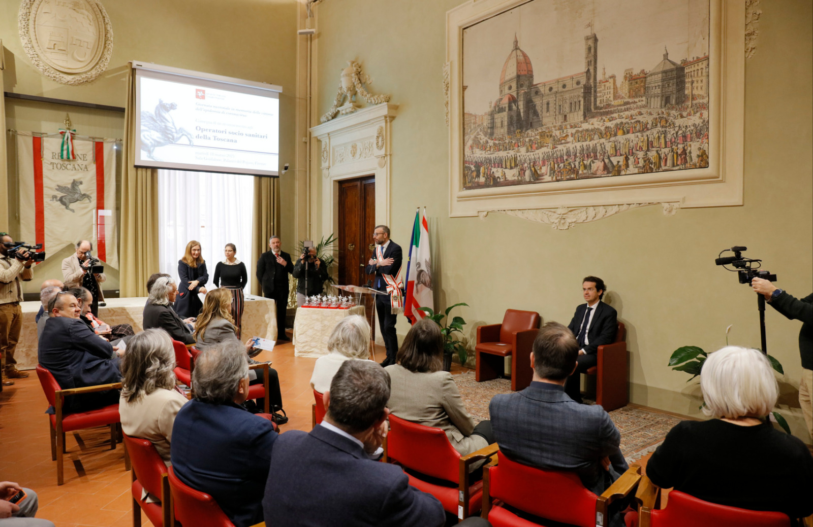 Firenze – “Abbiamo voluto questo riconoscimento per ricordare tutti gli ordini professionali, le associazioni di volontariato, medici, infermieri, personale socio sanitario, quanti con impegno e dedizione si sono prodigati in quei mesi, fino al punto, per molti di loro, di perdere la vita”. Con queste parole, il presidente del Consiglio regionale della Toscana, Antonio Mazzeo, ha aperto questo pomeriggio, martedì 18 marzo 2025, a palazzo del Pegaso la cerimonia di consegna del riconoscimento agli operatori socio sanitari della Toscana, in occasione della Giornata nazionale in memoria delle vittime dell’epidemia di coronavirus. “Siamo qui per ricordare chi ha perso la vita e per dire ancora grazie a chi continua ad impegnarsi nel proprio lavoro – ha aggiunto il presidente –, con il sentimento profondo per la cura dell’altro. Dire grazie a queste donne e a questi uomini è un dovere morale. Il modo migliore per farlo è prenderci l’impegno di richiedere più investimenti nella sanità pubblica. Dobbiamo mettere in campo tutte le risorse possibili per permettere agli operatori di svolgere il proprio lavoro in sicurezza, costruire le condizioni per assumere più personale medico e sanitario e assicurare retribuzioni adeguate”.