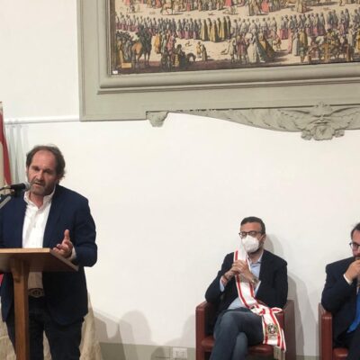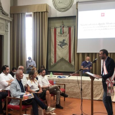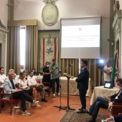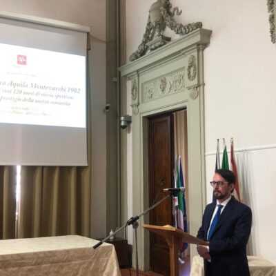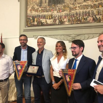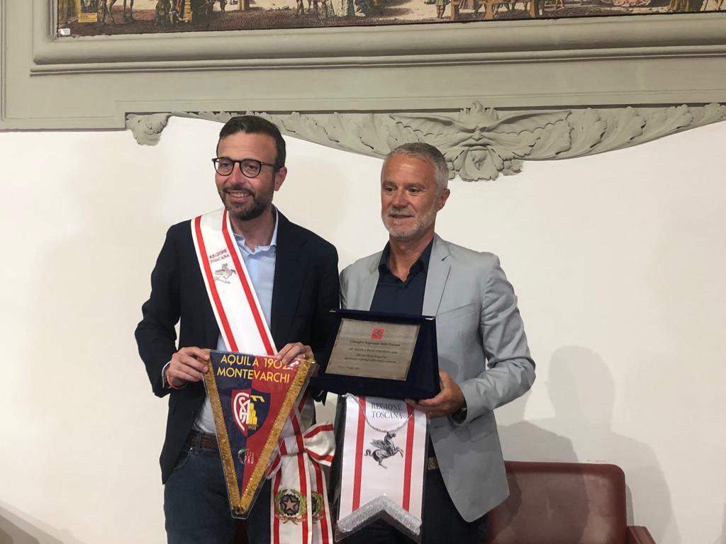 Firenze – Una targa del Consiglio regionale della Toscana per ricordare i 120 anni di storia sportiva dell’Aquila Montevarchi 1902, la più antica società calcistica della Toscana. La cerimonia si è svolta questa mattina. mercoledì 6 luglio, nella sala Gonfalone di palazzo del Pegaso. È stato il presidente dell’Assemblea legislativa, Antonio Mazzeo, a consegnare il riconoscimento nelle mani del vicepresidente del club, Andrea Romei. ‘120 anni di storia sportiva, patrimonio e prestigio della nostra comunità’ è la motivazione incisa sulla targa. Il conferimento è stato deciso all’unanimità dall’Ufficio di presidenza grazie alle iniziative del vicepresidente Marco Casucci e del consigliere regionale Gabriele Veneri. Alla cerimonia hanno preso parte anche il sindaco di Montevarchi e presidente dalla Provincia di Arezzo, Silvia Chiassai Martini, e l’assessore comunale allo sport Lorenzo Allegrucci.