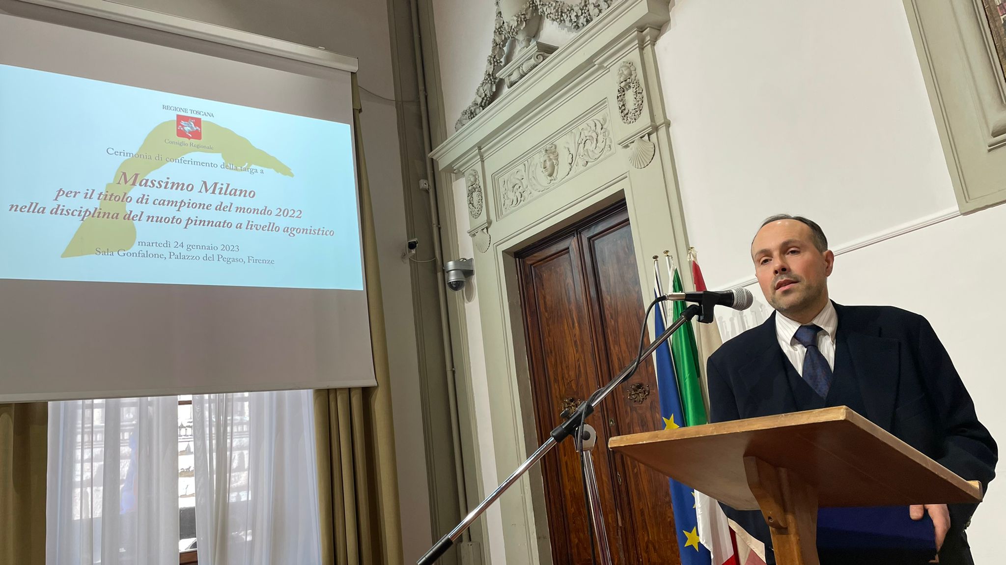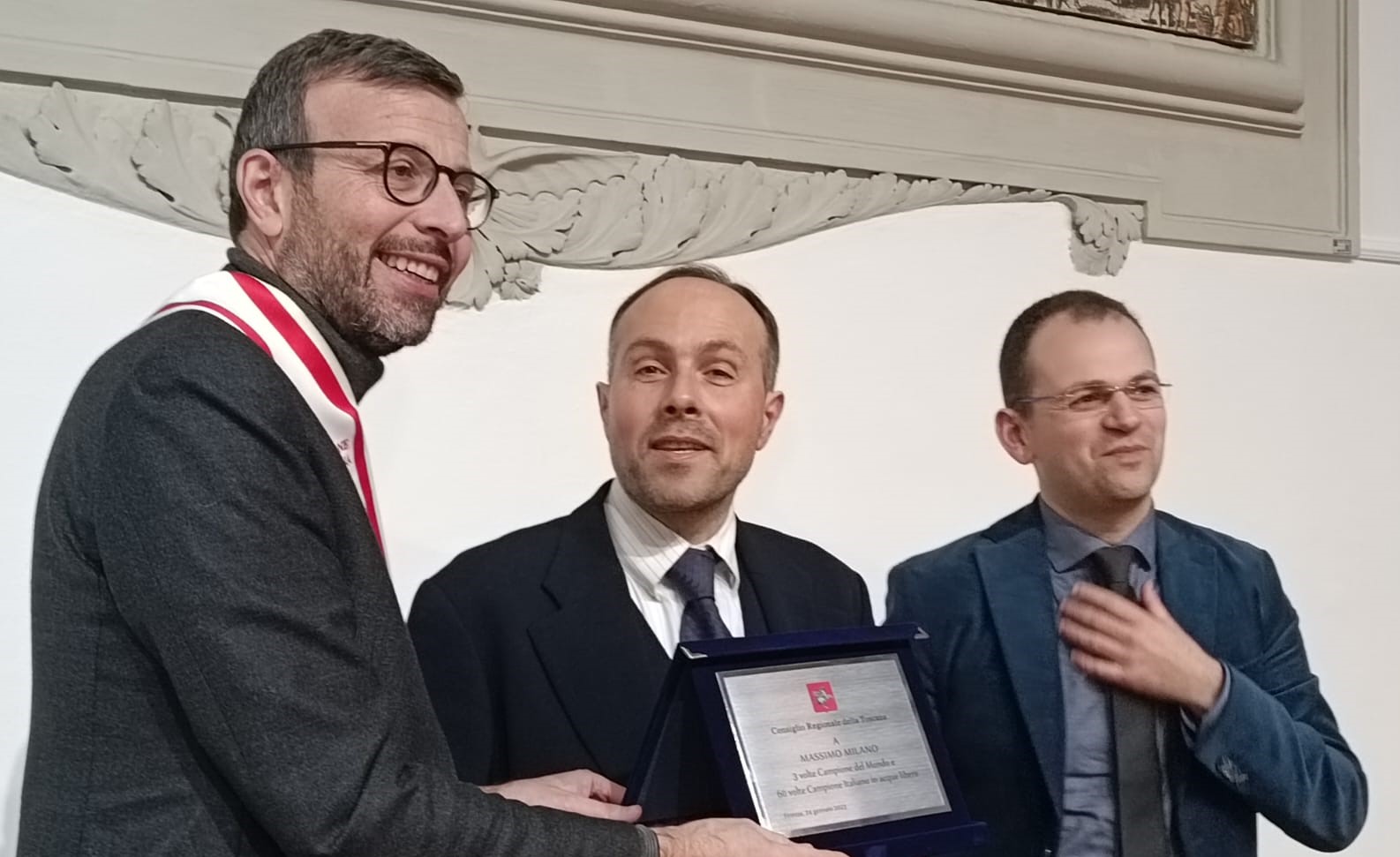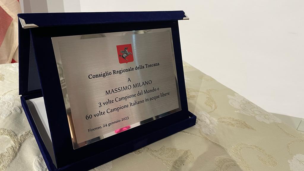 Firenze – Una targa per celebrare l’uomo, lo sportivo, il campione. Il Consiglio regionale della Toscana consegna a Massimo Milano, tre volte campione del mondo e 60 volte campione italiano in acque libere nella disciplina del nuoto pinnato, un riconoscimento come segno di attenzione e impegno verso quelli che possono essere considerati sport minori ma che nulla hanno da invidiare a specialità più conosciute. “Abbiamo fatto una scelta: dare voce a chi ne ha meno e raccontare le belle storie della nostra Toscana. Lo stiamo facendo nel mondo dell’università, della ricerca, nell’associazionismo sportivo e non a caso stiamo premiando le società più longeve, quelle che hanno raggiunto i 100 anni di storia” commenta il presidente dell’Assemblea legislativa Antonio Mazzeo.