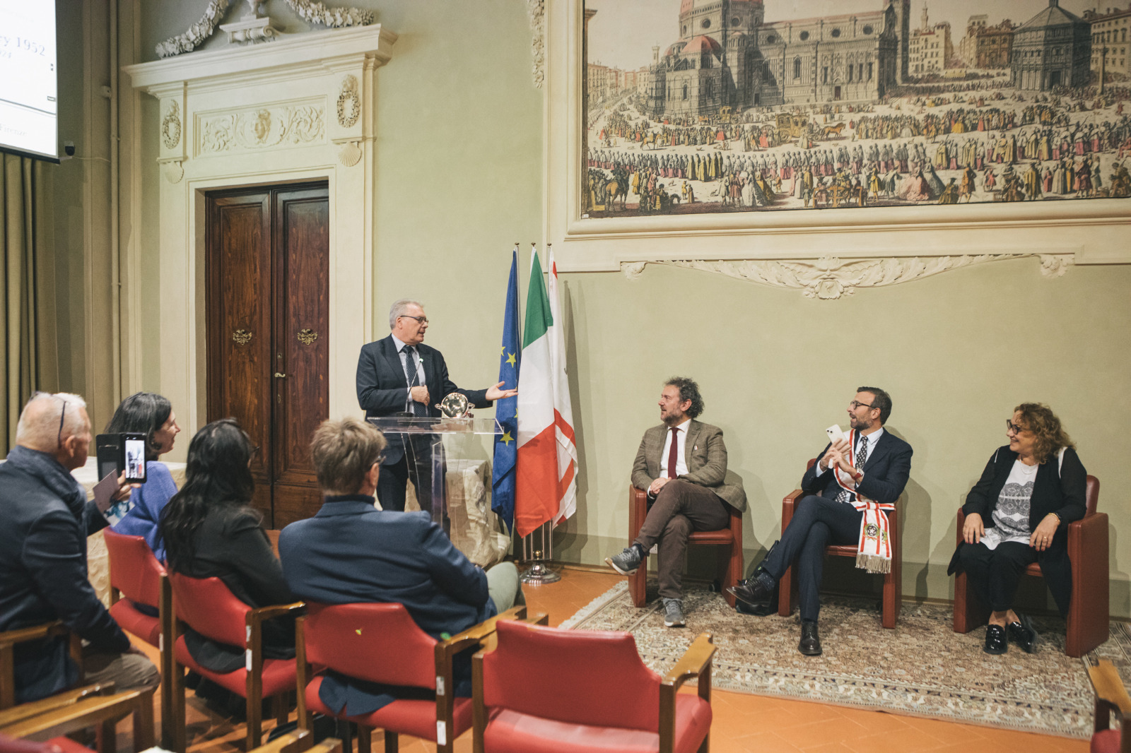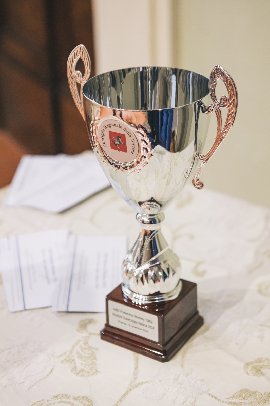 Firenze – La Supercoppa italiana 2024 è il più recente di una serie di successi che l’Asd Follonica Hockey 1952 è determinata ad arricchire. Il Consiglio regionale della Toscana ne ha voluto celebrare i risultati raggiunti nell’hockey su pista e attraverso il presidente dell’Assemblea toscana, Antonio Mazzeo, ha consegnato una coppa al presidente del club, Franco Ciullini, per festeggiare il più recente trionfo. Accanto a Mazzeo, il consigliere segretario questore, Francesco Gazzetti, che ha portato la proposta in Ufficio di presidenza, e la consigliera Donatella Spadi, che da quel territorio proviene e ha preso l’iniziativa per far sì che il Consiglio regionale conferisse il riconoscimento al club. Per la società, presenti anche il direttore sportivo Riccardo Checchi e il team manager Claudio Poggiali.