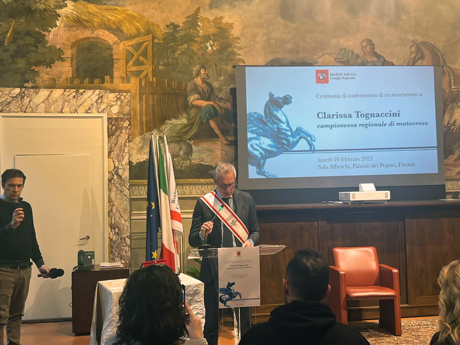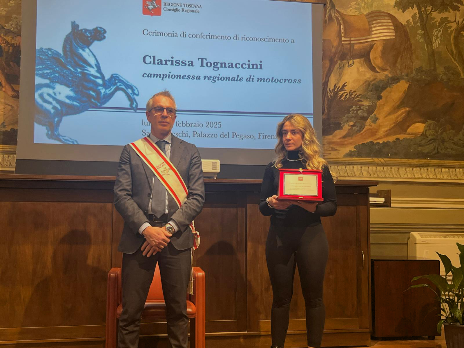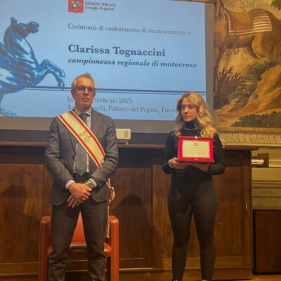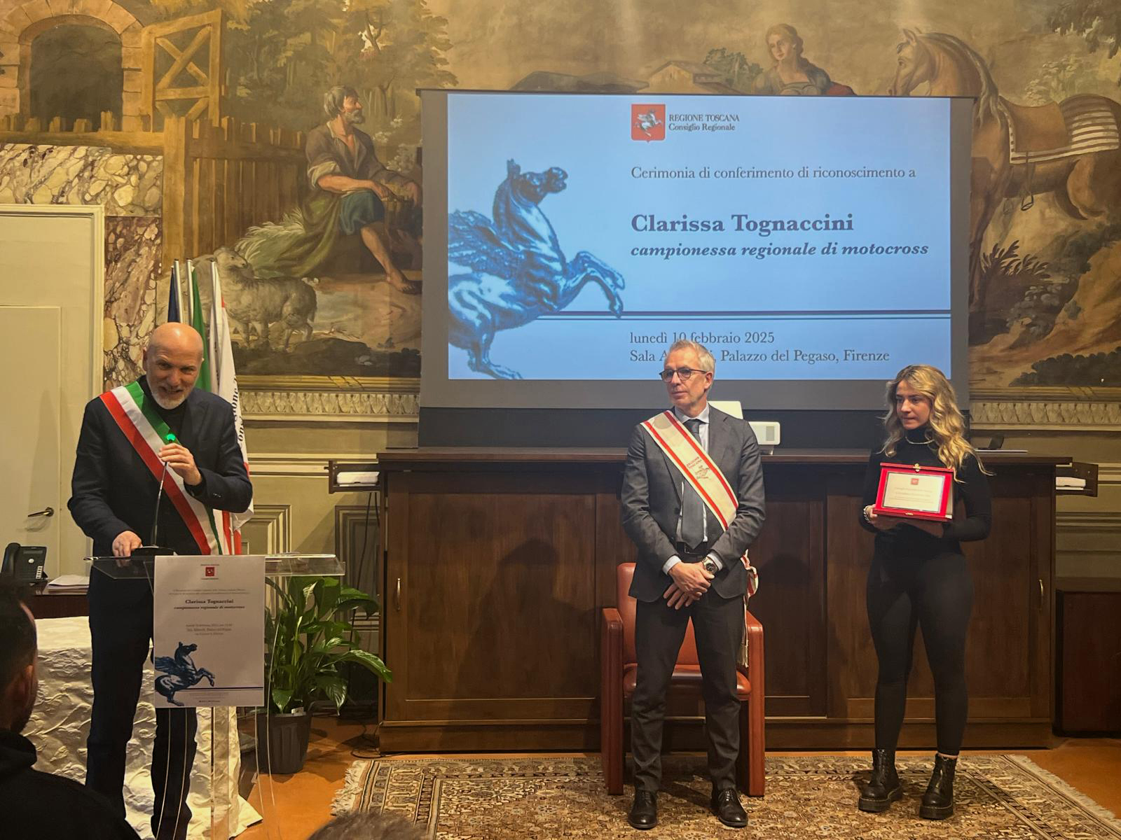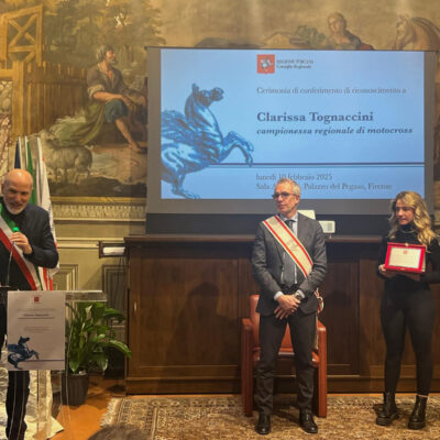 Firenze – Il Consiglio regionale della Toscana ha voluto premiare la campionessa regionale di motocross Clarissa Tognaccini per i successi ottenuti, il coraggio e l’impegno nel rappresentare lo sport femminile nel motociclismo. La cerimonia di consegna della targa da parte del vicepresidente dell’Assemblea legislativa Stefano Scaramelli si è tenuta nella sala Affreschi di palazzo del Pegaso lunedì 10 febbraio. Hanno partecipato i consiglieri regionali Elisa Tozzi, che ha proposto il riconoscimento all’Ufficio di presidenza dell’Assemblea legislativa toscana, Cristiano Benucci, Fiammetta Capirossi e Vincenzo Ceccarelli. Sono intervenuti il sindaco di Reggello Piero Giunti e l’allenatore di Clarissa Floriano Raspanti.