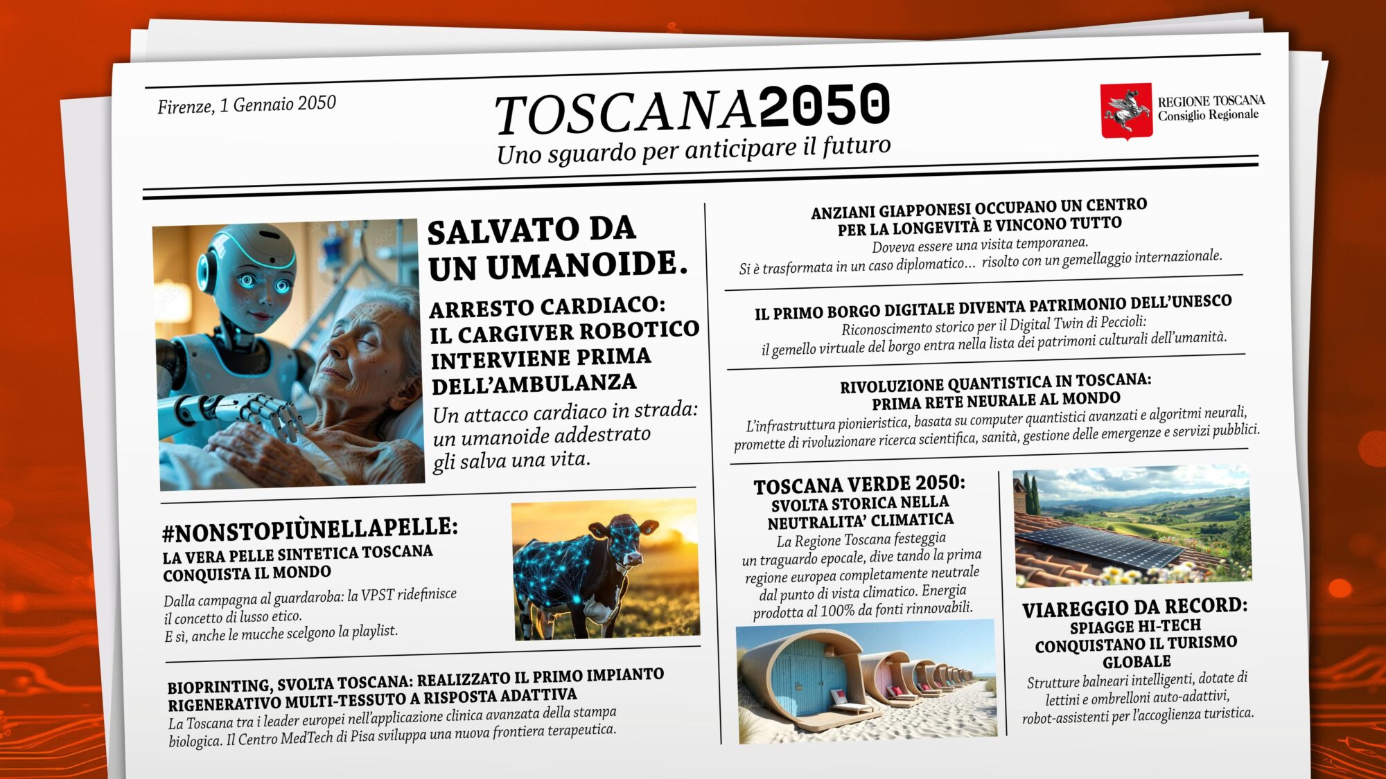 Firenze – L’evento ‘Toscana 2050 – Uno sguardo per anticipare il futuro’ si è concluso facendo un salto temporale di 25anni. Grazie all’intelligenza artificiale l’esperta di futuri, AI ed educazione Cristina Pozzi ha presentato quella che potrebbe essere la prima pagina di un giornale del 2050. Tanti i titoli che hanno acceso la curiosità e il dibattito da ‘Salvato da un umanoide, il caregiver robotico interviene prima dell’ambulanza’ a ‘Anziani giapponesi occupano un centro per la longevità’ fino a ‘Toscana Verde 2050, svolta storica nella neutralità climatica’, con l’energia prodotta al 100% da fonti rinnovabili.