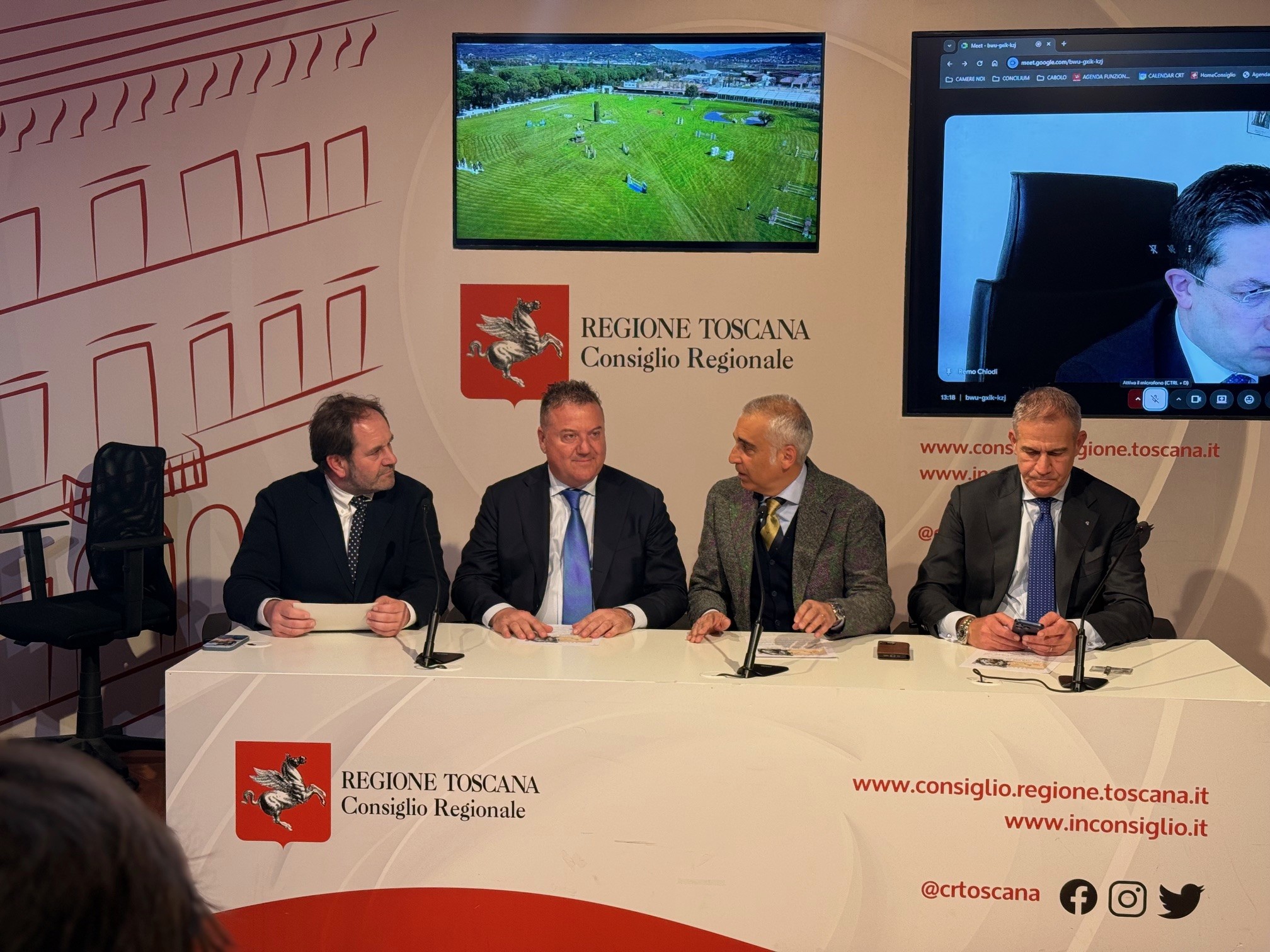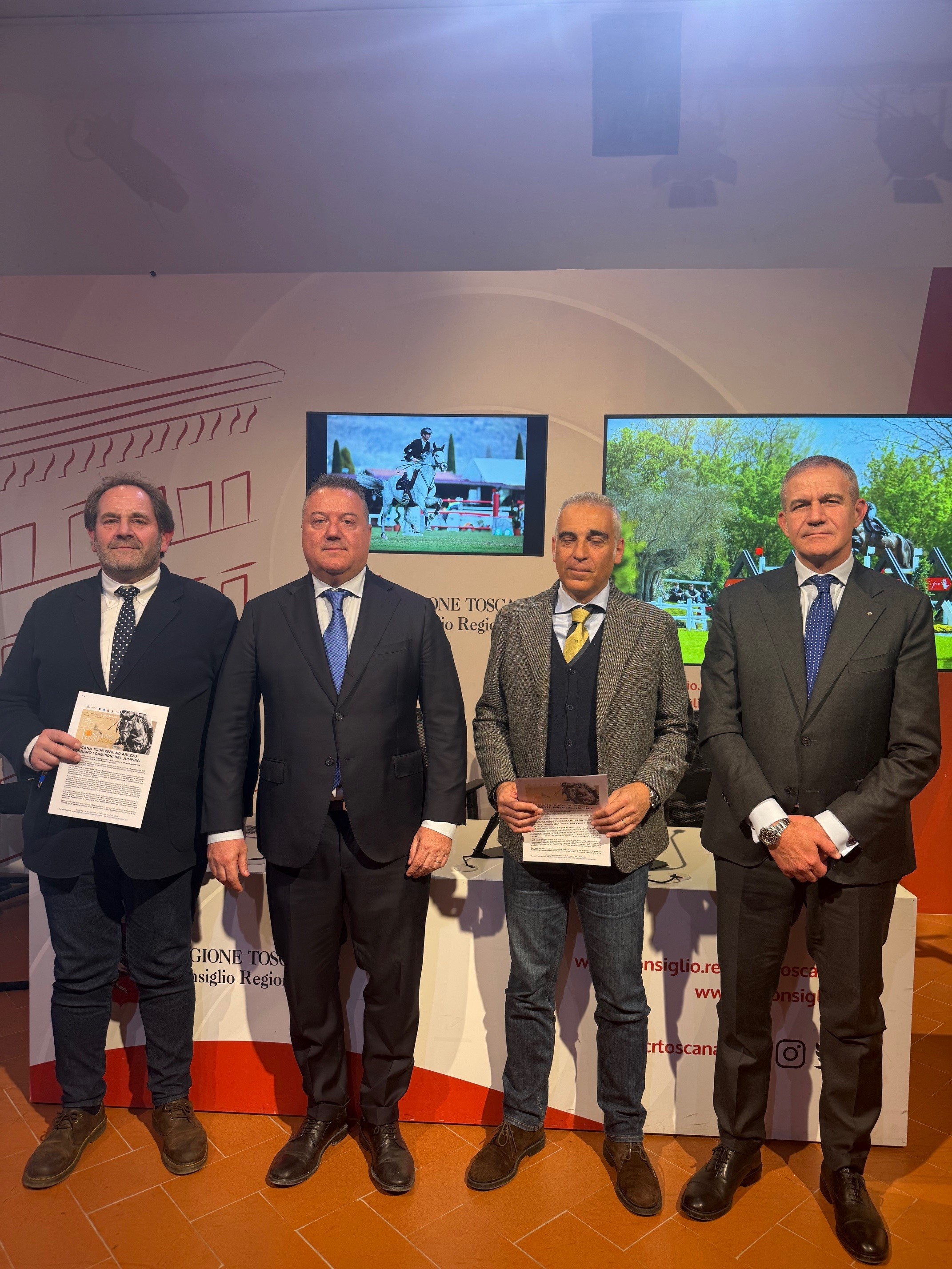 Firenze – Nel Media Center Sassoli di palazzo del Pegaso in una conferenza stampa è stata presentata l’edizione 2026 del Toscana Tour. La manifestazione celebra la ventesima edizione, confermandosi uno degli appuntamenti più importanti del calendario internazionale di salto ostacoli dell’equitazione. Dal 17 marzo al 12 aprile 2026, l’Arezzo Equestrian Centre tornerà così ad essere il cuore pulsante del jumping internazionale con quattro settimane di gare. Sono intervenuti alla conferenza stampa il vicepresidente dell’Assemblea legislativa toscana Diego Petrucci e il consigliere regionale Gabriele Veneri. Era presente Riccardo Boricchi, direttore dell’Arezzo Equestrian Centre e Francesco Macrì presidente Estra spa.